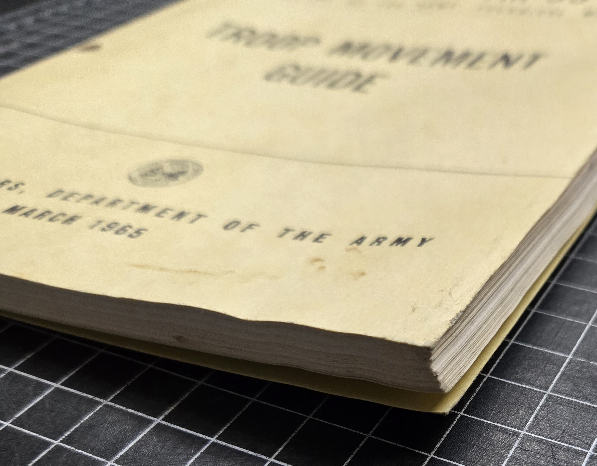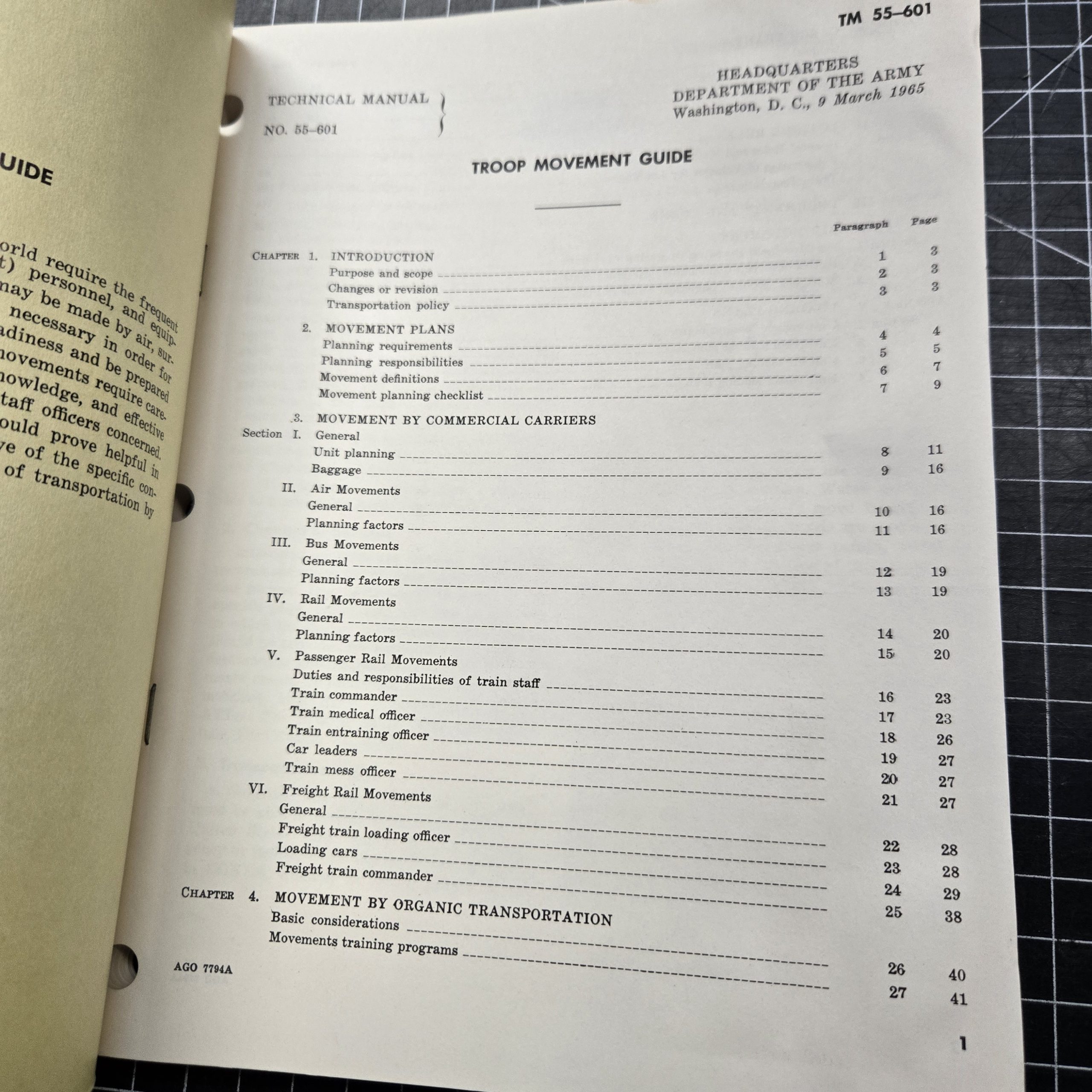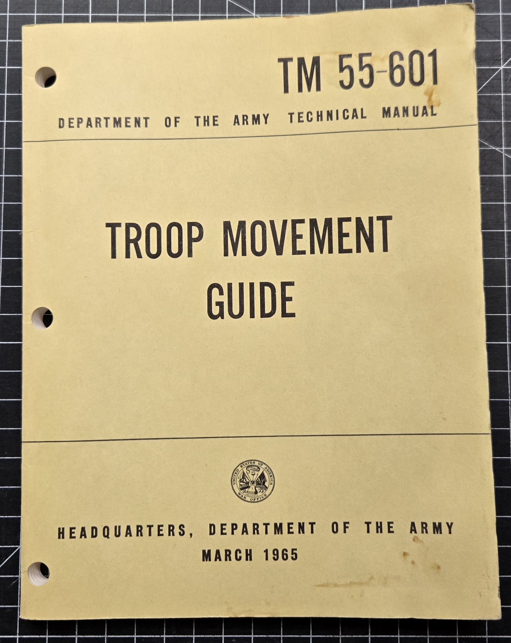 Original Department of the Army Technical Manual TM 55-601, Troop Movement Guide, dated March 1965. Vietnam era issue covering planning and execution of troop transport by air, rail, bus, and organic movement. Loose-leaf, 3-hole punched format as issued for binder use, 167 pages.