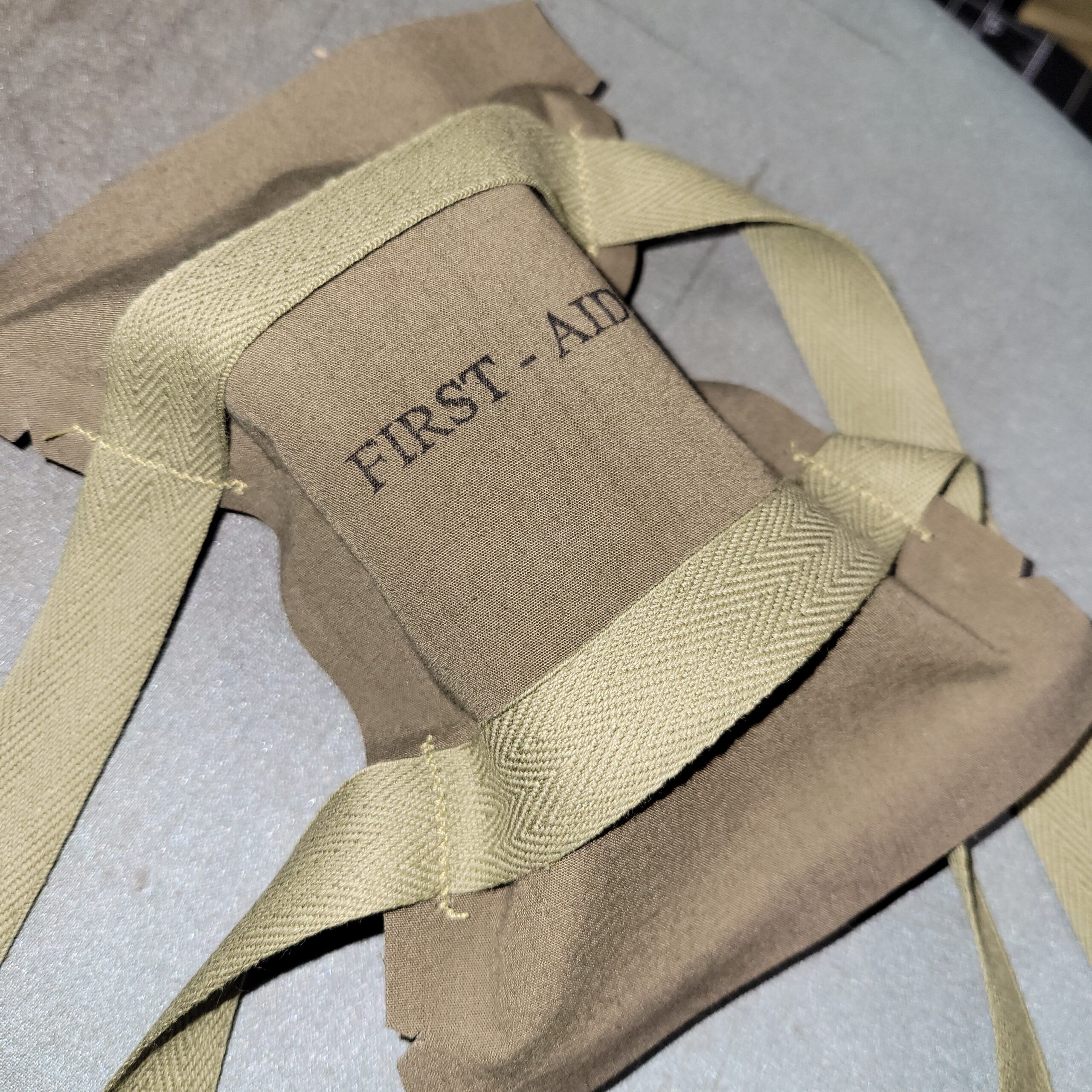 Khaki First-Aid Pouch, Reproduction, Open, Unsealed Khaki First-Aid Pouch, OD First-Aid Pouch, Reproduction