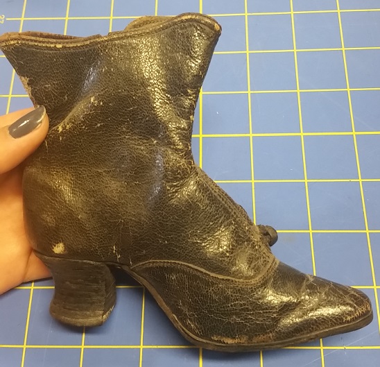 A vintage 1900s child’s shoe. Only one, a right. This is a little shoe, hard to believe any baby could fit in it, but it’s real. Black leather, 5.5″ tall, 1.5″ wide. Funky buttons, rock star heal. This little piece would look pretty good in a display somewhere.