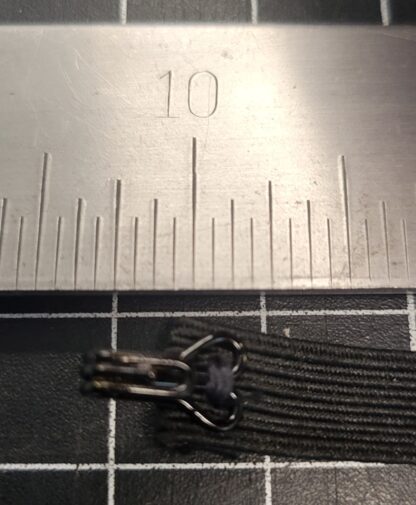 Bands are 3/8″ quality black elastic, with a black metal hook and two loops sewn to either end. Very durable, and with the hook system, easy to take off and put on. These can be used under your WWII paratrooper combat jump suit pants or on your class A trousers for a comfortable nice-looking bloused appearance. Necessary for post WWII impressions too, most soldiers bloused their trousers in Korea and into the 1960s. Approximately 12″ flat length. The first loop is the large size, with an additional loop to make them smaller. Nice sturdy reproduction card for storing the bands when not in use and they look good in a footlocker!