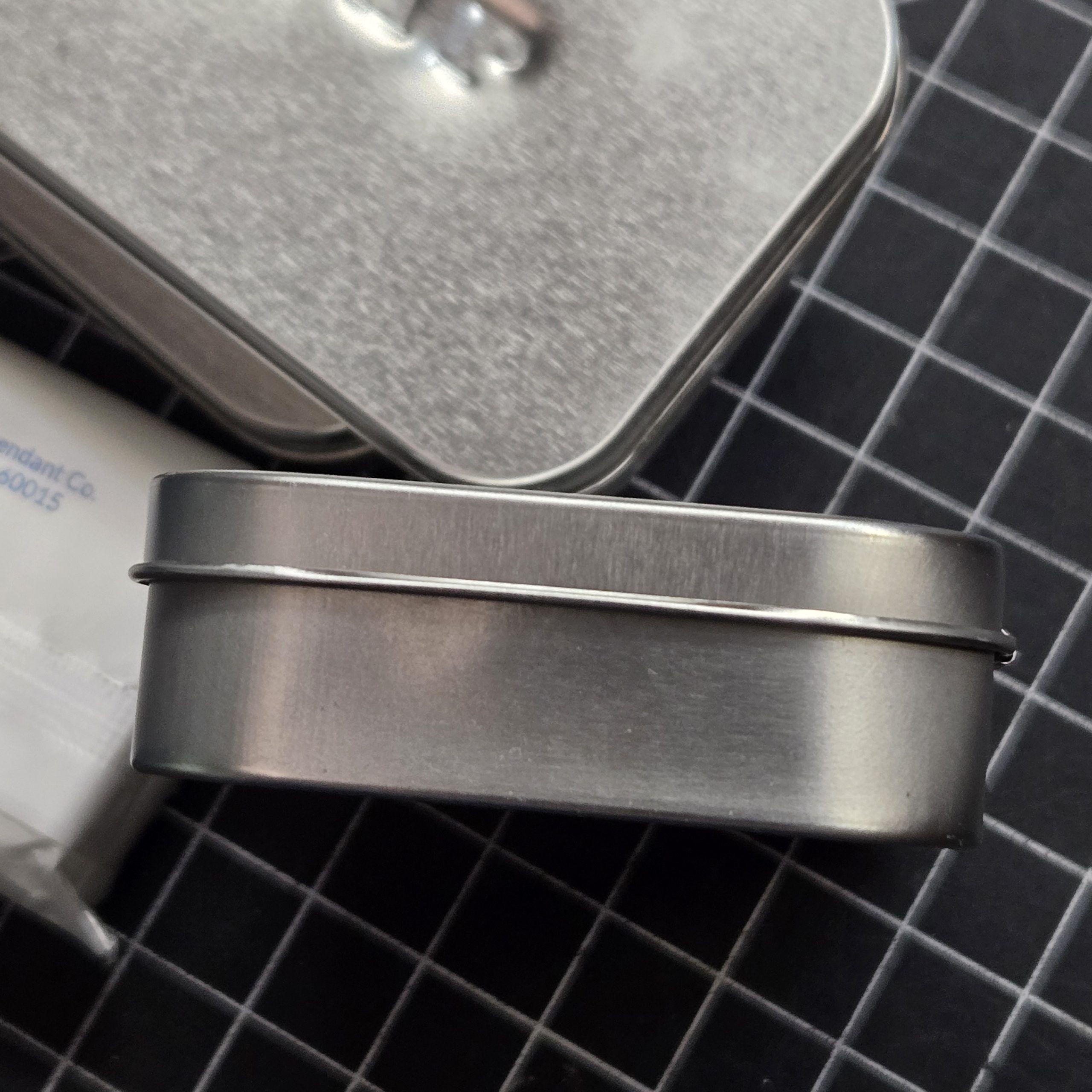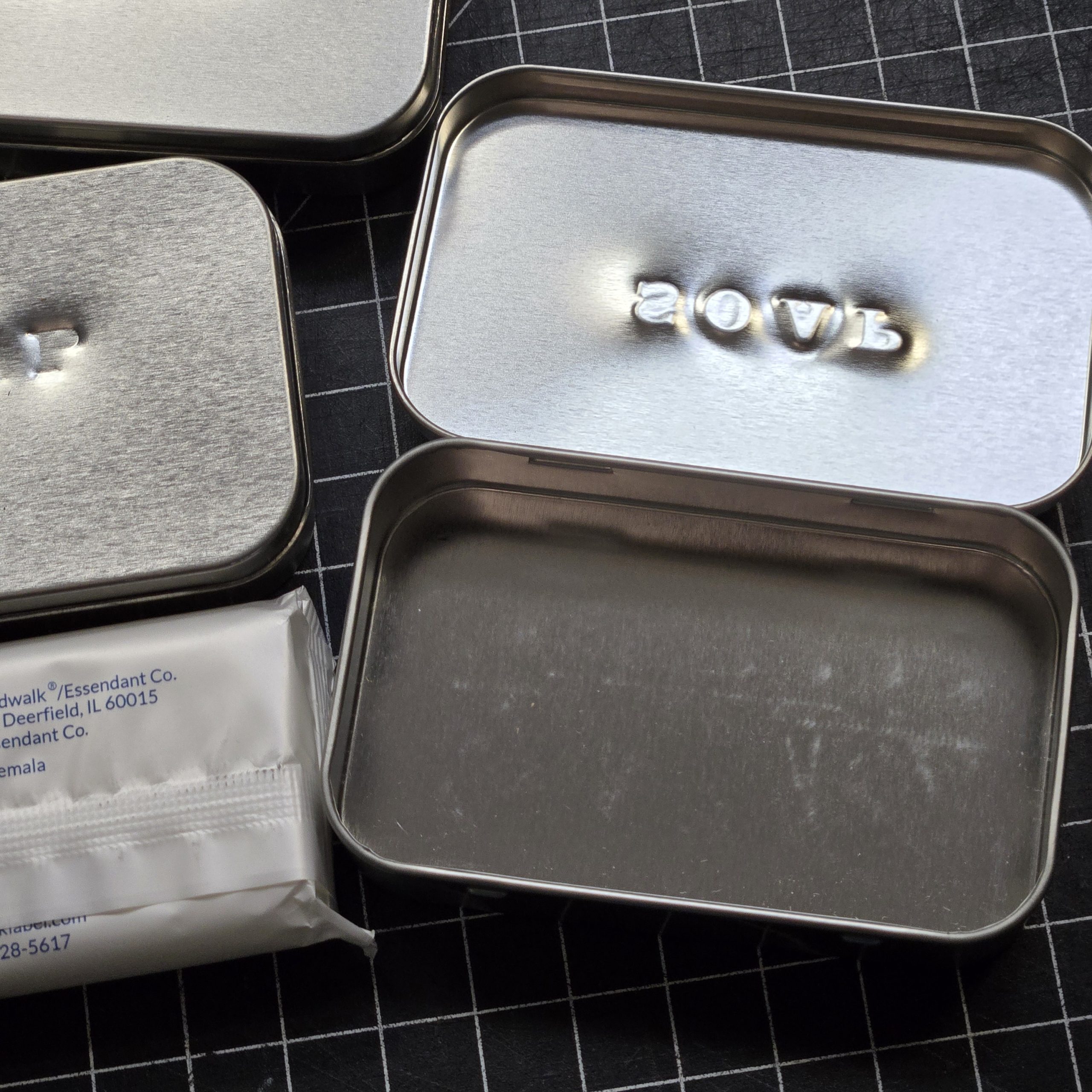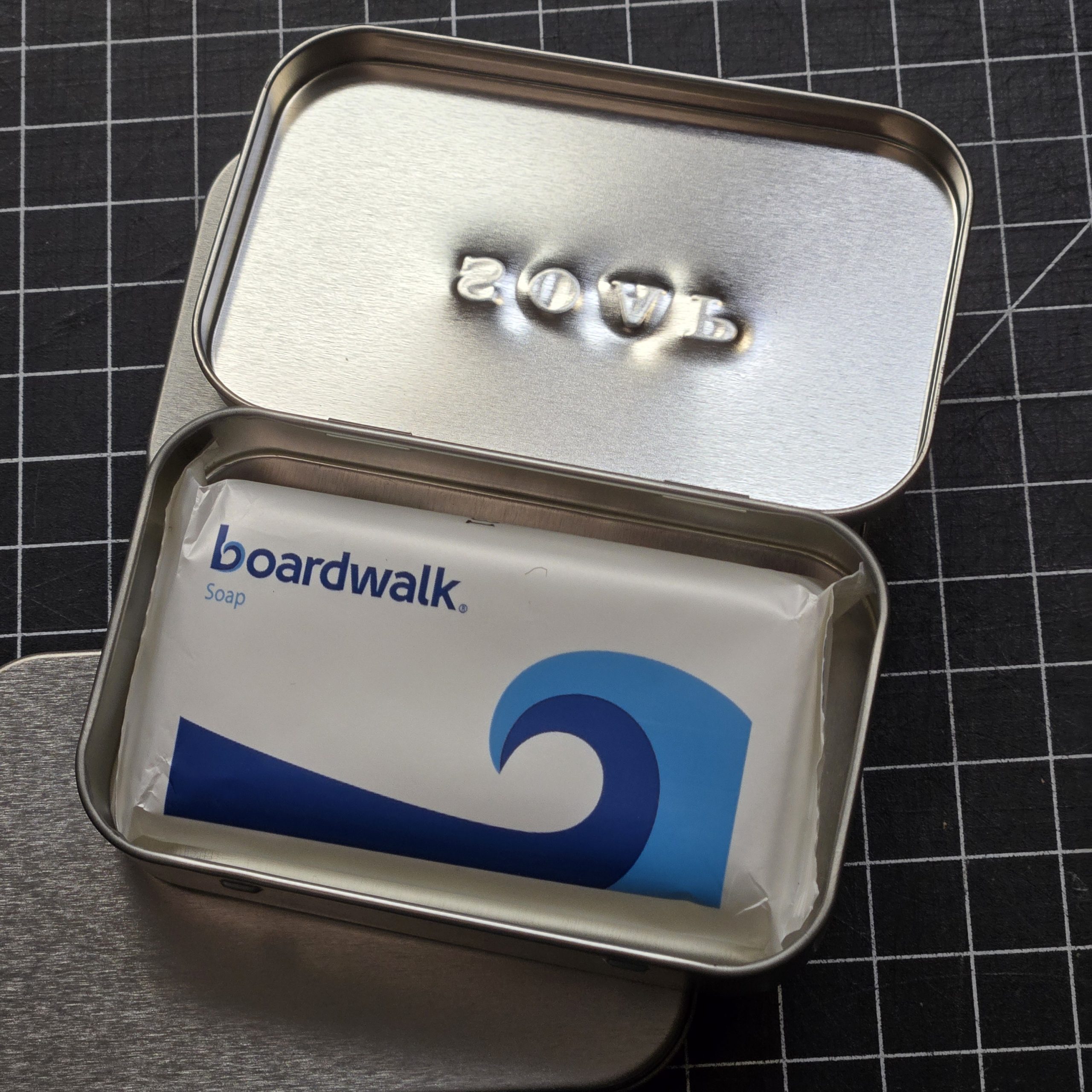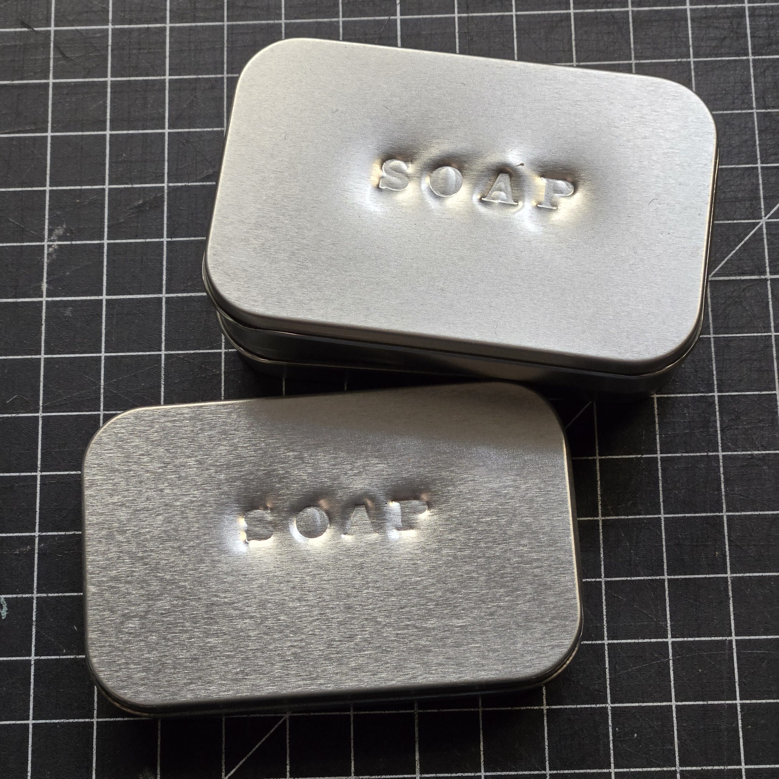 Soap Tin, Reproduction. We take brand new tins, and hand stamp “SOAP” across the front. Pretty Simple. Add some soap and you have a period-looking tin suitable for the WWII field or barracks kit. Better than a farby bar of yellow dial sitting on the counter at a reenactment. Until someone makes a reproduction of an actual WWII soap tin, this is way better than nothing. In case your wondering, the exact measurements of the tins are 3-3/4″ x 2-3/8″ x 13/16″, which is the same as an Altoids Mints container, but these are all new containers. Soap brand a type will vary from the pictures from time to time, but it’s still good clean soap. Get it, clean soap? Yeah, I need to clean up the jokes.