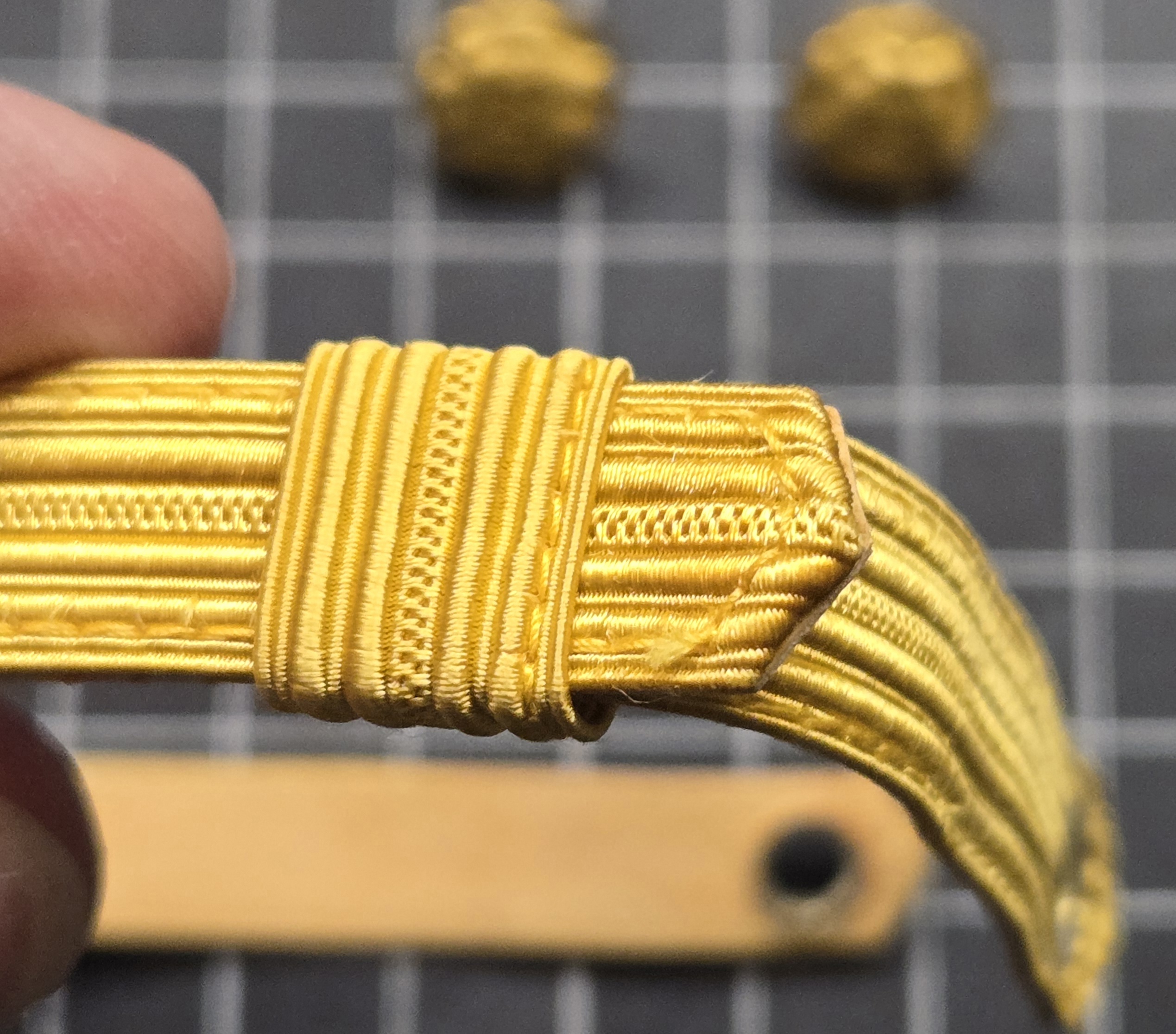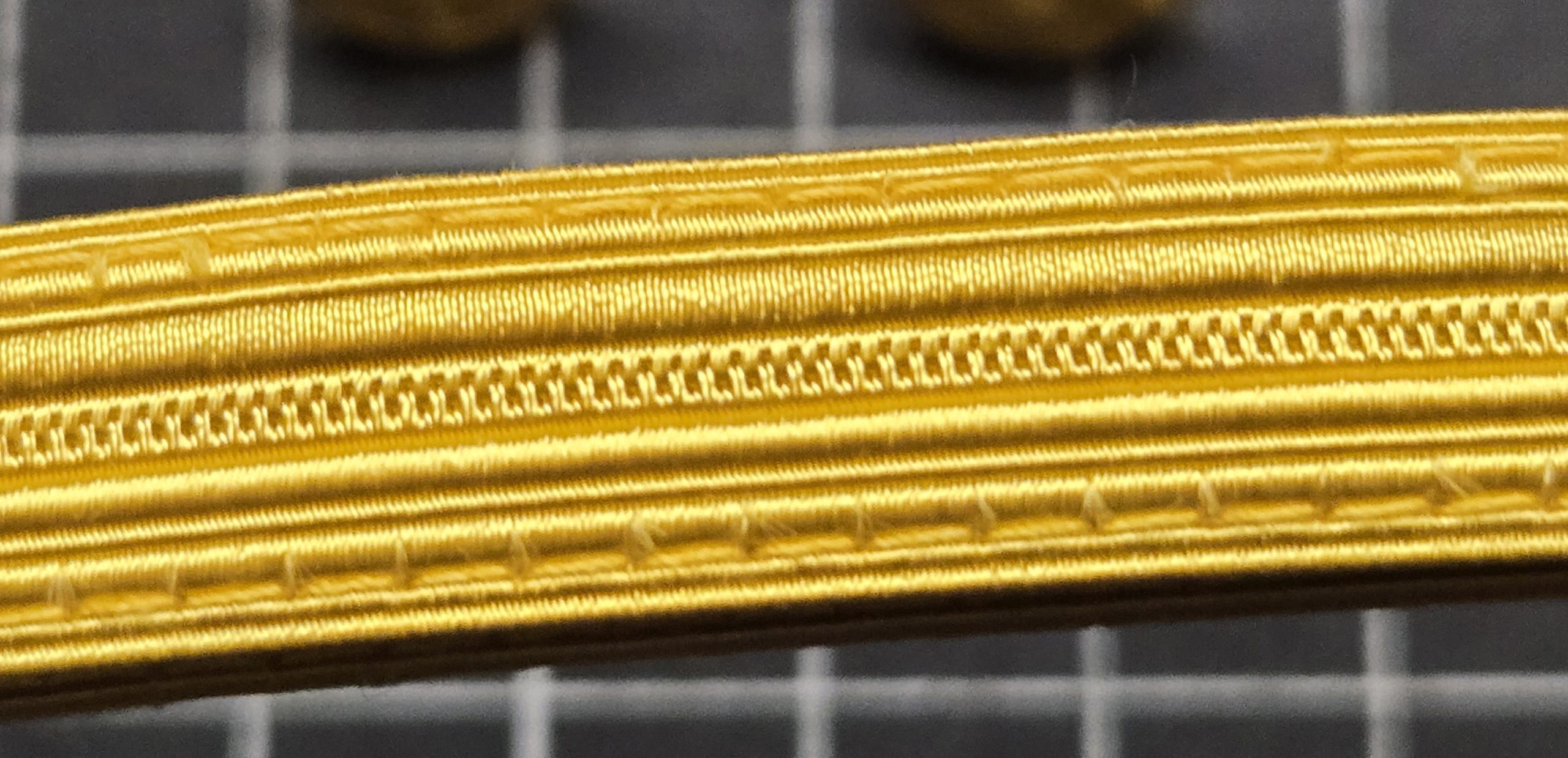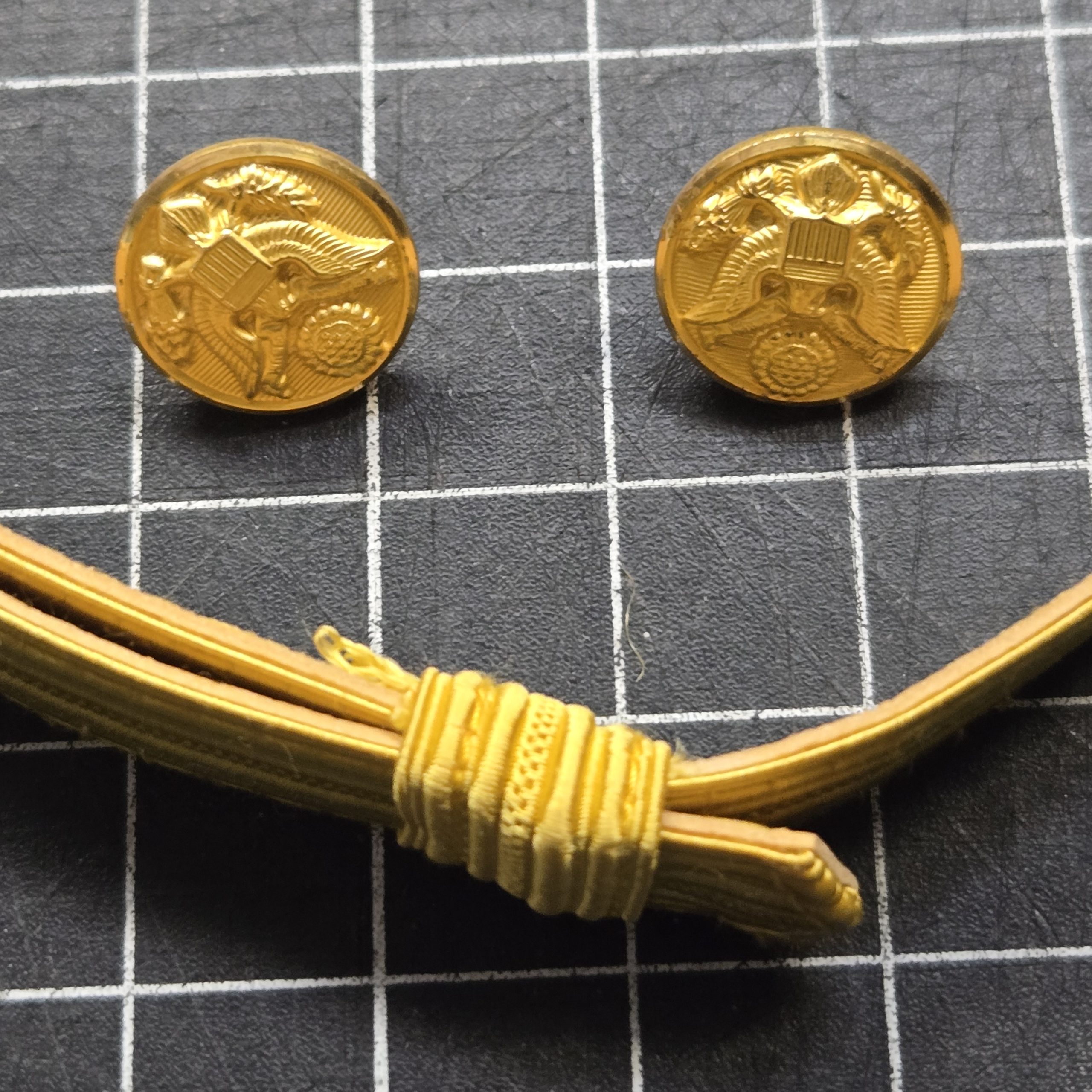 U.S. Army officer’s service cap chin strap in gold braid with screw-back attachment buttons, intended for mounting to a dress or service cap visor, showing light wear but solid condition and fully functional as a replacement or upgrade piece, typical of officer-grade caps from roughly the 1960s through 1990s and suitable for restoration, display, or reenacting where a proper gold braided strap is needed.