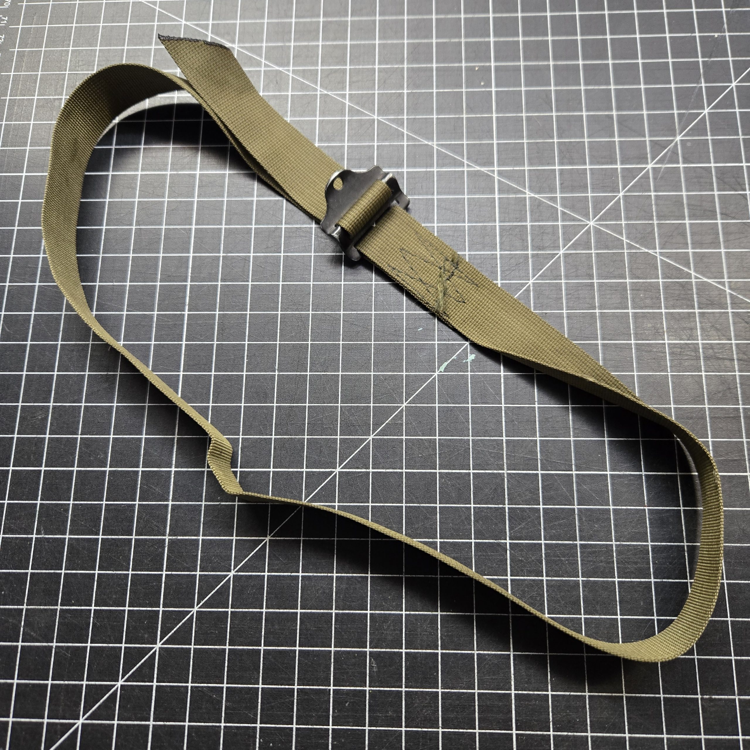 Original U.S. military web strap, Vietnam era, OD nylon webbing with blackened steel friction buckle. Measures approximately 34 inches overall with about 30 inches usable length. Shows light field use with minor wear at the stitching, but remains fully functional with solid hardware and no major damage. A versatile piece commonly used for securing gear, packs, or field equipment.