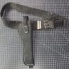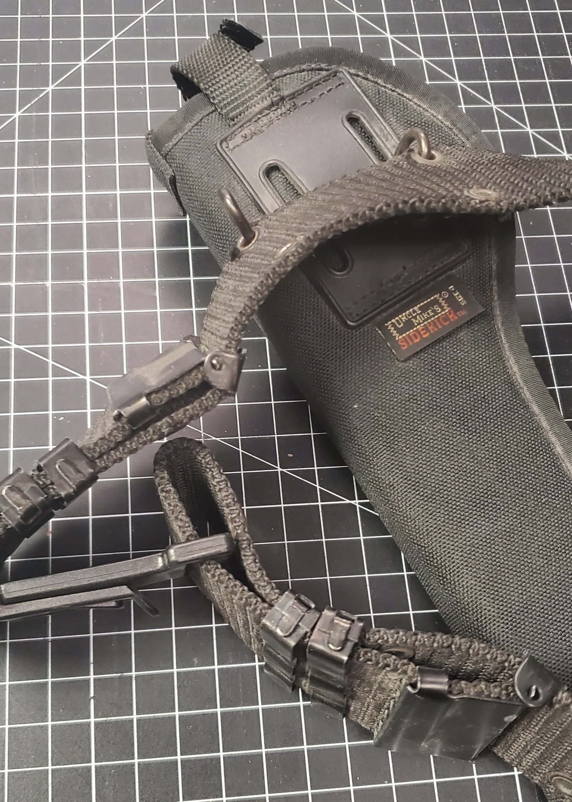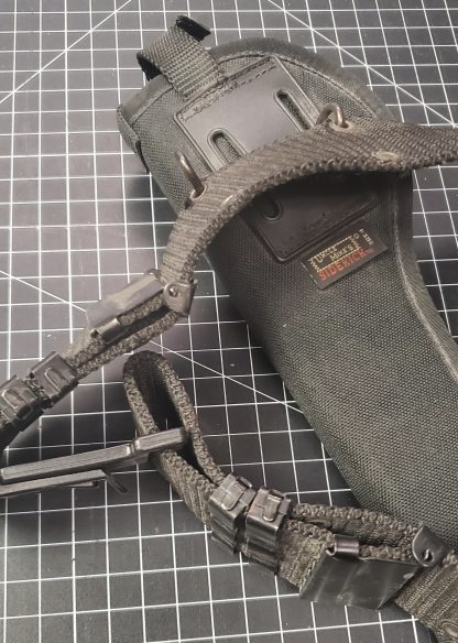 Uncle Mike’s brand fabric holster. Marked Size 4. This is for a long revolver, see the ruler against it in the photo. Comes with a black military style web belt. All a little dusty, but in very good condition. Clean, just dust. Nice addition and priced right.