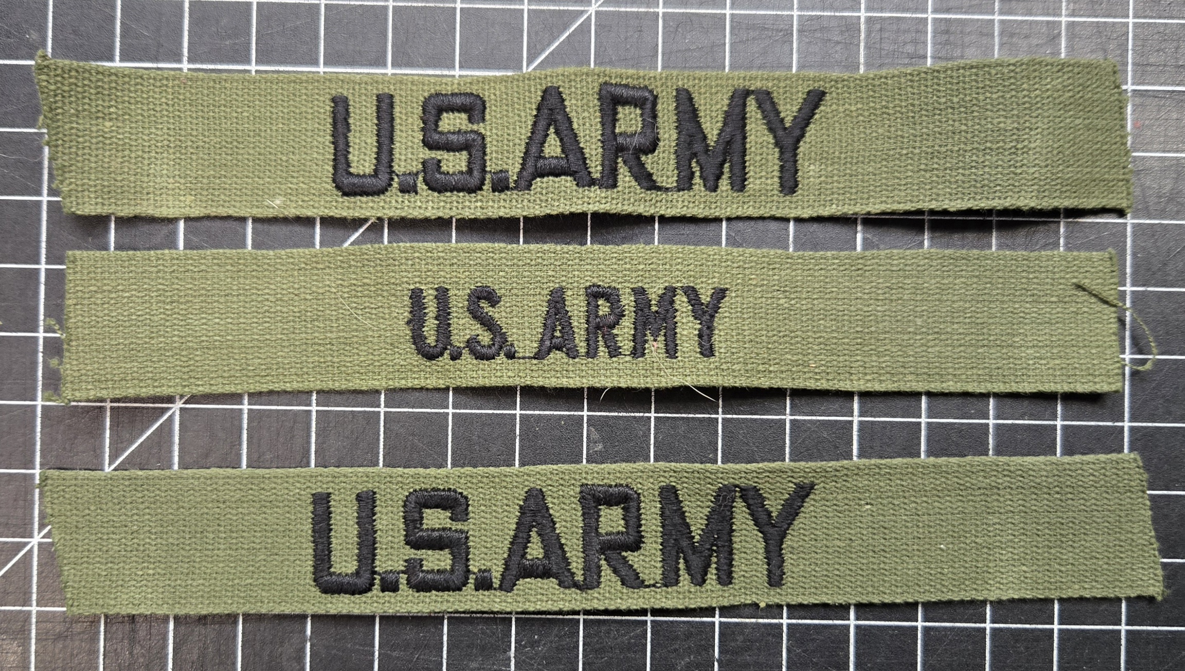These are US Army branch tape name tabs, each 1 inch tall, in olive drab cloth with black embroidered lettering. They are the sew-on type used on fatigues, field jackets, and later BDU uniforms from the Vietnam era through the 1980s and into the early 1990s, before the switch to subdued tapes on camouflage backgrounds. The variations in font and thread thickness between the three suggest different production runs or manufacturers—something fairly common since multiple contractors made these to Army specs. Collectors sometimes seek out these differences to match a particular uniform’s period or style. In good condition like these, they’re fully usable for restoration or reenactment purposes.
