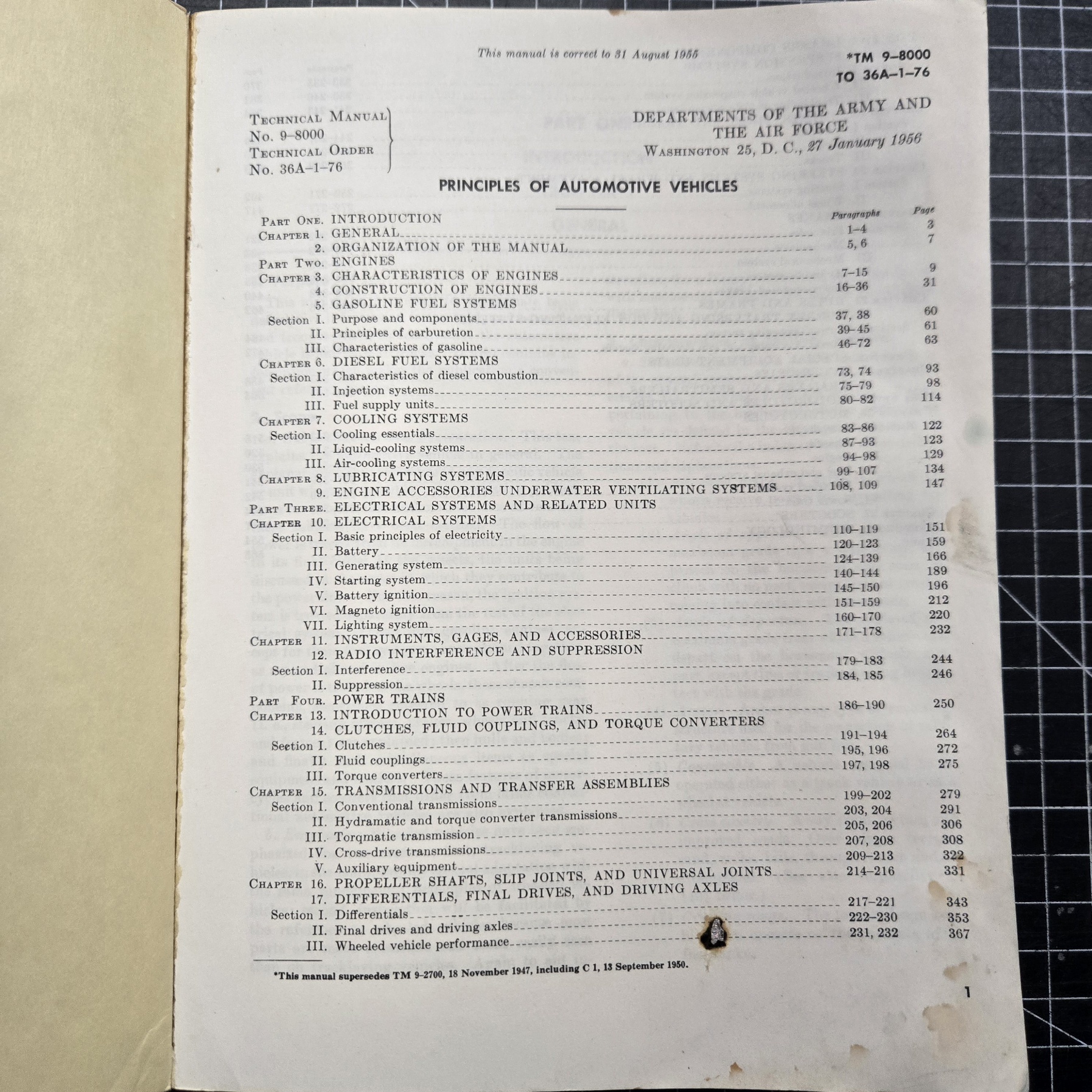Original Department of the Army and Department of the Air Force technical manual TM 9-8000 / TO 36A-1-76 titled Principles of Automotive Vehicles, dated January 1956. This is a substantial and comprehensive reference manual at 573 pages, covering a wide range of military vehicle systems including engines, fuel systems, electrical systems, transmissions, brakes, suspension, and more. A foundational training and reference book used across Army and Air Force vehicle maintenance and instruction. Condition is used with clear signs of age and service- over 70 years old now! The cover shows staining, spotting, and edge wear, and there is visible discoloration along the right edge. Interior pages are generally intact and readable, though there is a small burn or solder mark present on an early page near the index, along with typical handling wear and toning throughout. Binding remains solid for its size. A solid Cold War era technical reference and an excellent addition for military vehicle collectors, restorers, or anyone interested in period mechanical manuals. Also displays well as a large-format piece of original Army/Air Force documentation.