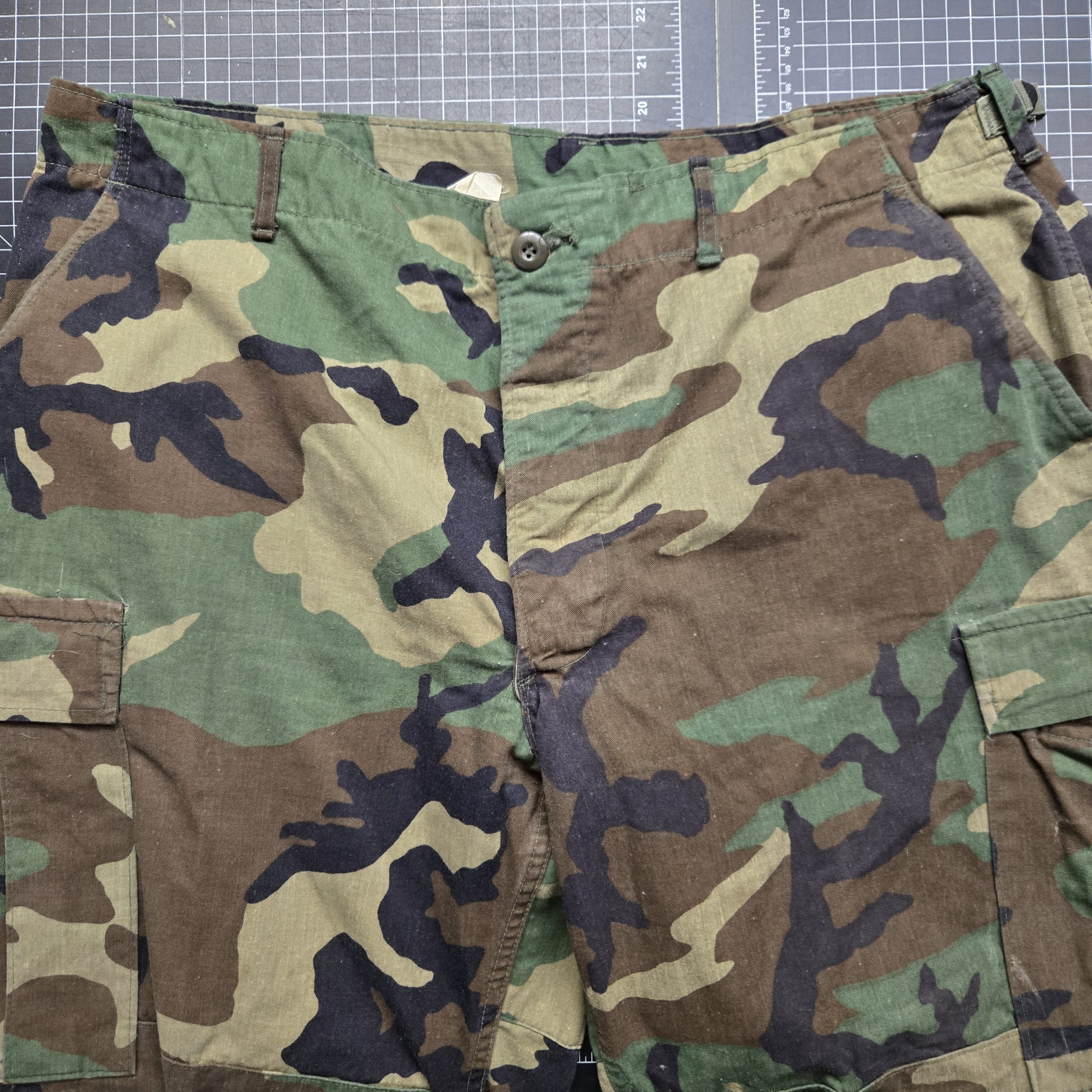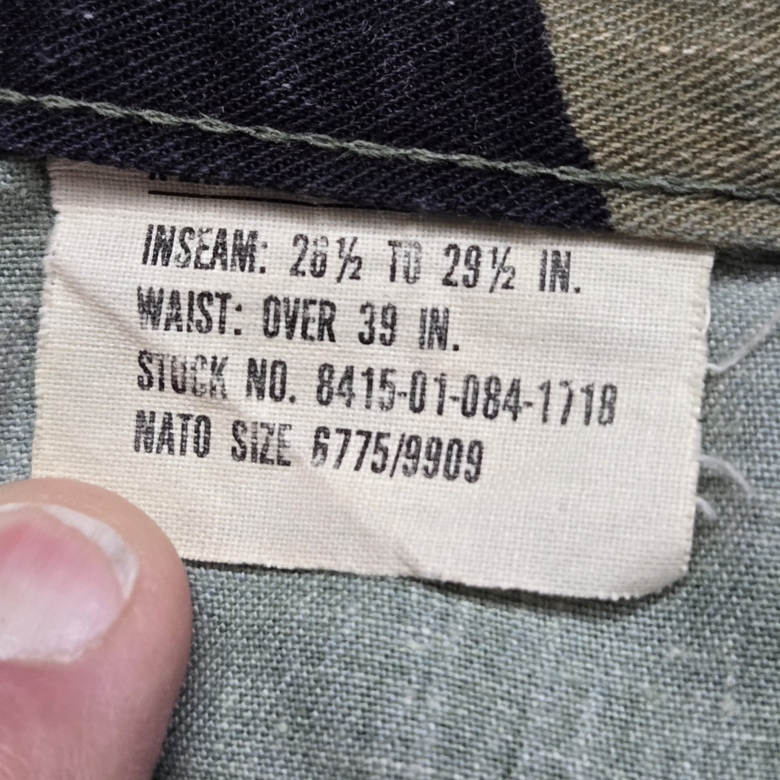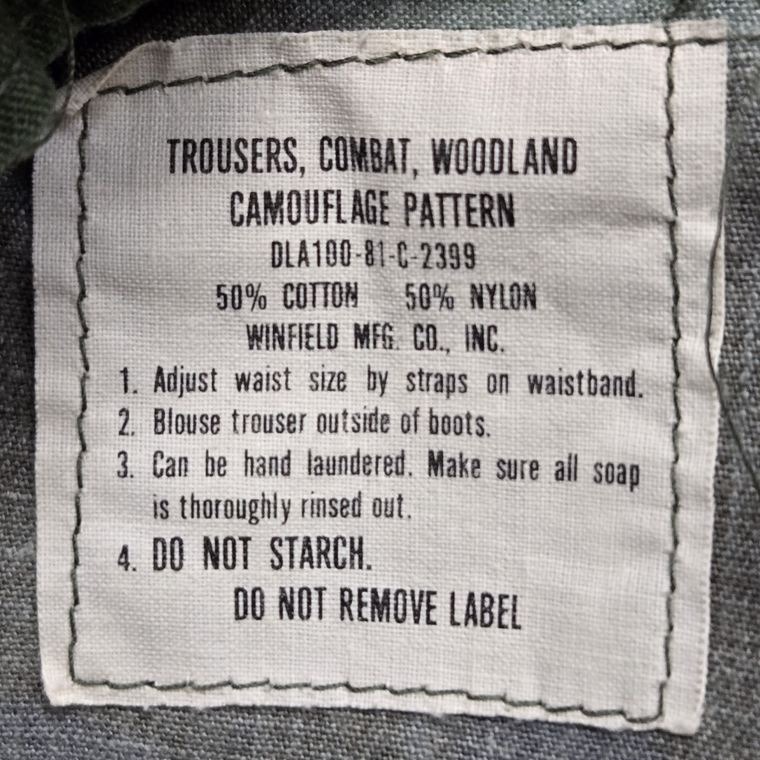 Original US Army woodland camouflage combat trousers in very good used condition, clean overall with no major blemishes noted, just typical light wear from use and could benefit from a pressing if desired. Tag shows DLA100-81 contract with 50/50 cotton nylon blend by Winfield Mfg., with sizing listed as inseam 26½ to 29½ inches and waist over 39 inches (NATO size 6775/9909), putting these in a larger size range. All labels are intact and legible, and the pants present well for wear, collecting, or display. Solid example of classic woodland camo gear that works for field use, reenacting, or as part of a larger kit.