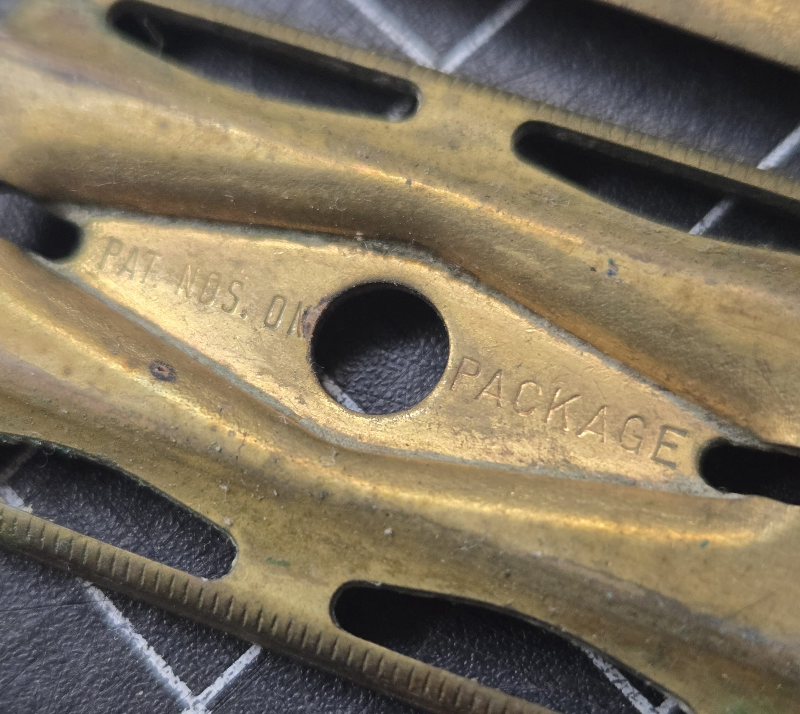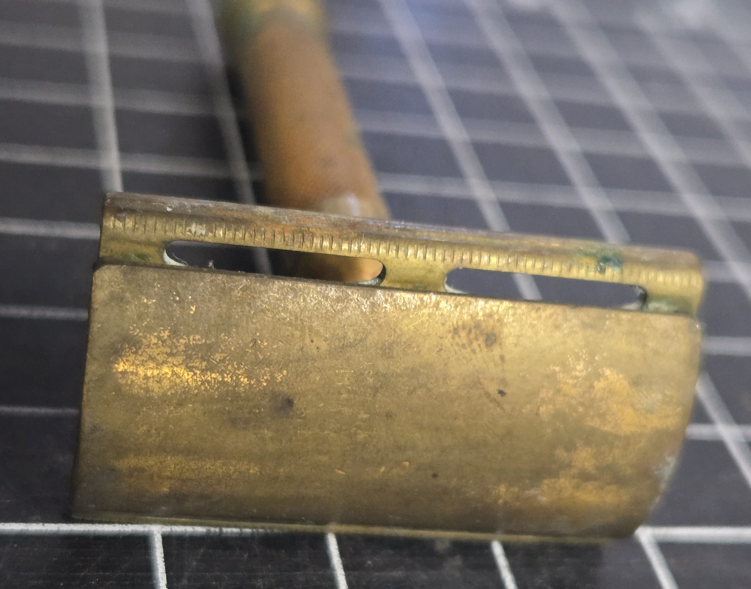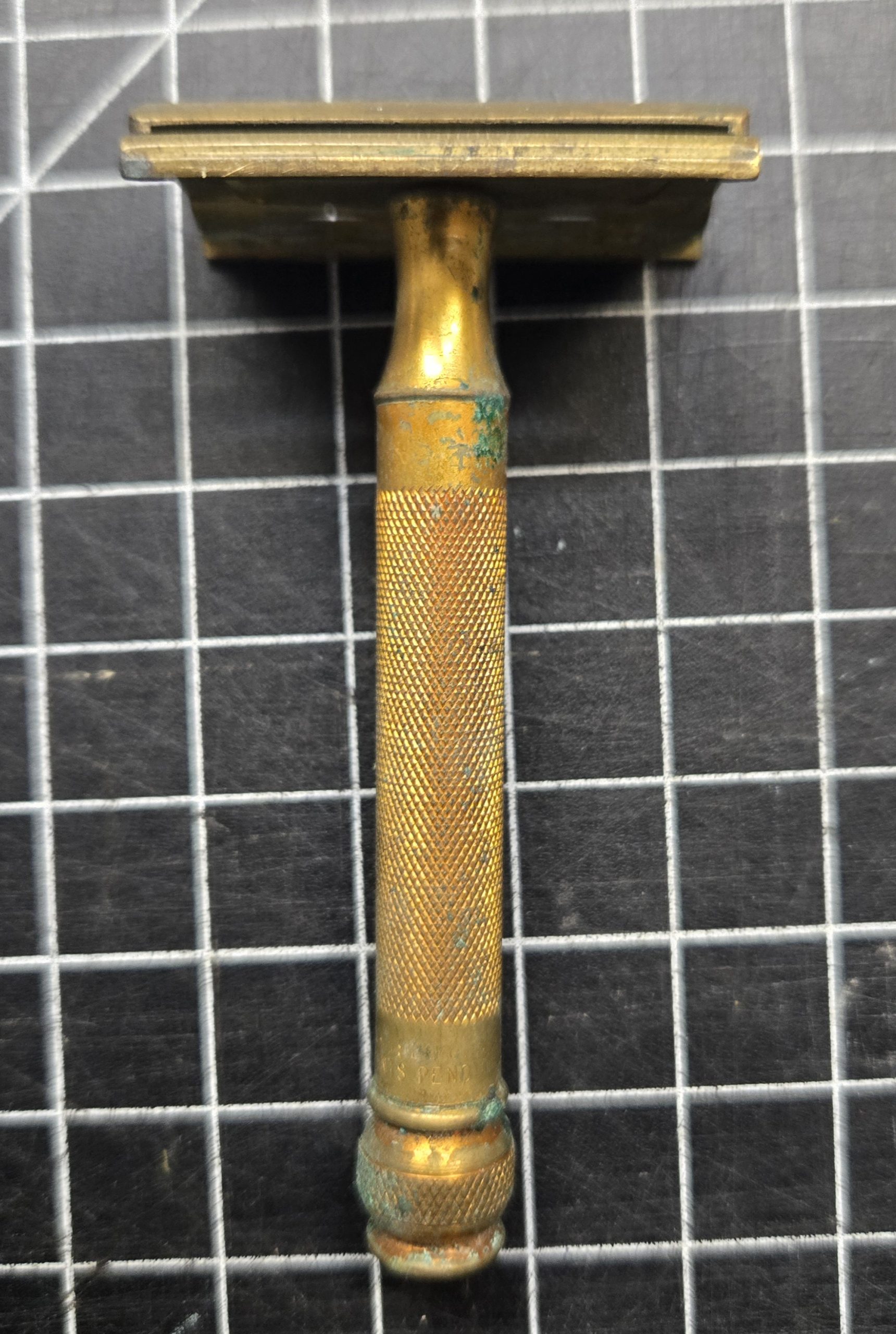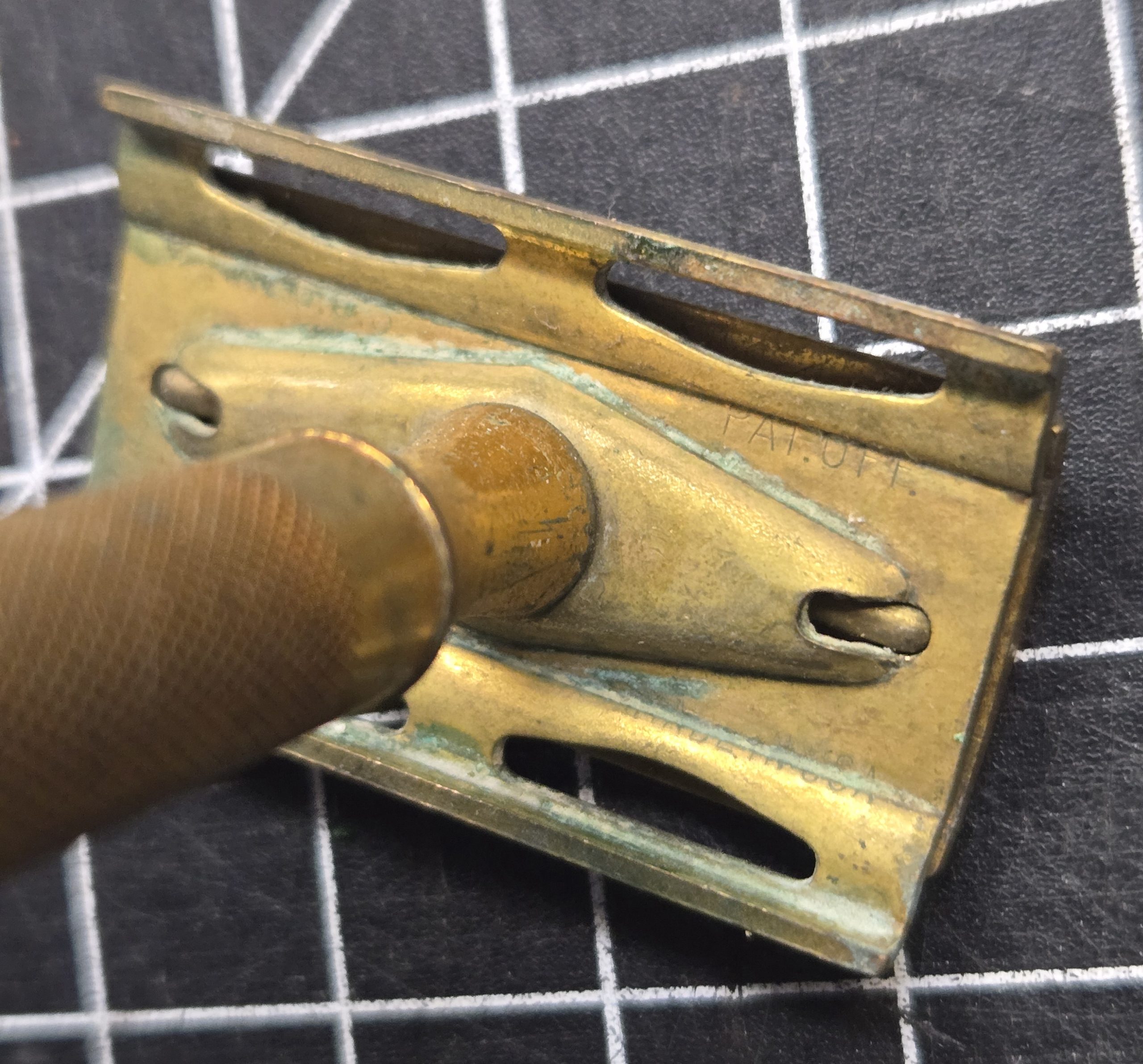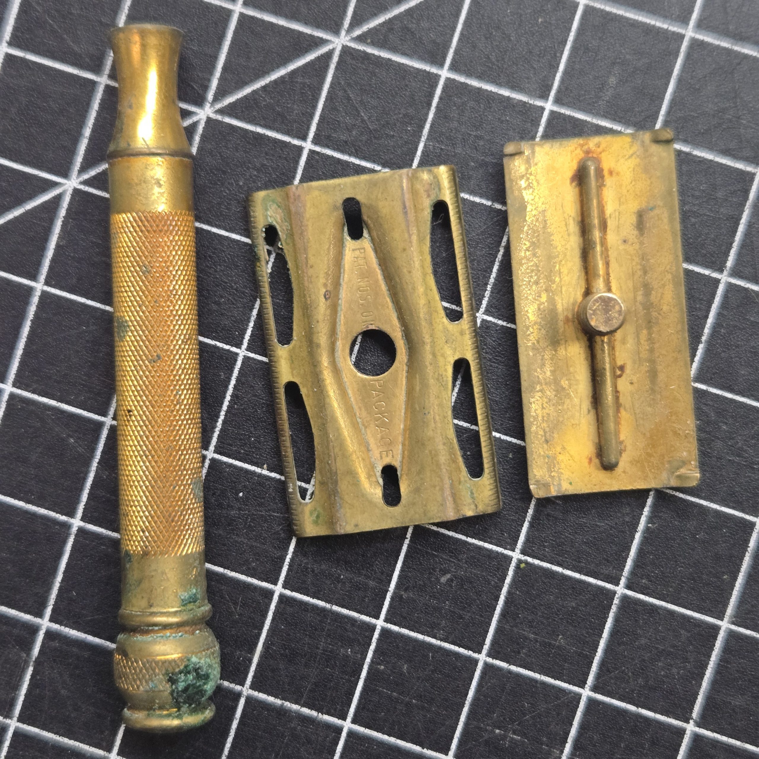 Solid 1930s–40s era double edge safety razor in brass, marked “Pat. Off.” and “Package.” This is the classic style that turns up in period shaving kits and fits perfectly with reproduction sets like those from Service of Supply. All parts are present and the razor is fully functional. It shows age as expected, with original tarnish and light corrosion from long storage, but nothing structural. A careful polish would bring it back nicely, or it can be left as-is for an honest, untouched look. A good usable example or a strong addition to a WWII-era display. No razor blades come with it, these double edge blades can still be purchased at drug stores and online.