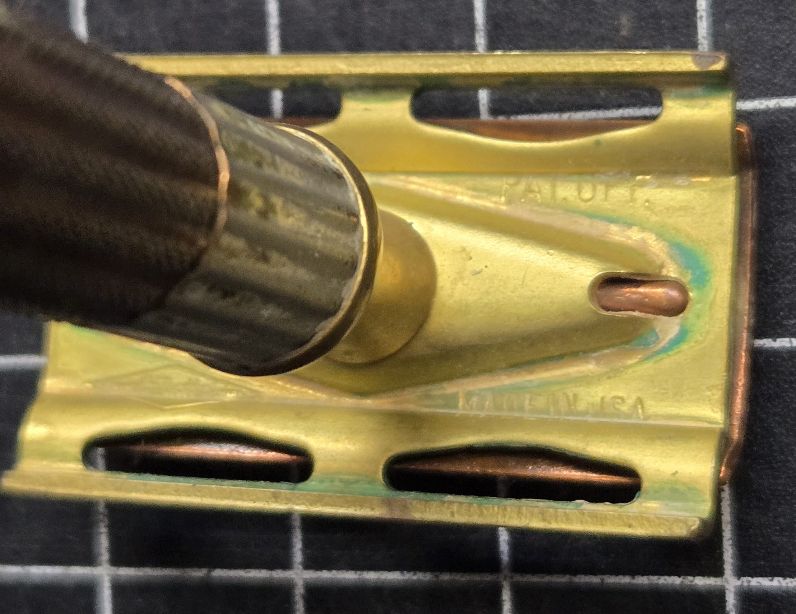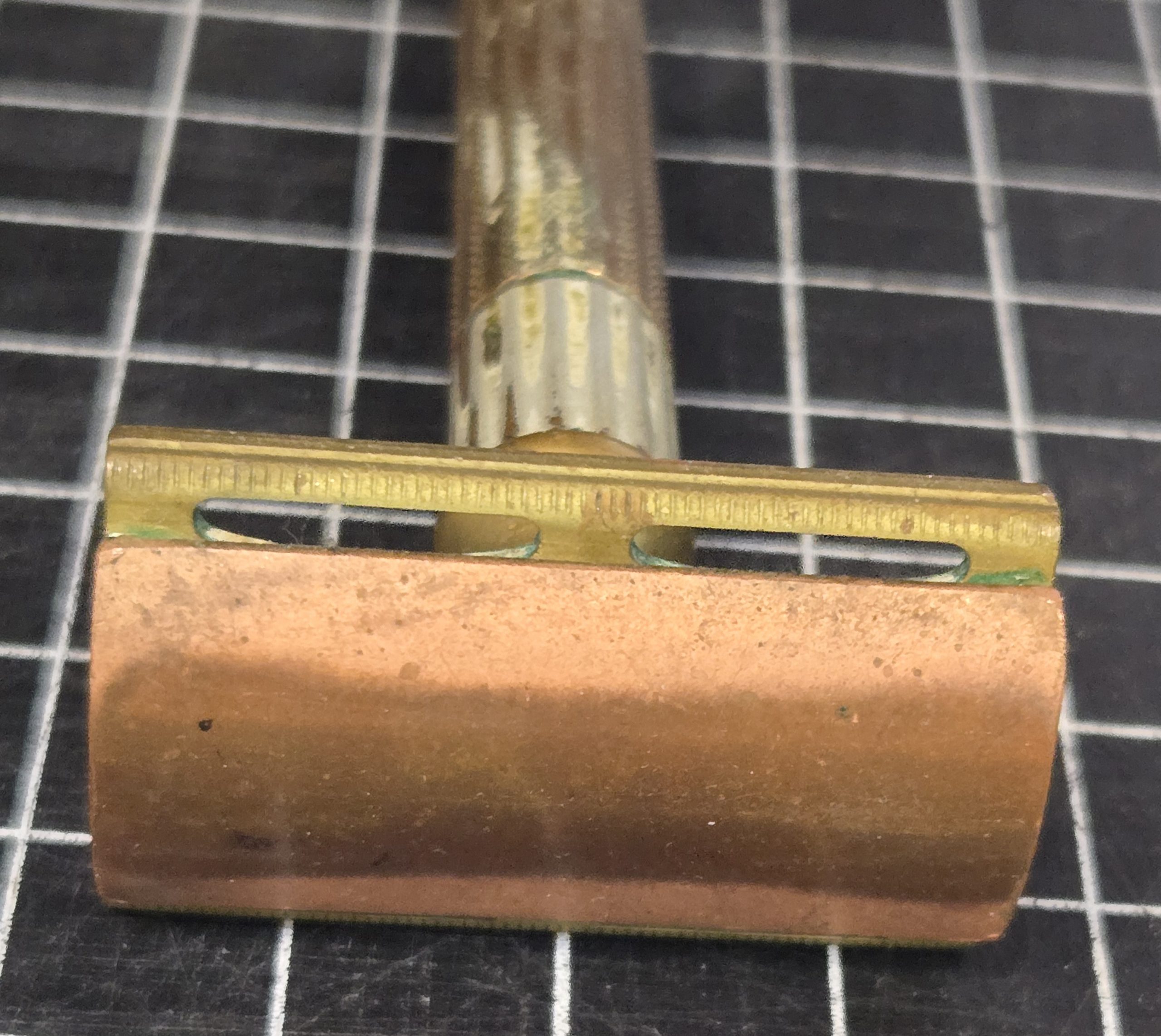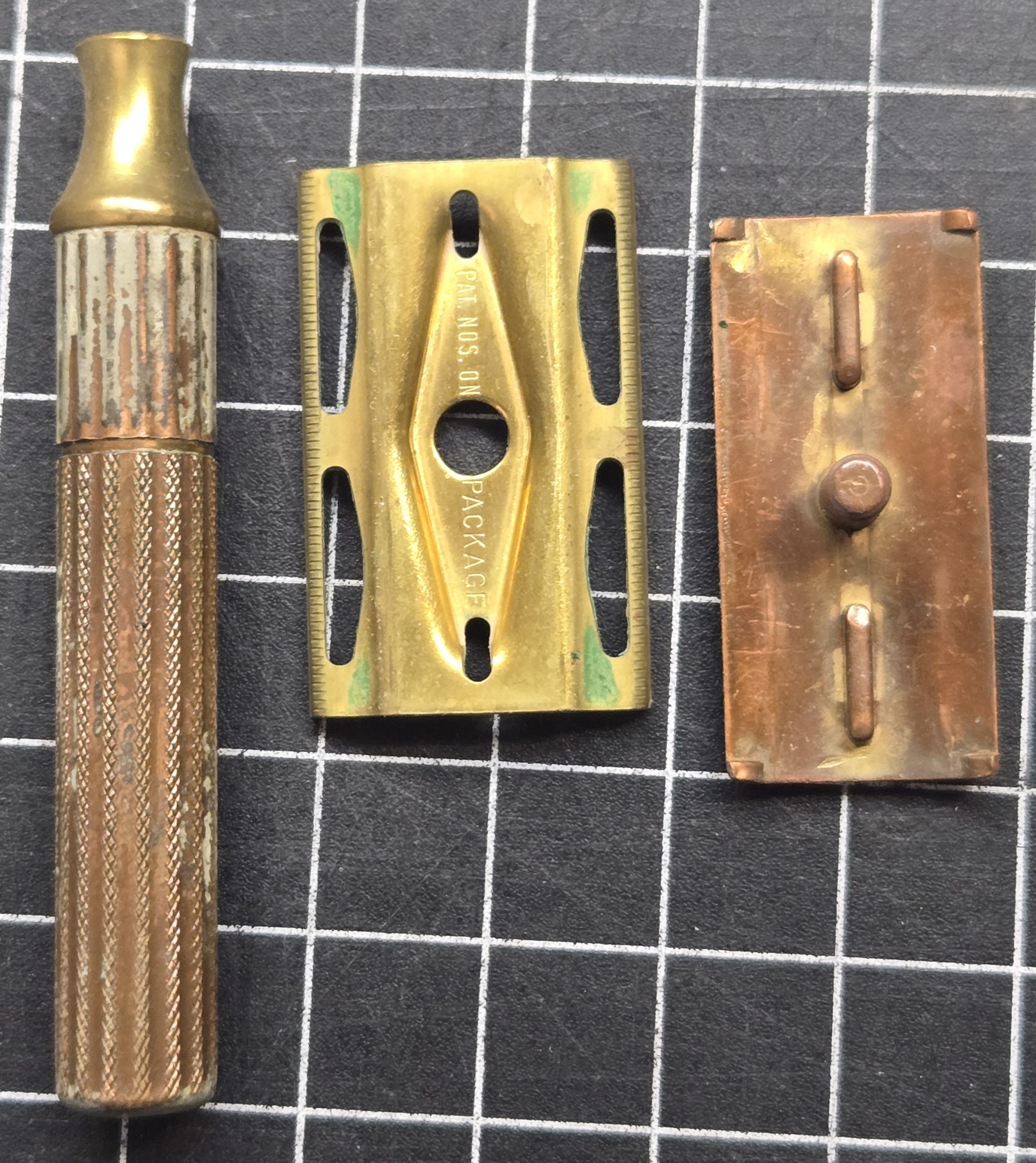 Well-used but fully functional double edge safety razor dating to the 1930s–1940s period. Solid brass construction with a classic three-piece design, this is the type commonly carried in WWII-era shaving kits. This example shows honest service wear, with areas of plating loss and visible copper tone coming through, along with age patina consistent with long use. Despite that, it remains mechanically sound, threads cleanly, and tightens properly with all components present. A good, practical piece for someone putting together a period-correct kit or looking for a razor that has the right look and feel of something that has actually seen use. For scale, each grid square in the photos measures 1/2 inch.