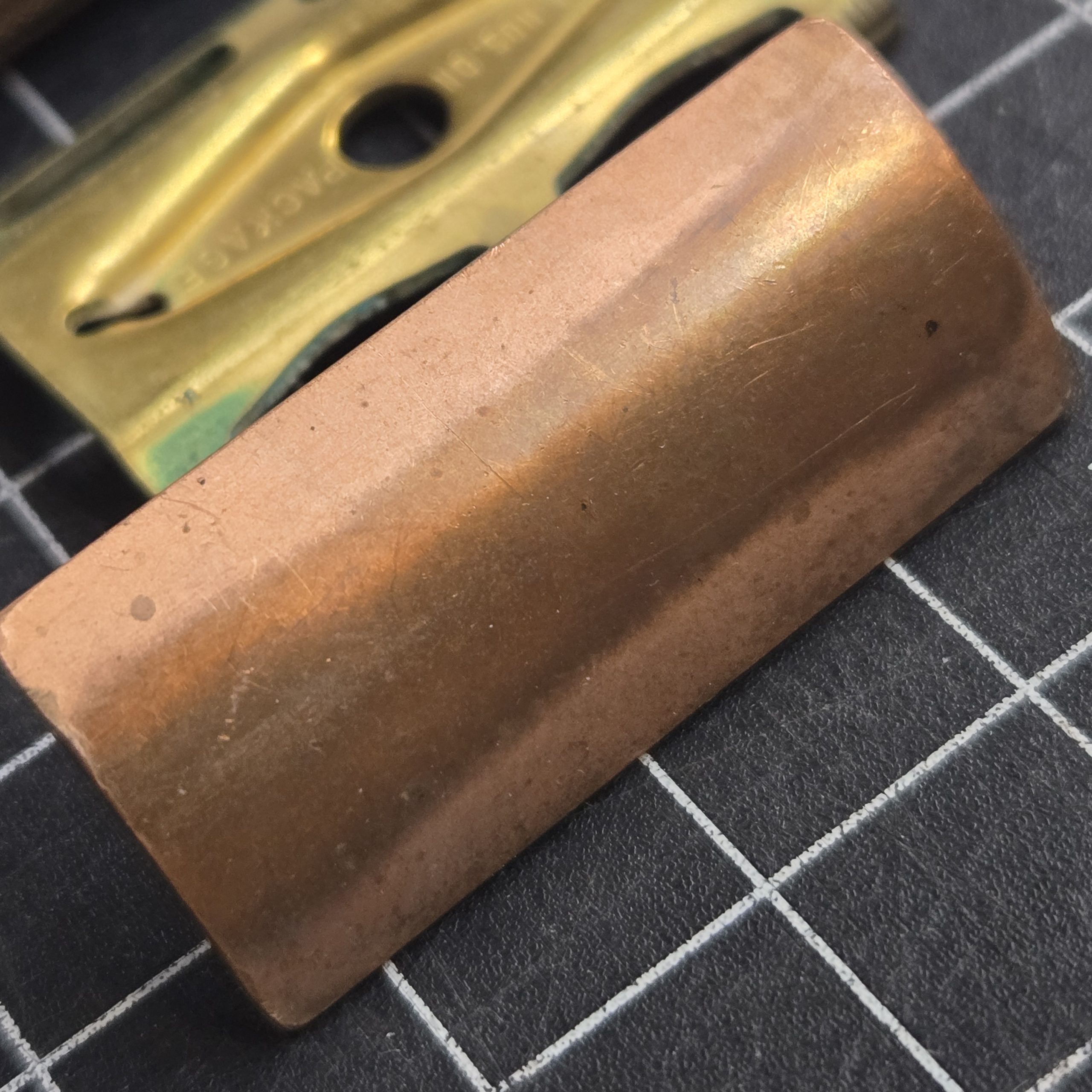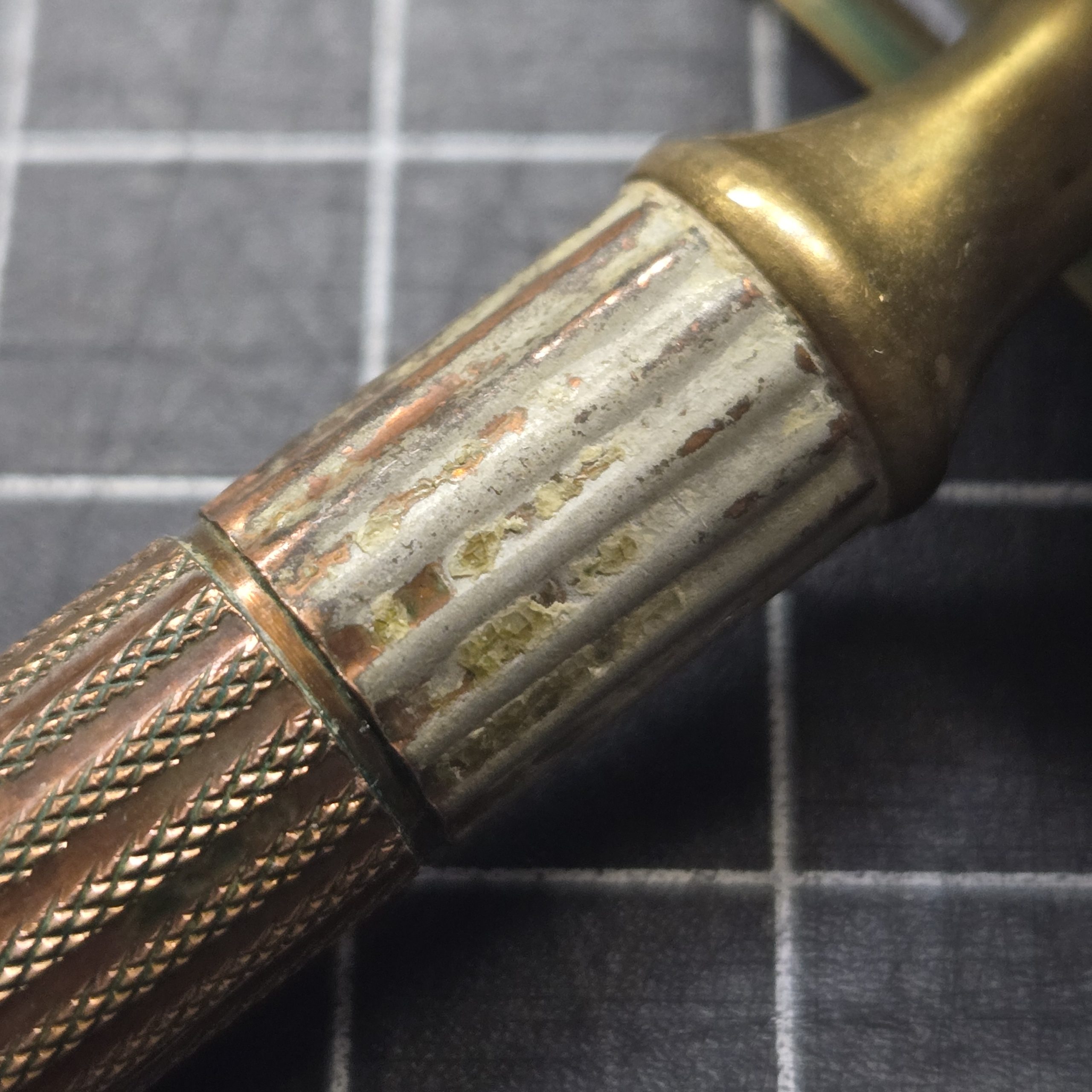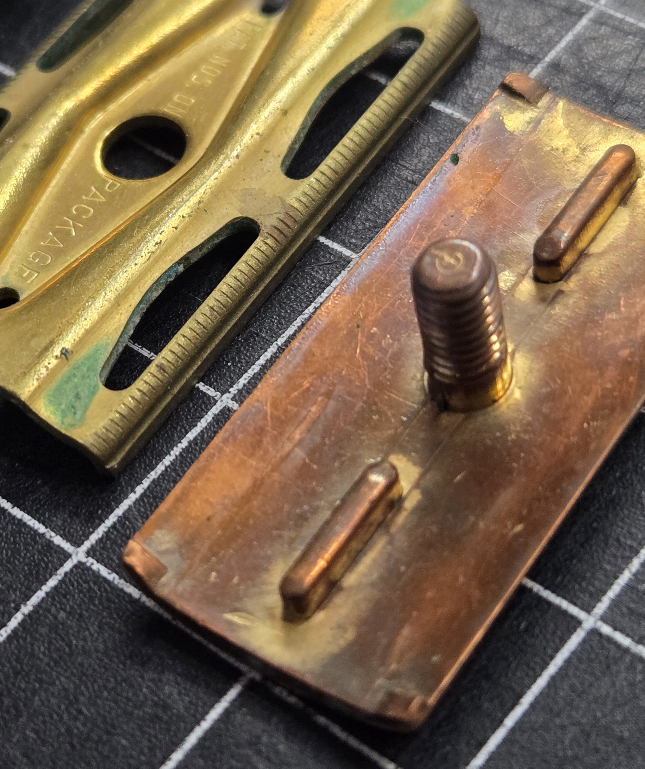 Well-used but fully functional double edge safety razor dating to the 1930s–1940s period. Solid brass construction with a classic three-piece design, this is the type commonly carried in WWII-era shaving kits. This example shows honest service wear, with areas of plating loss and visible copper tone coming through, along with age patina consistent with long use. Despite that, it remains mechanically sound, threads cleanly, and tightens properly with all components present. A good, practical piece for someone putting together a period-correct kit or looking for a razor that has the right look and feel of something that has actually seen use. For scale, each grid square in the photos measures 1/2 inch.