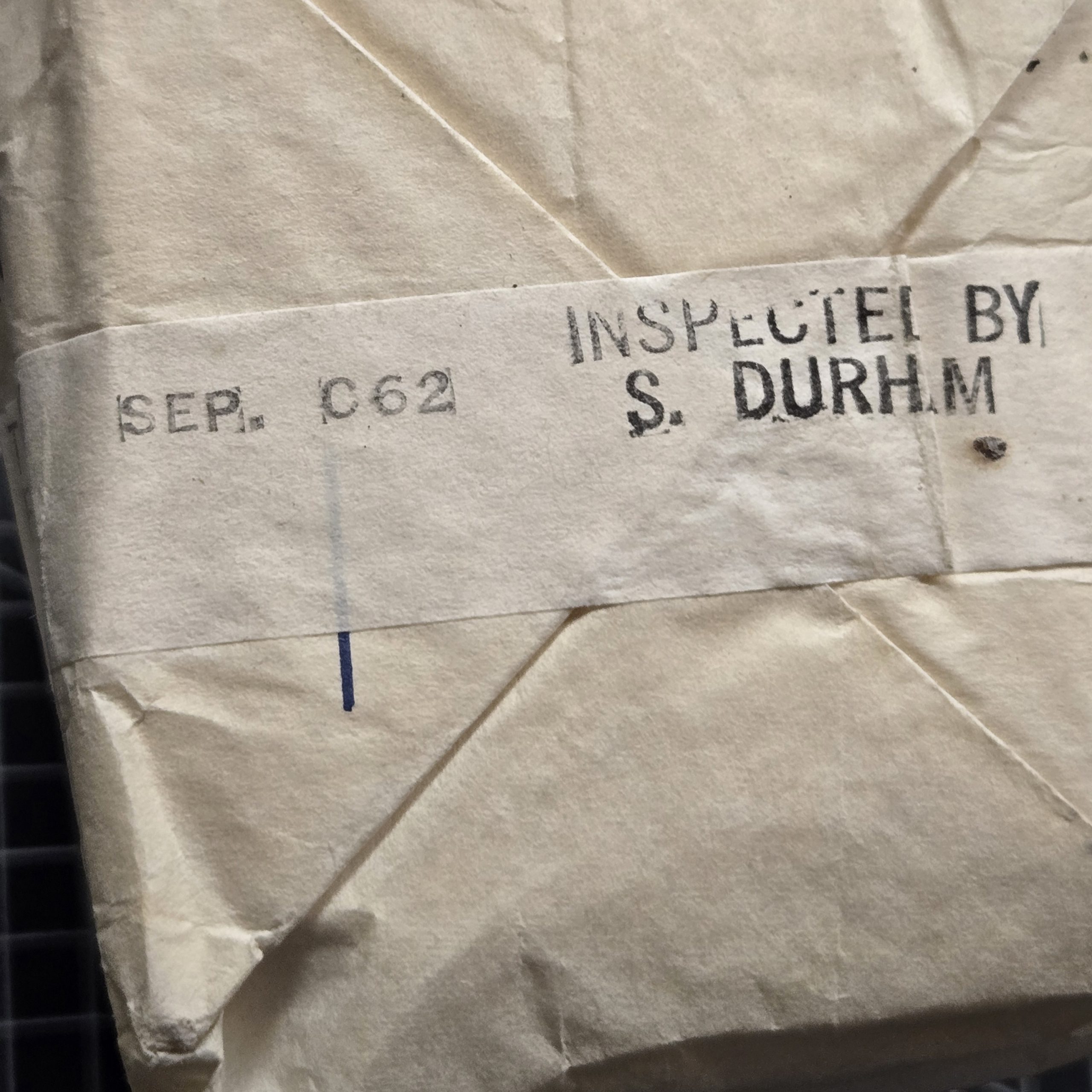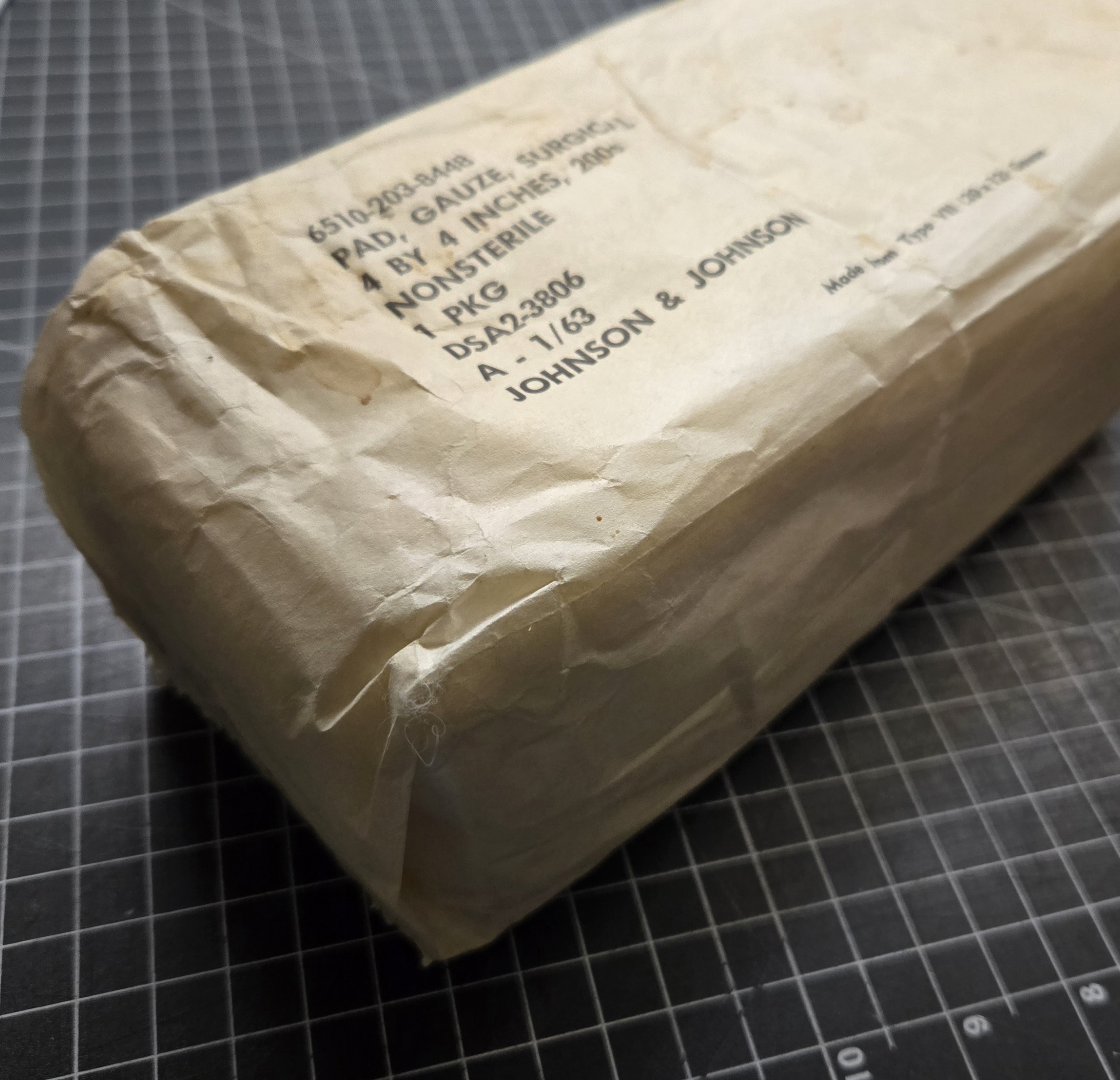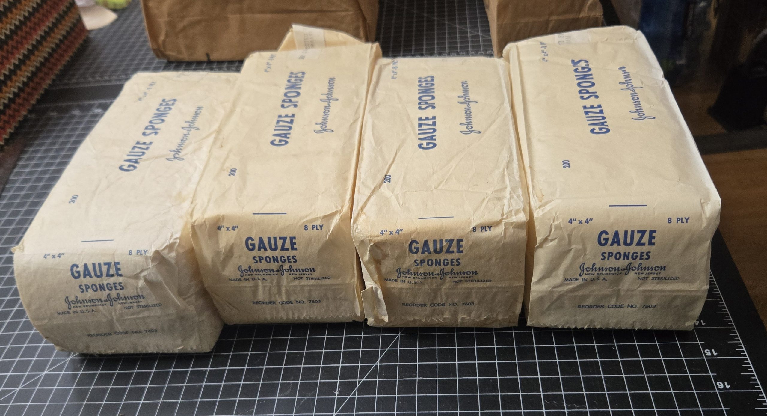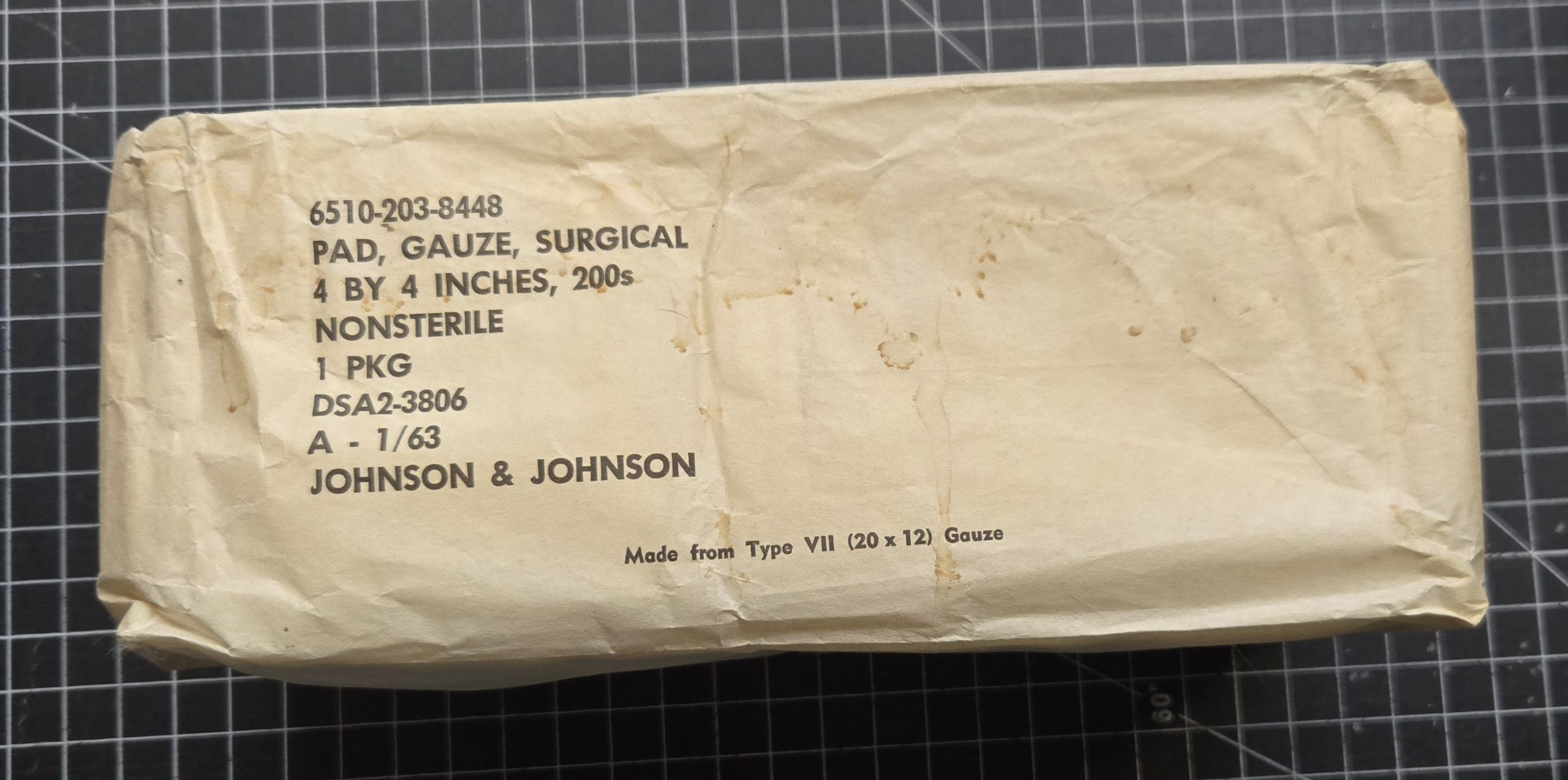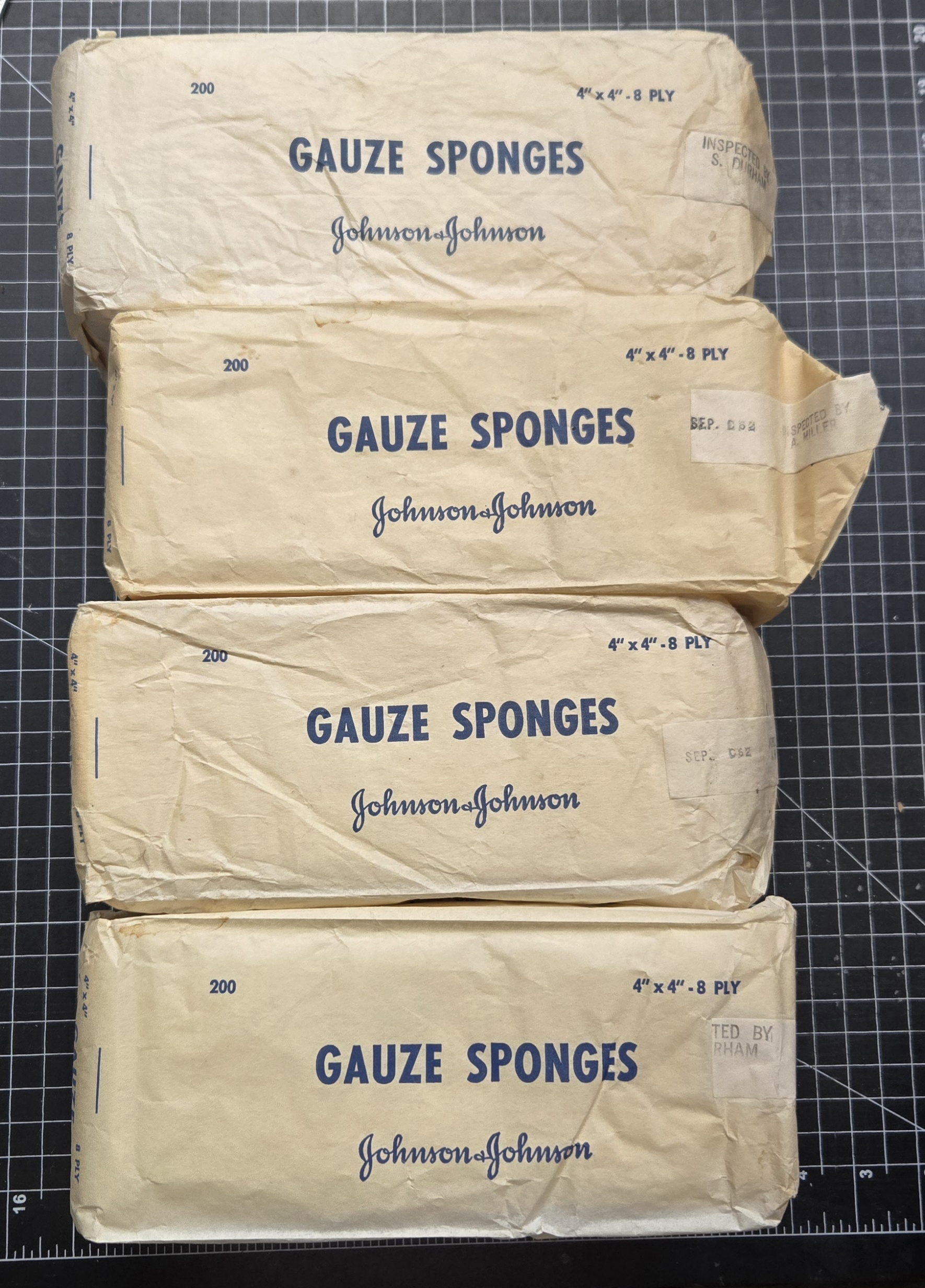 Set of four original Johnson & Johnson gauze sponge packages, each marked 4″ x 4″ 8 ply and dated September 1962. All four are intact as packaged, with inspector stamps from both S. Durham and A. Miller, showing they came off the line around the same time. These are genuine vintage medical supplies with heavy age and storage wear, including staining and worn paper wrappers, but they present well for display. Ideal for Vietnam-era medic impressions, field hospital setups, or military medical collections. Sold strictly as collectible display items only.