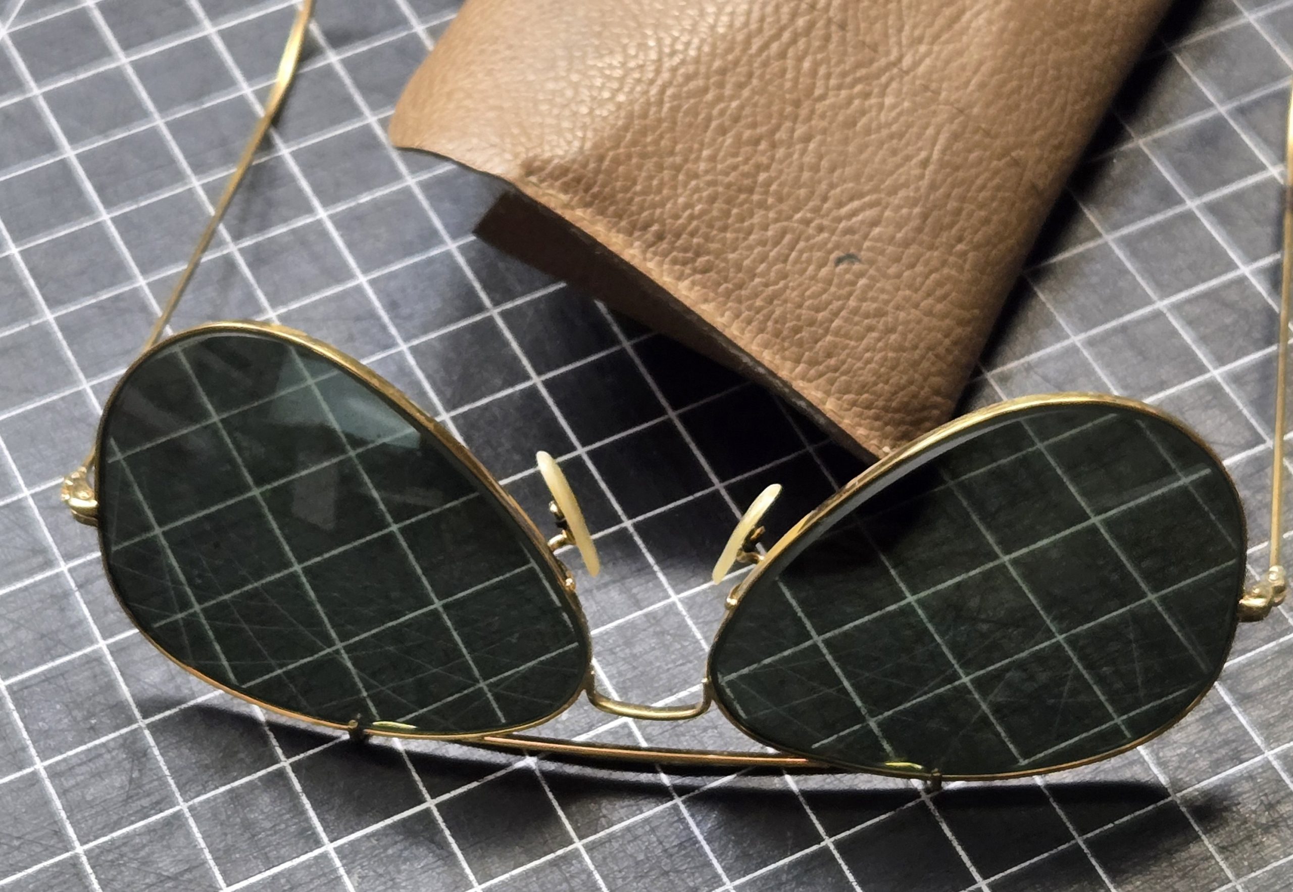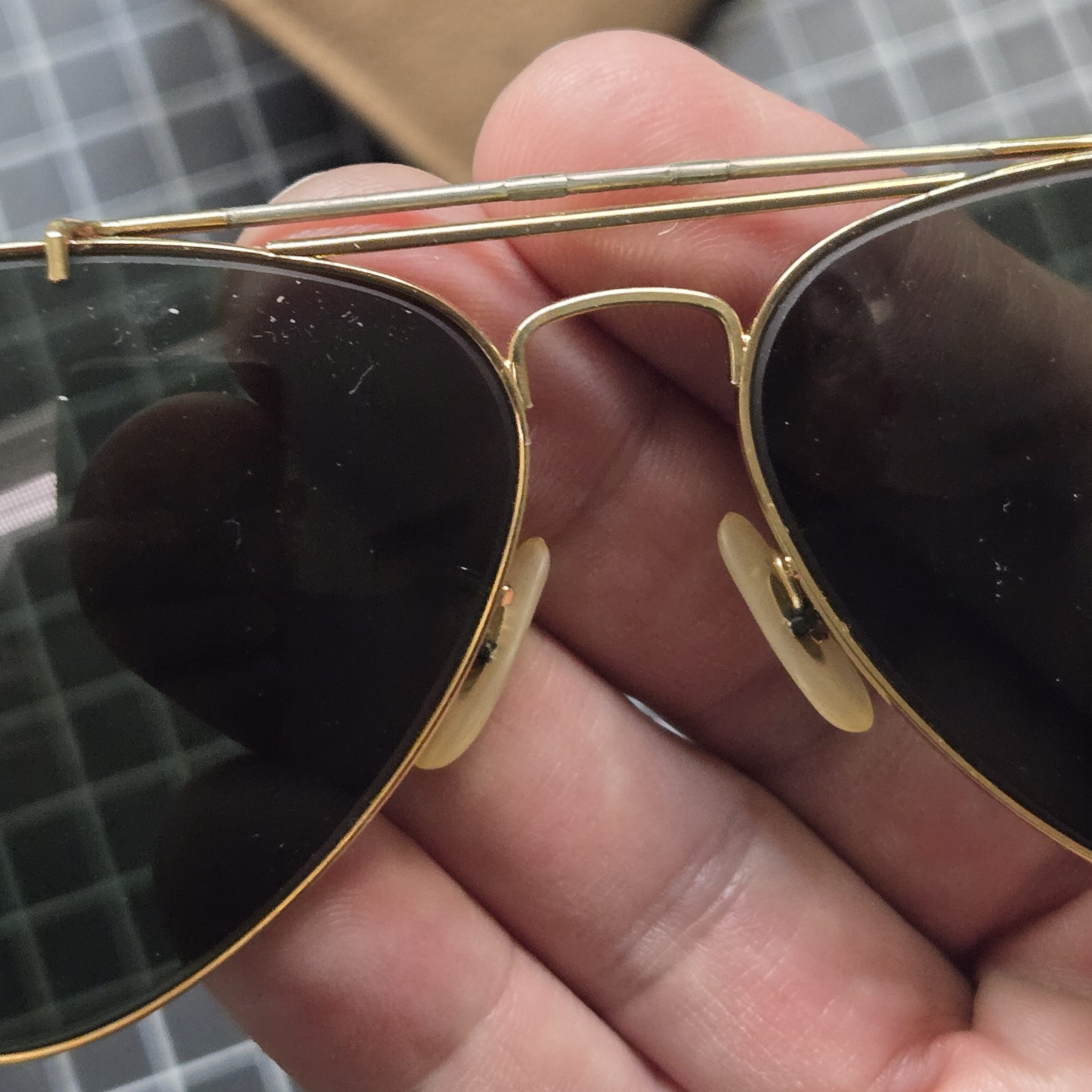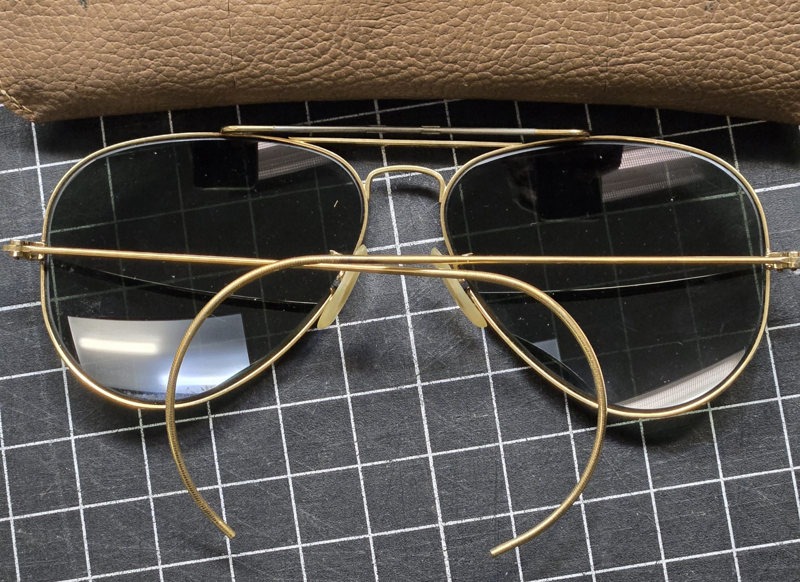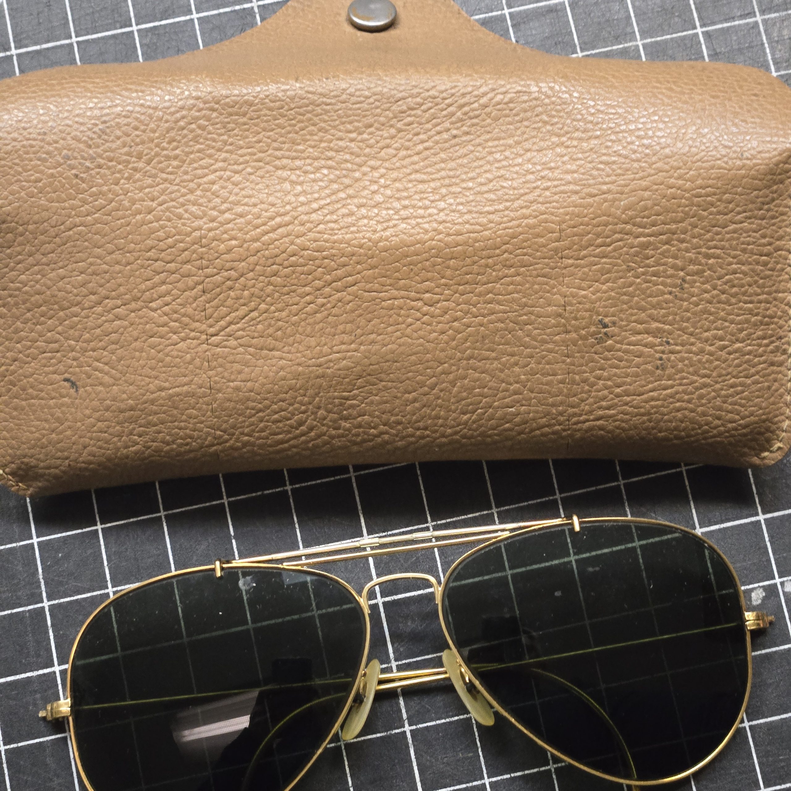 Picked these up years ago at an estate sale along with a larger military lot, and they’ve been sitting in a box ever since, one of those finds you forget about until you run across them again; classic aviator style with thin gold-tone wire frame and cable wrap-around temples, green lenses, and a look that fits right in with the kind of privately purchased sunglasses you see in military footlockers from the 60s through 80s; lenses are not prescription and are in good shape with only light surface wear, frames are straight and solid; included is a genuine Bausch & Lomb Ray-Ban case that they were stored in when I found them, though I can’t guarantee the glasses themselves are Ray-Ban as there are no visible markings or lens etching; still a great vintage pair with a good look and a bit of history behind them, and funny enough this is the second pair of aviators I’ve ever found in an estate, the first one I’m keeping. To find one pair of aviators is awesome, to find two unheard of. So guess what, now you have found one!