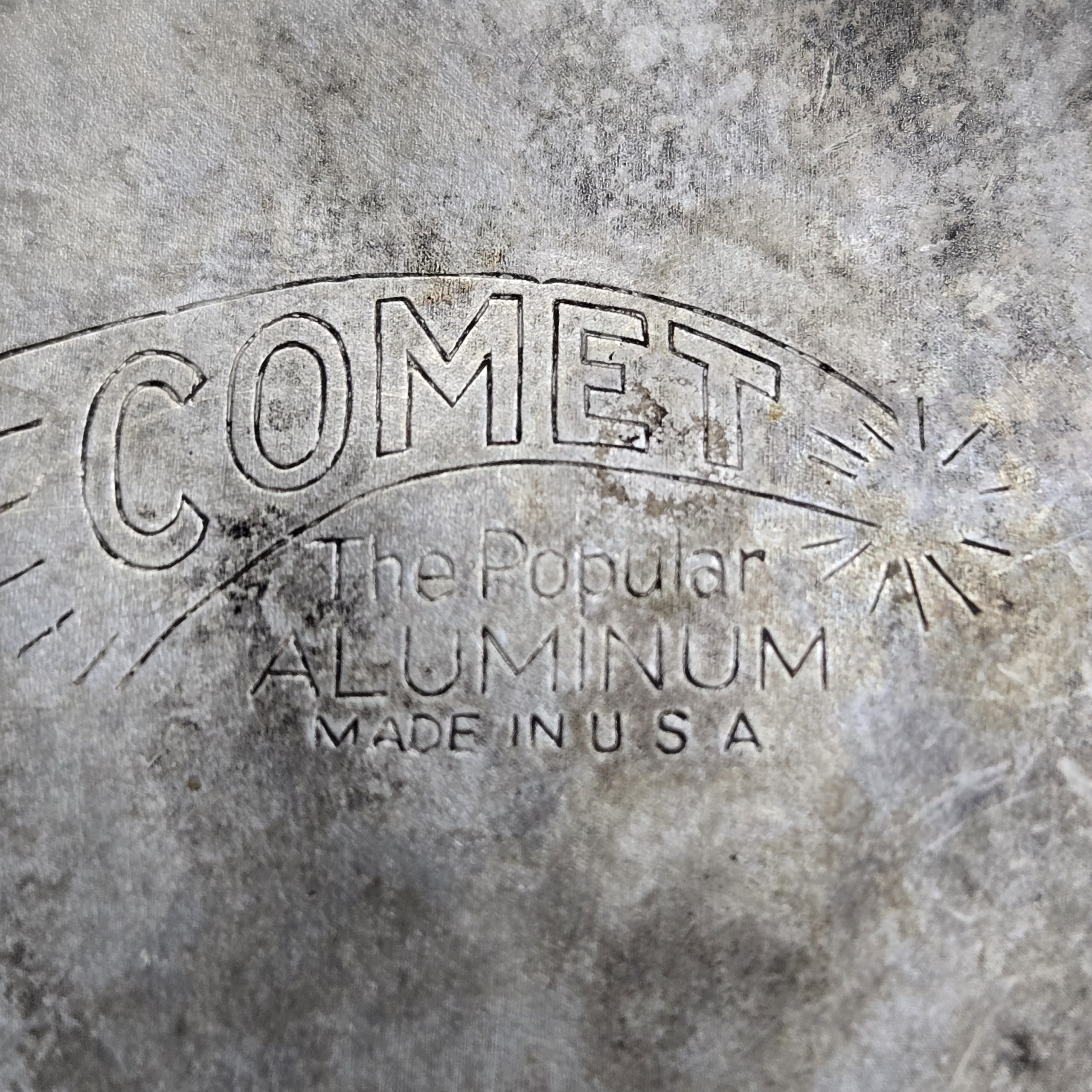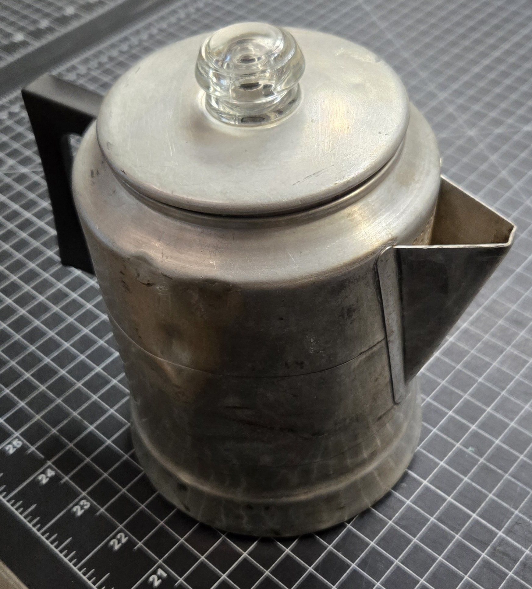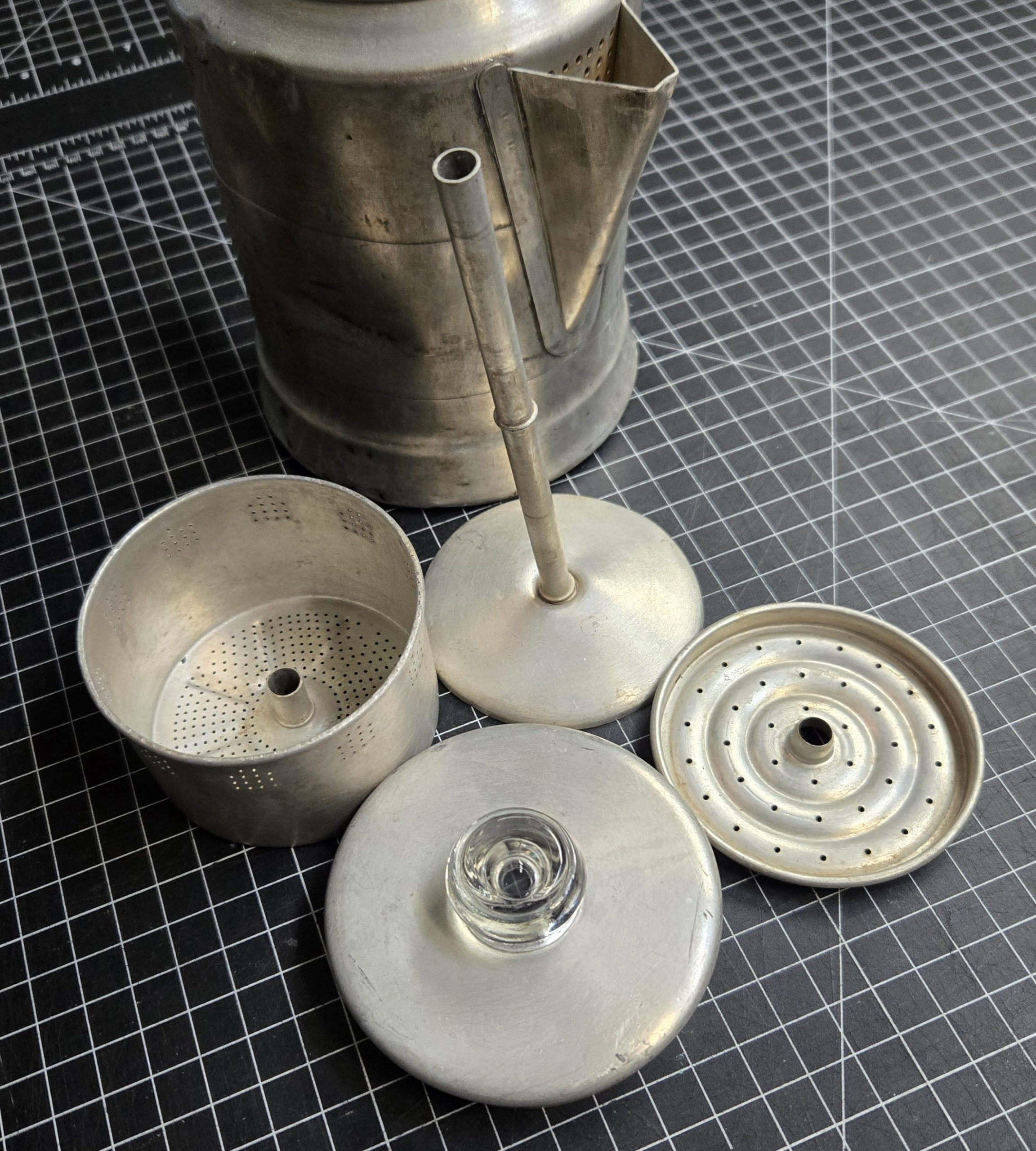 Original COMET “The Popular Aluminum” percolator coffee pot, made in the United States and representative of mid- 20th century American kitchenware. Comet-branded aluminum cookware like this was commonly produced from the late 1930s into the 1940s, overlapping directly with the WWII period when lightweight aluminum was widely used for both civilian and field gear. Pieces like this show up frequently in period photos and camp setups due to their durability and simplicity. This is a complete percolator set, including the main pot, lid with glass knob, internal basket, stem, and perforated spreader plate. All components are present and fit together correctly. It has been used extensively and still functions as intended, producing coffee in the traditional percolator method. Condition reflects long-term use. The aluminum body shows darkened patina, surface wear, dents and staining consistent with years of heating and brewing. There are no structural issues affecting performance. The handle is intact, the spout is cleanly formed, and the lid seats properly. The glass knob is present and secure. This is a strong, honest example of a working vintage percolator. It is well suited for reenactments, living history displays, or anyone building out a period-correct 1940s camp or kitchen setup. It also remains fully usable for those who prefer traditional stovetop coffee. Makes 9 cups of coffee per batch.