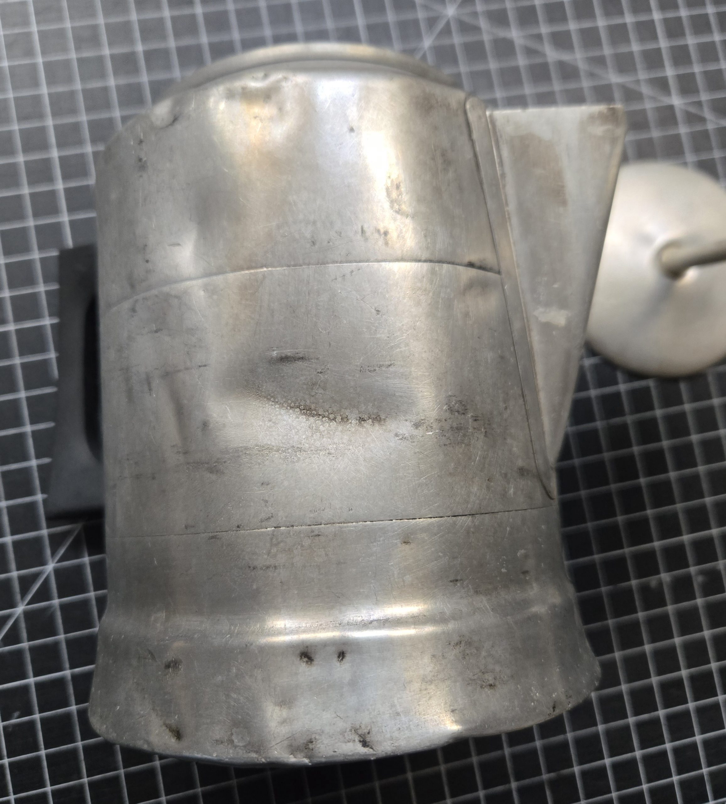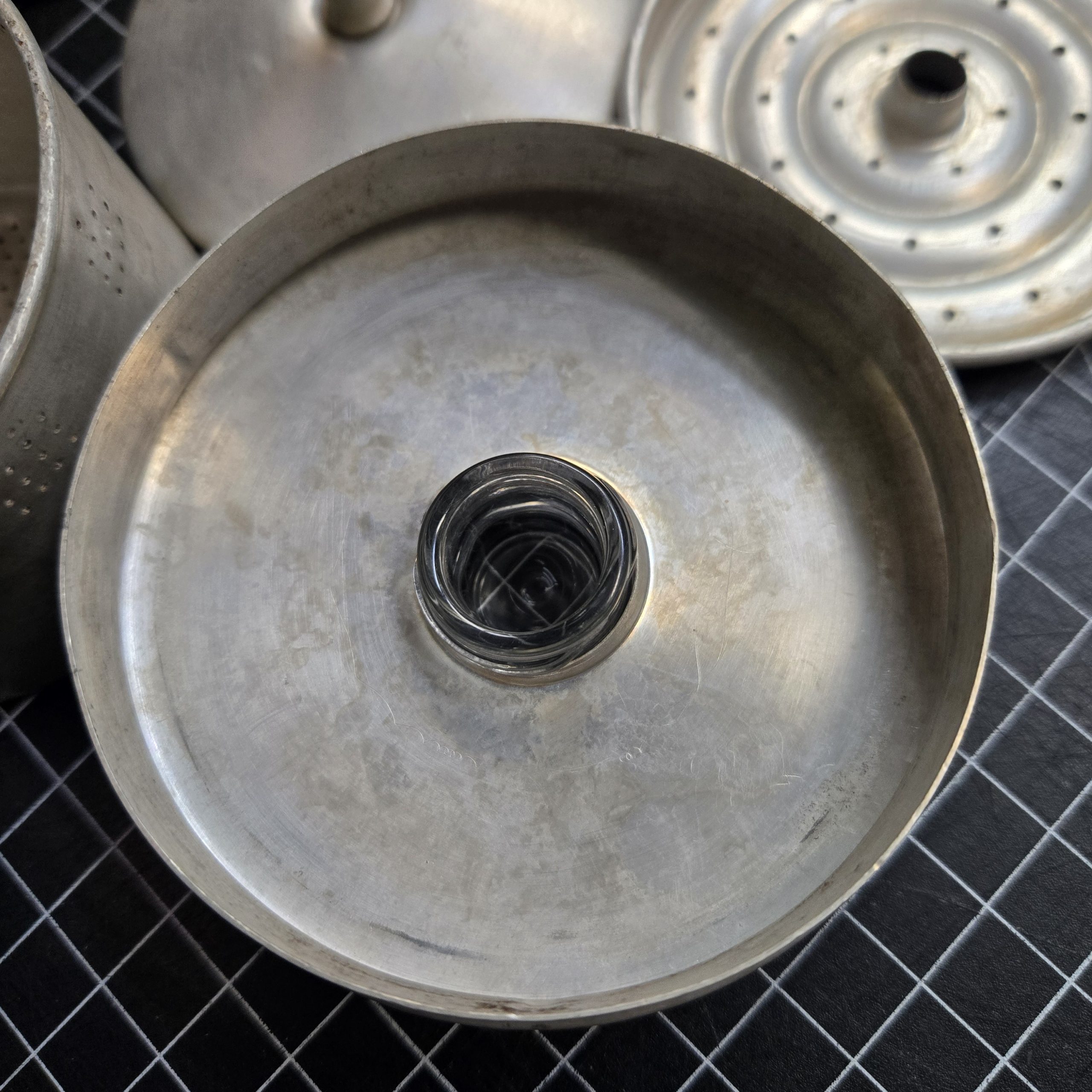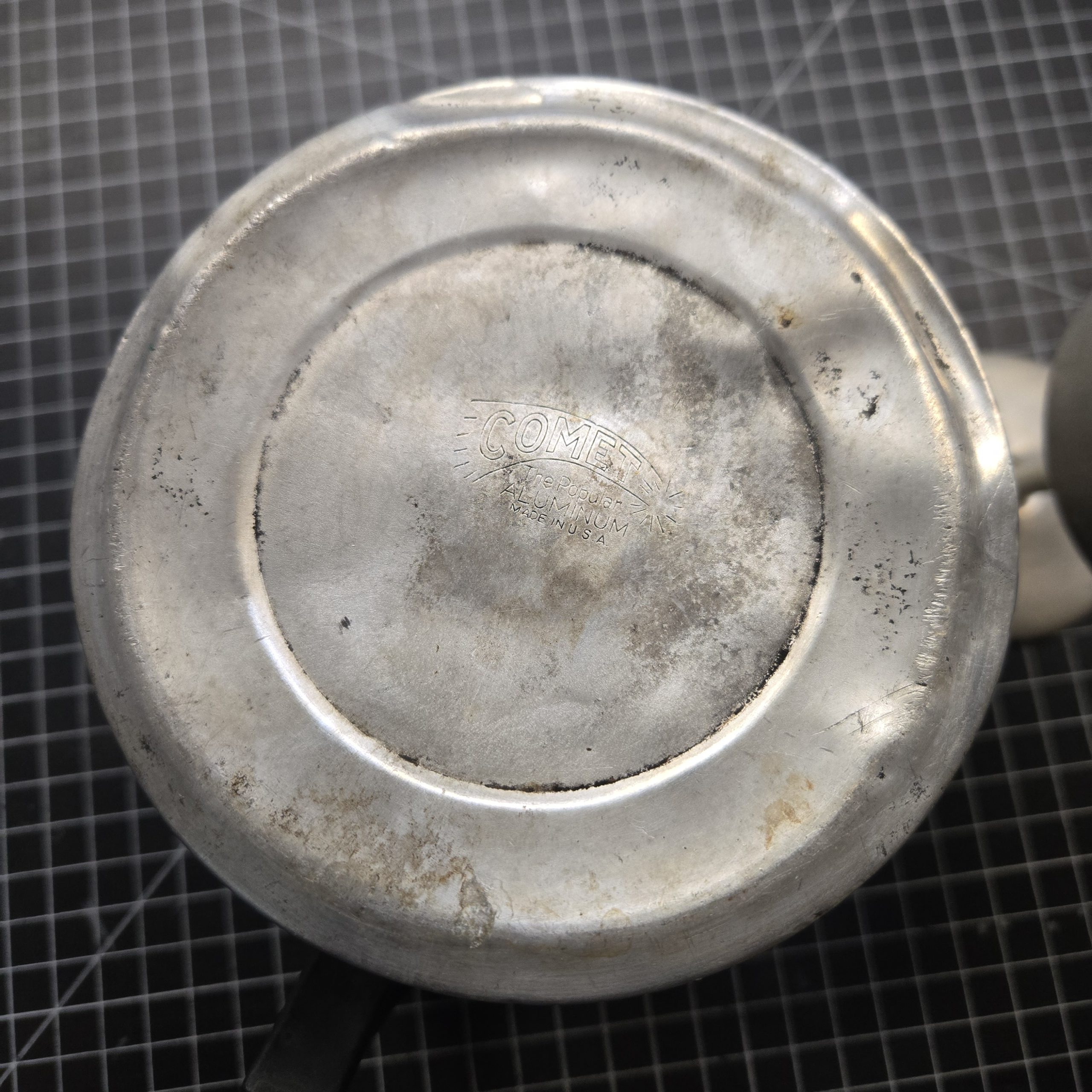Original COMET “The Popular Aluminum” percolator coffee pot, made in the United States and representative of mid- 20th century American kitchenware. Comet-branded aluminum cookware like this was commonly produced from the late 1930s into the 1940s, overlapping directly with the WWII period when lightweight aluminum was widely used for both civilian and field gear. Pieces like this show up frequently in period photos and camp setups due to their durability and simplicity. This is a complete percolator set, including the main pot, lid with glass knob, internal basket, stem, and perforated spreader plate. All components are present and fit together correctly. It has been used extensively and still functions as intended, producing coffee in the traditional percolator method. Condition reflects long-term use. The aluminum body shows darkened patina, surface wear, dents and staining consistent with years of heating and brewing. There are no structural issues affecting performance. The handle is intact, the spout is cleanly formed, and the lid seats properly. The glass knob is present and secure. This is a strong, honest example of a working vintage percolator. It is well suited for reenactments, living history displays, or anyone building out a period-correct 1940s camp or kitchen setup. It also remains fully usable for those who prefer traditional stovetop coffee. Makes 9 cups of coffee per batch.
