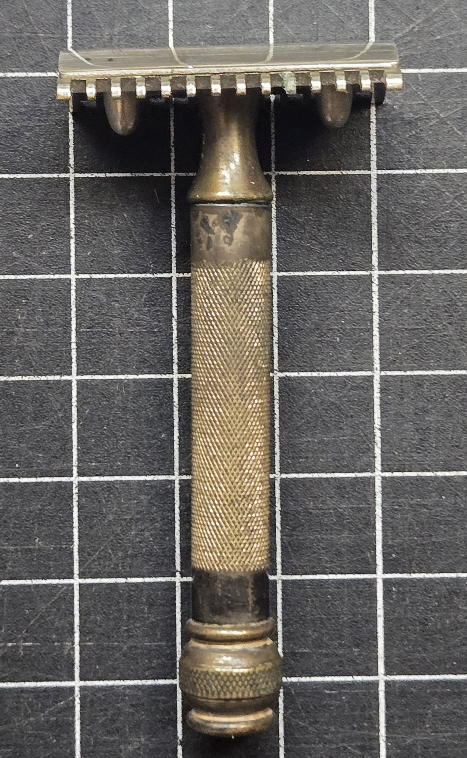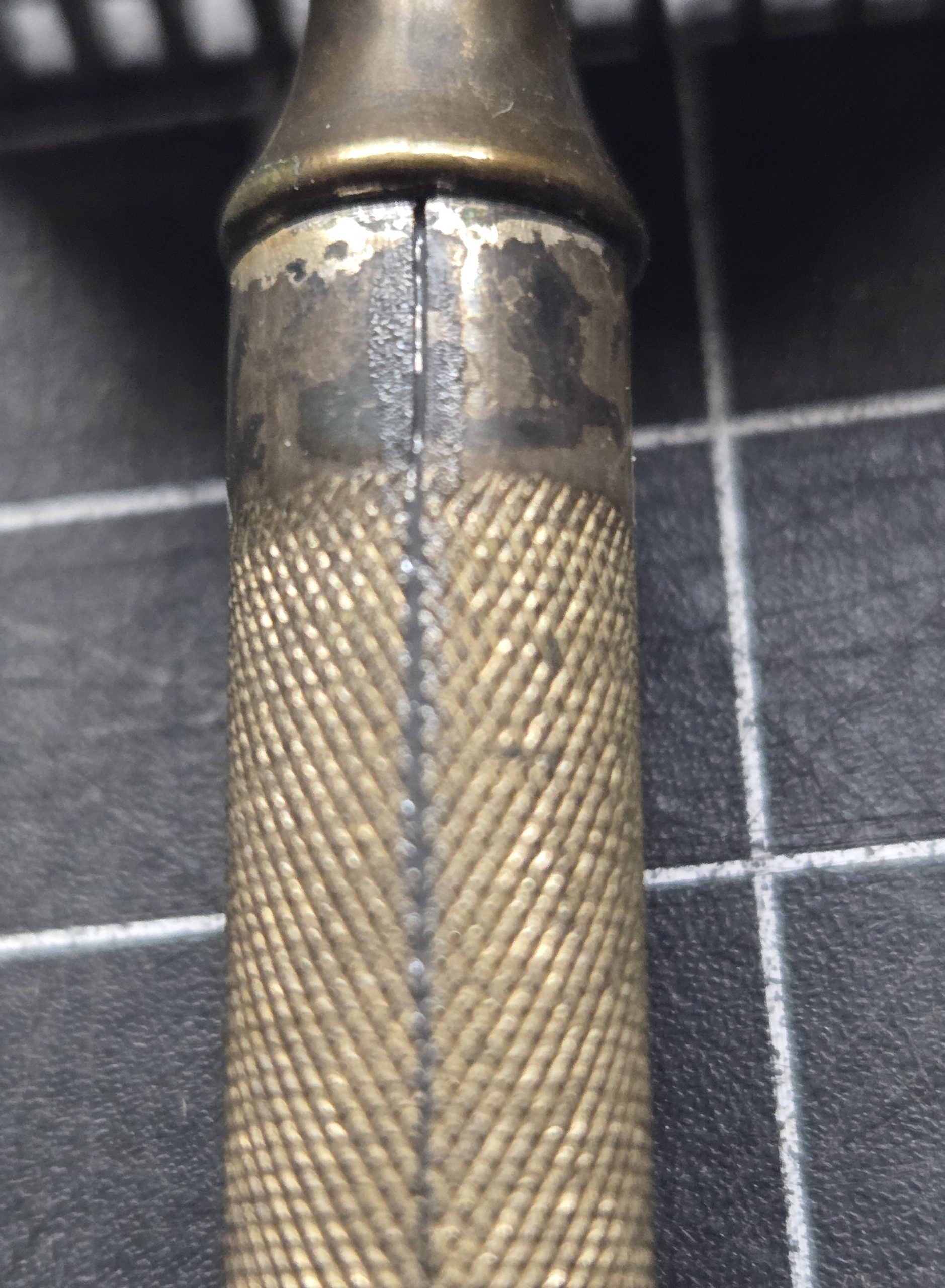 Condition reflects use but also careful preservation. The handle developed a crack along the barrel at some point in its life, a common issue with these hollow handles. It has been internally reinforced using JB Weld, I bonded the upper and lower sections inside the barrel. This repair does not affect function. The razor still disassembles properly, threads cleanly, and holds tight. Structurally, it is now stable and ready for continued use.