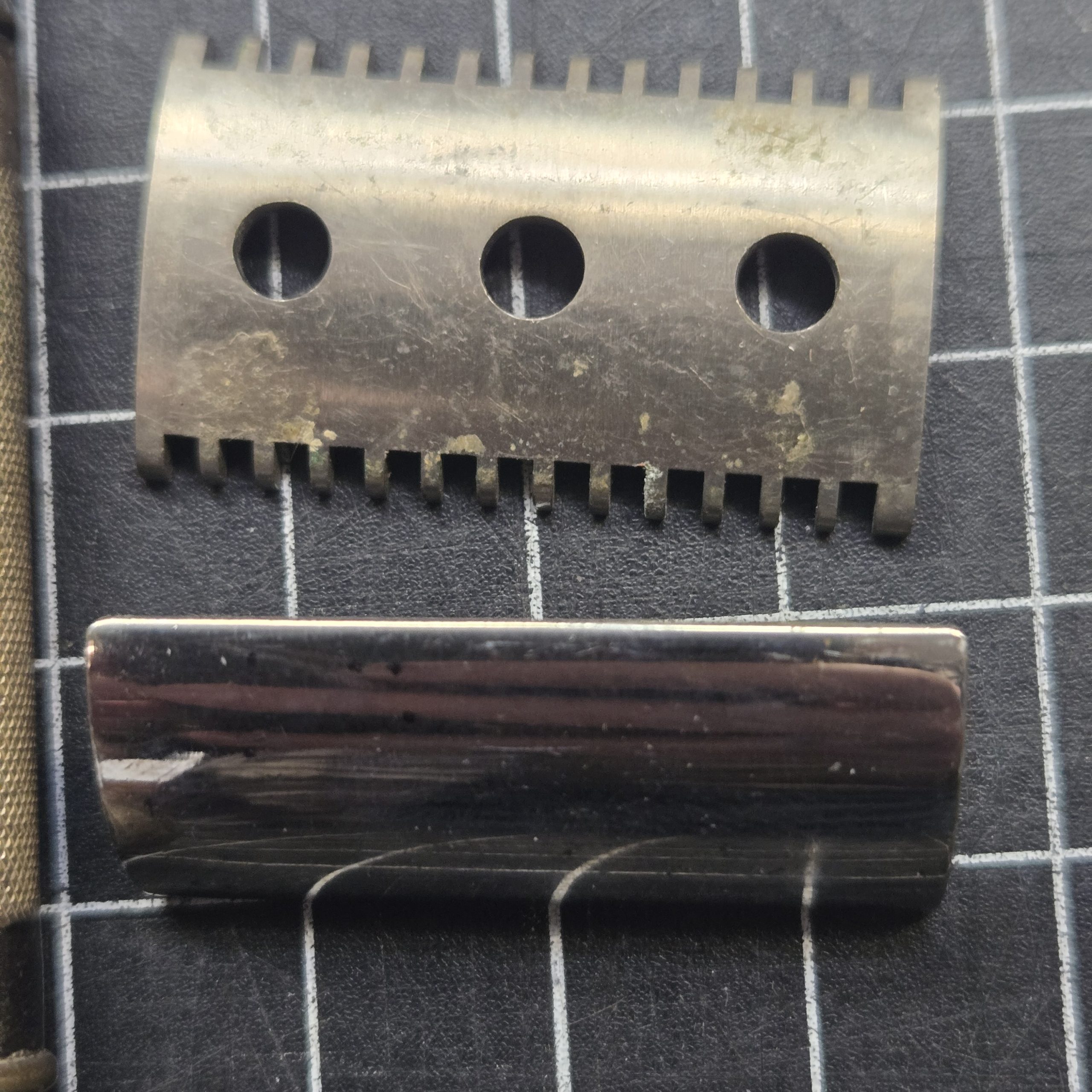 This is not a collector-grade example, but it is exactly the kind of razor that fits well in a WWII shaving kit and holds up to actual use. Ideal for reenactors, living history setups, or anyone putting together a period-correct impression who wants something authentic and functional rather than pristine.