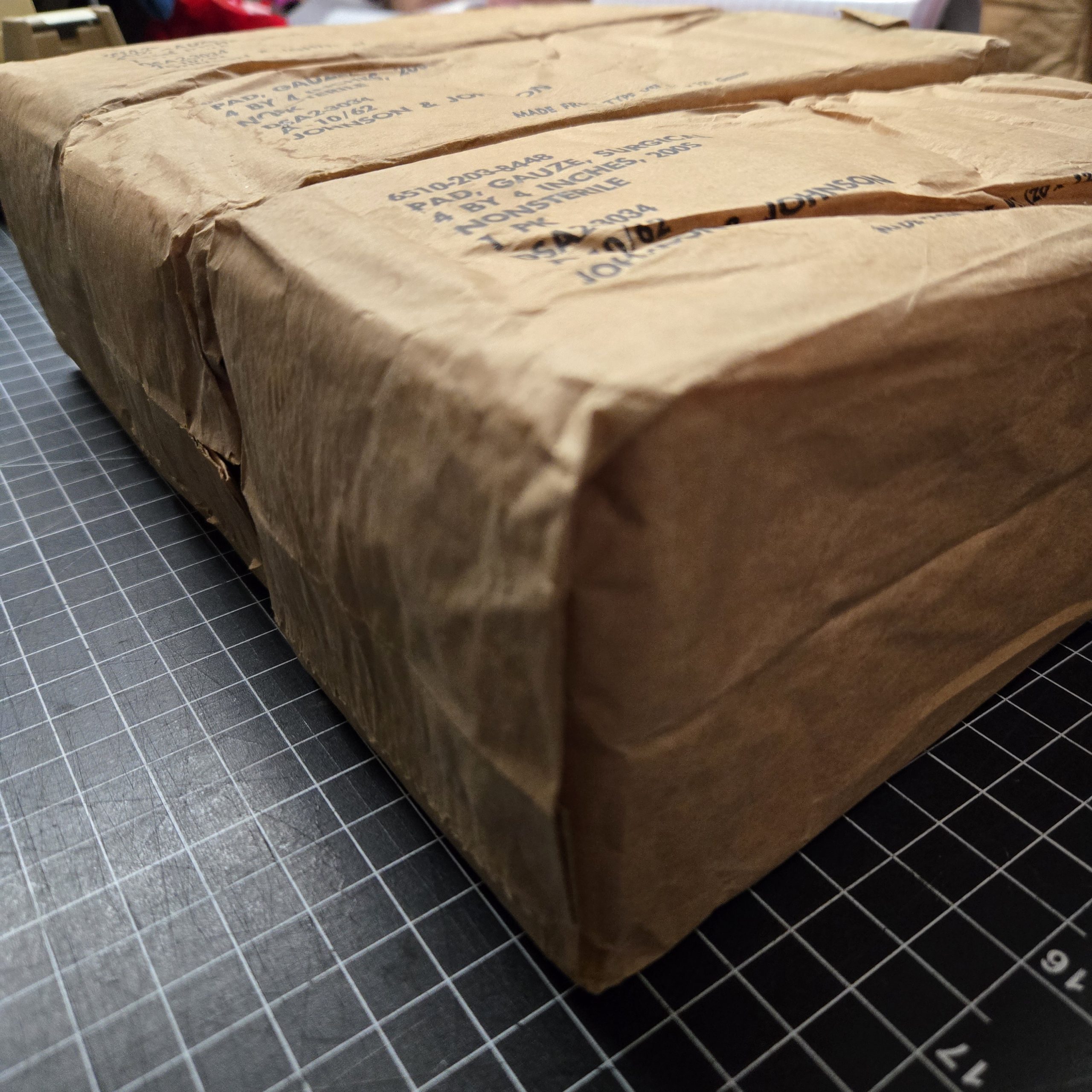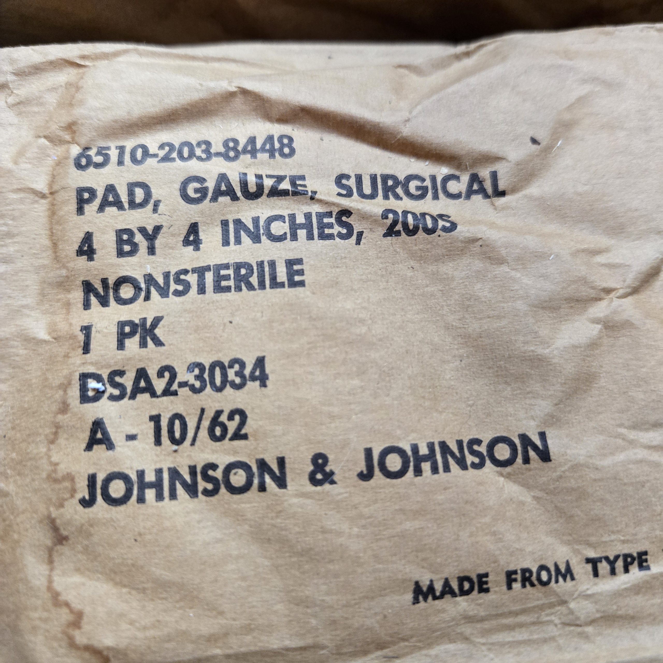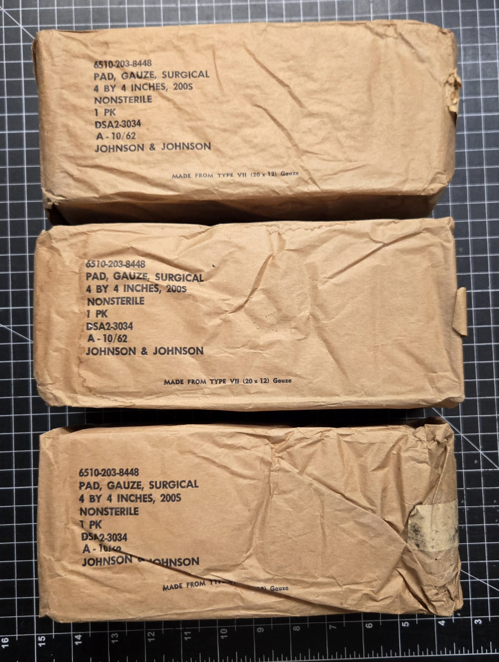 Lot of three original Johnson & Johnson surgical gauze packs dated October 1962. Each pack is marked 4×4 inches, 200 count, nonsterile. Outer paper wrappers show age, staining, and some tearing from long storage, but all remain intact as display pieces. Strong Vietnam era look, ideal for filling out a medic bag, aid station setup, or general field hospital impression. Not intended for modern medical use.
