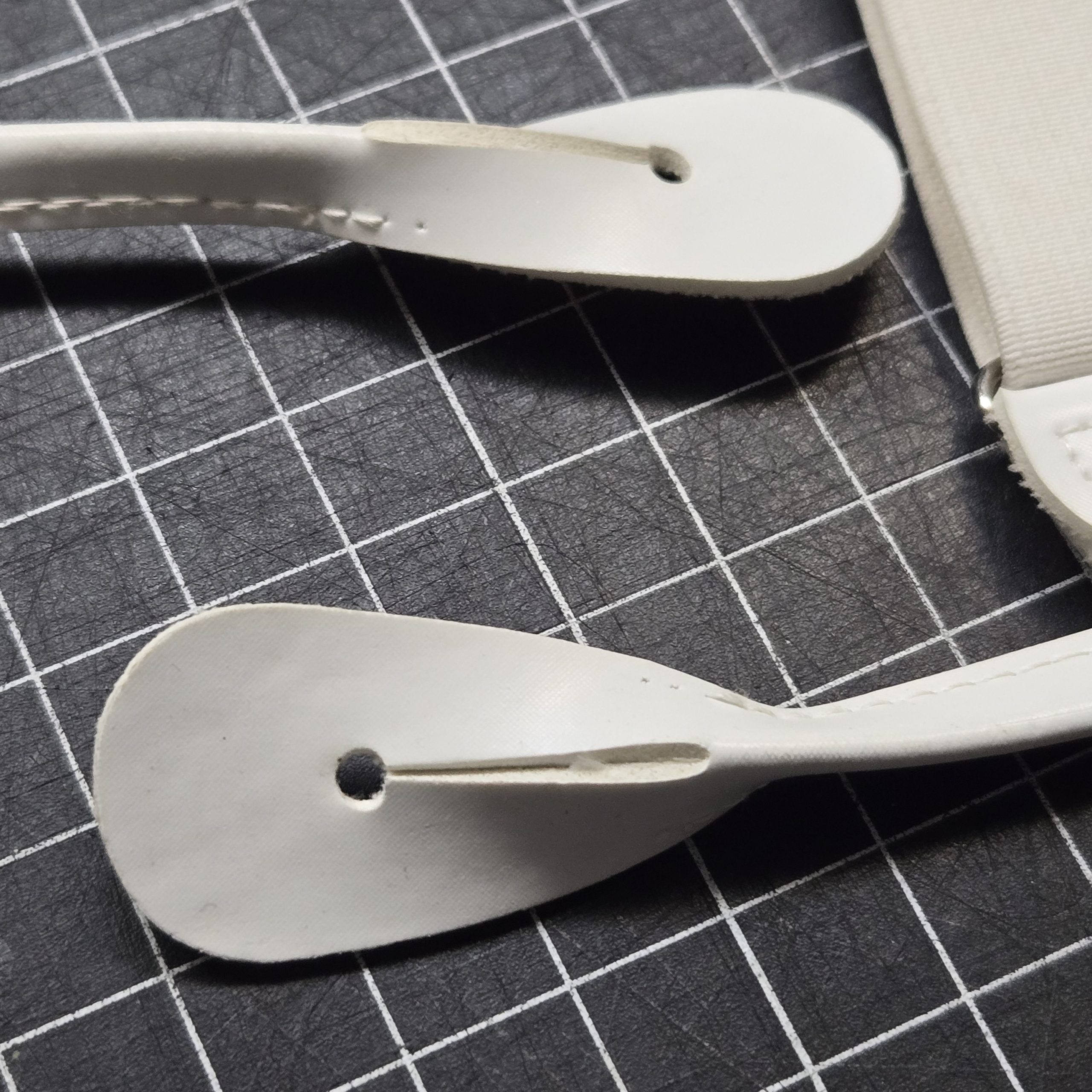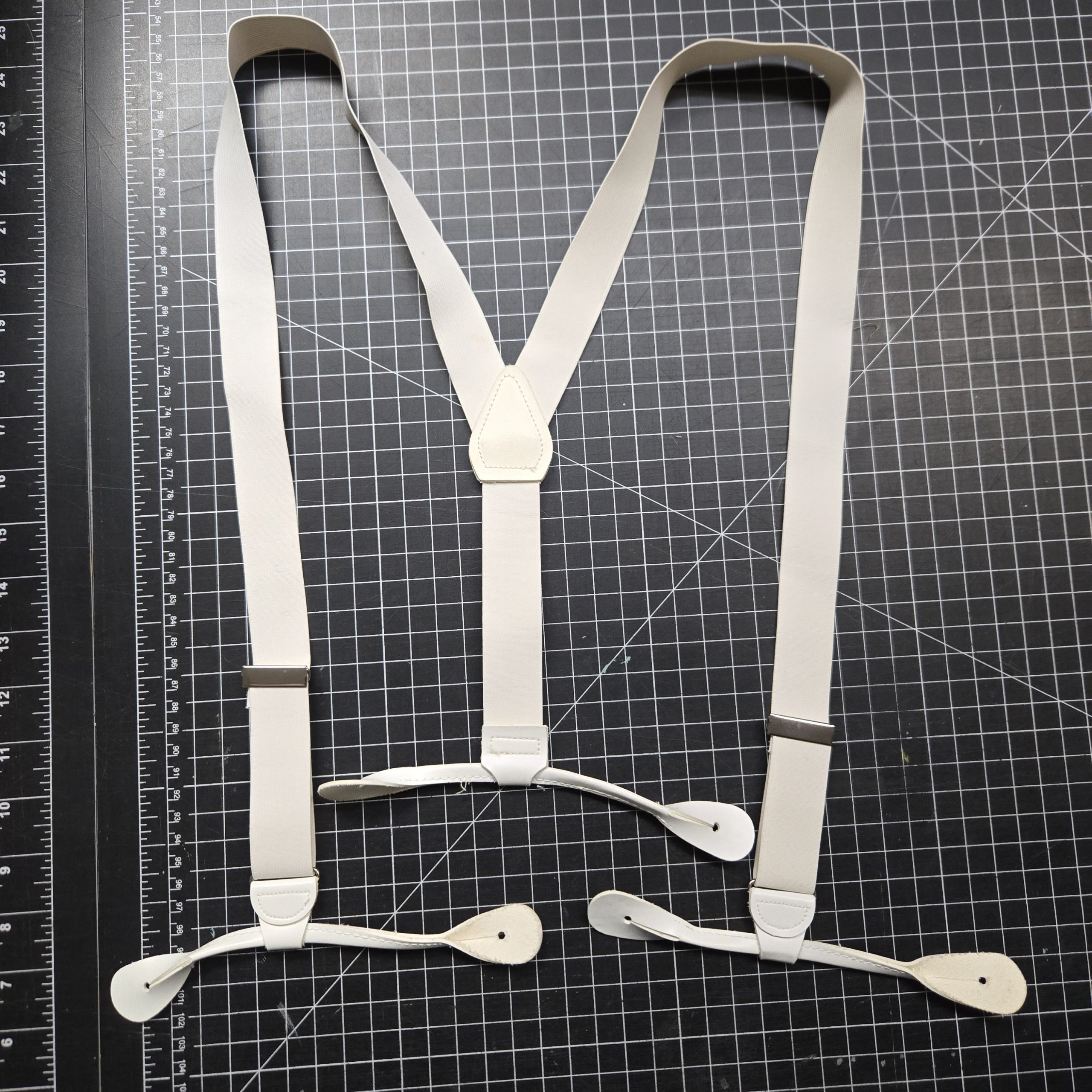 White vinyl military dress suspenders with elastic straps and leatherette ends, typical of formal or ceremonial uniforms from the late Cold War era. Likely 1980s to 1990s issue or commercially supplied for dress uniforms. Clean overall with light handling marks, all hardware intact and functional. Adjustable and ready for use or display with dress blues or similar formal kits.