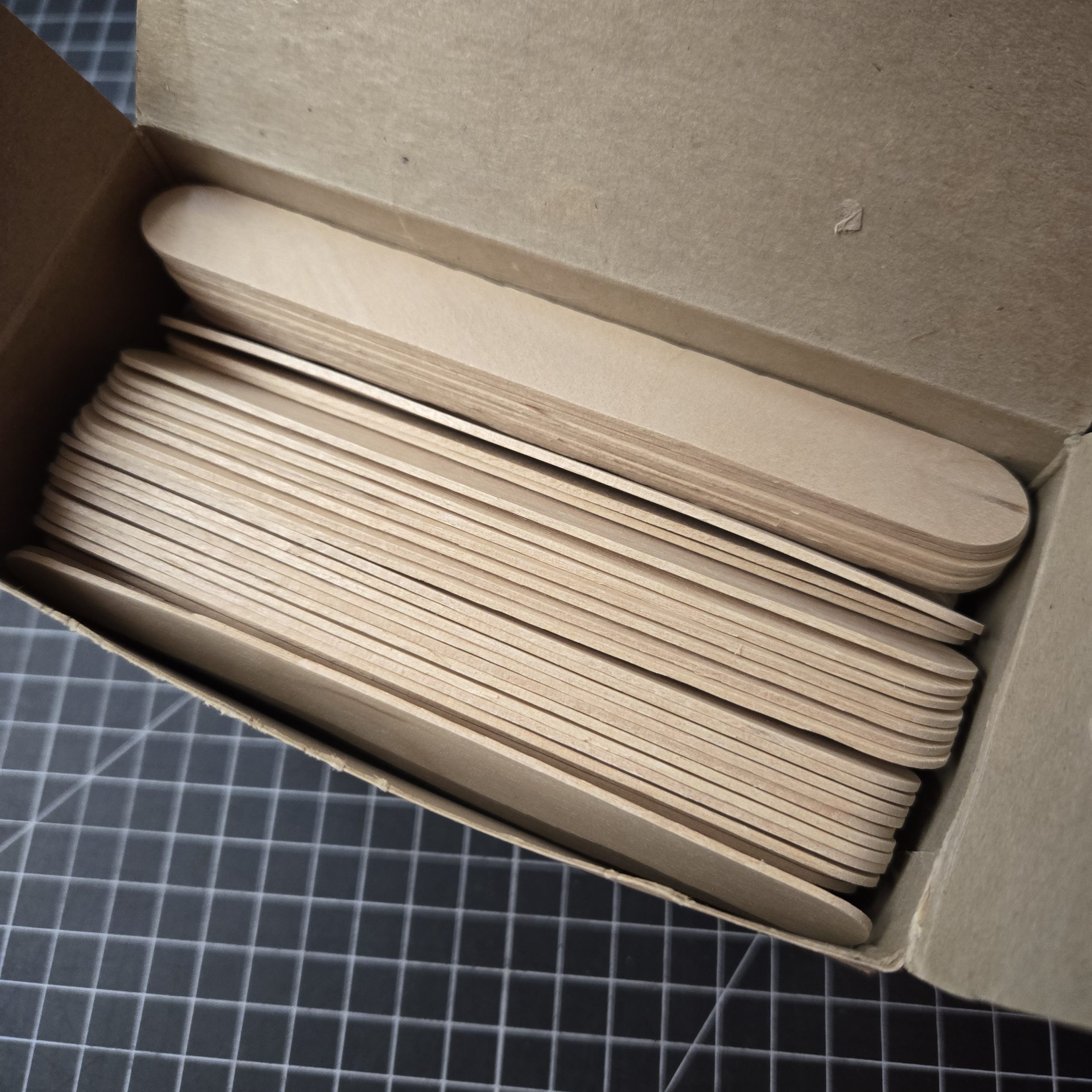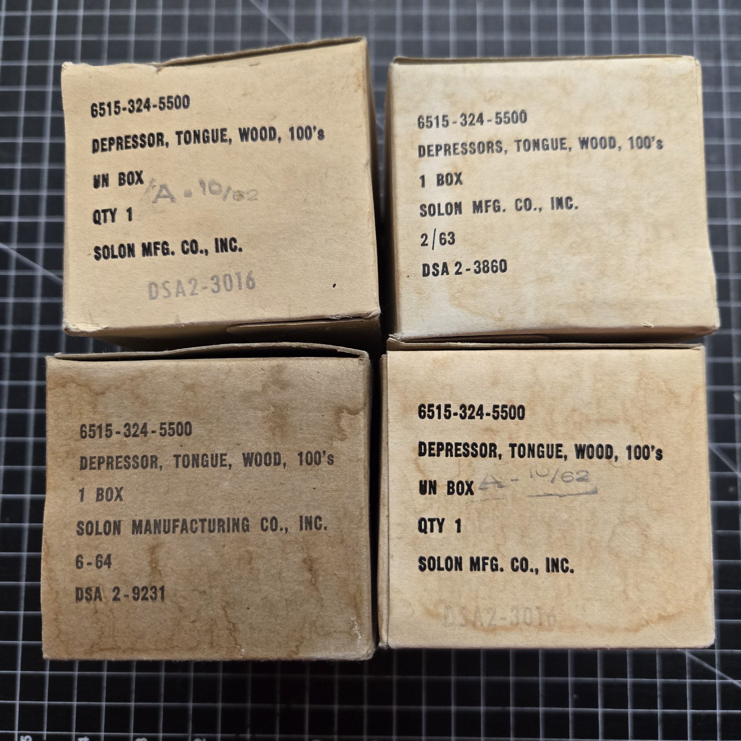 Original military issue wooden tongue depressors in four boxes, each marked for 100 count, dating between 1962 and 1964. Manufactured by Solon Mfg. Co. Boxes show age, staining, and shelf wear, but remain intact. The depressors inside appear clean and well preserved. Solid display pieces for a field hospital or medic impression, or useful for general shop and craft use. Sold as one lot of four boxes.