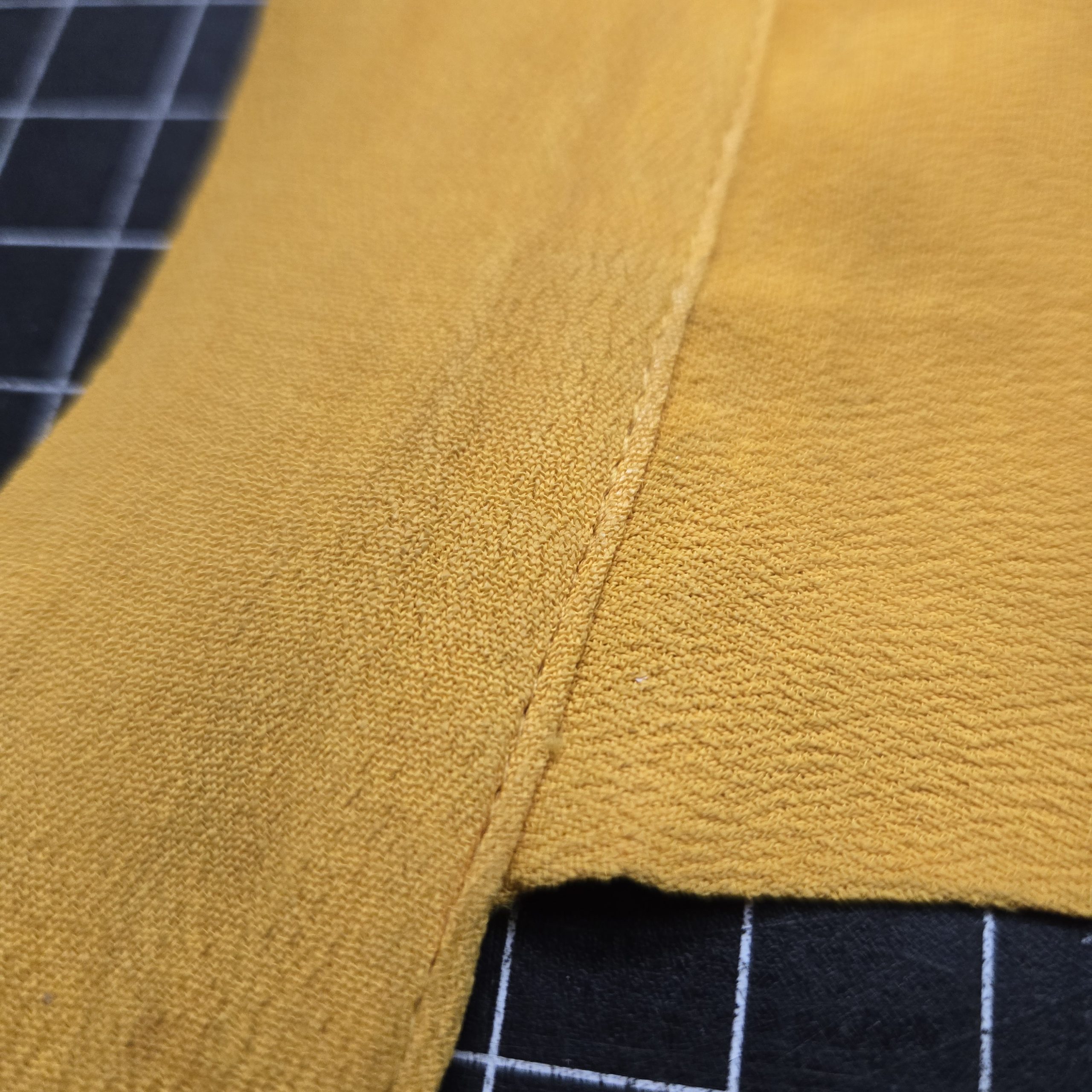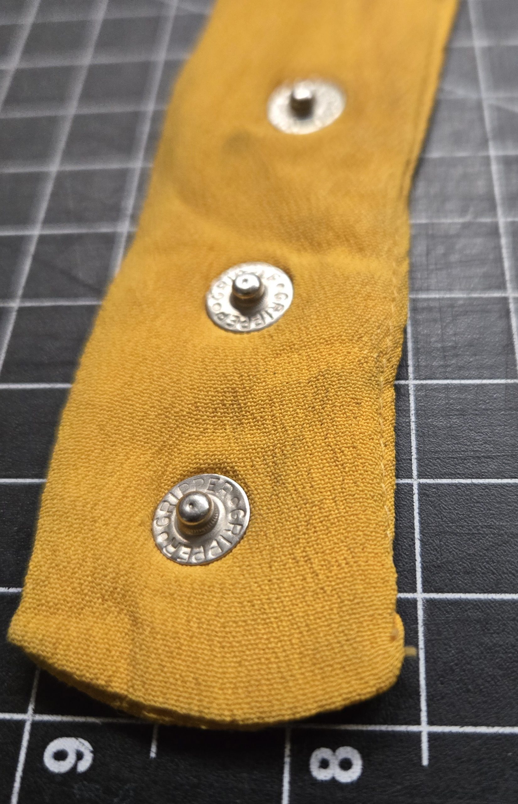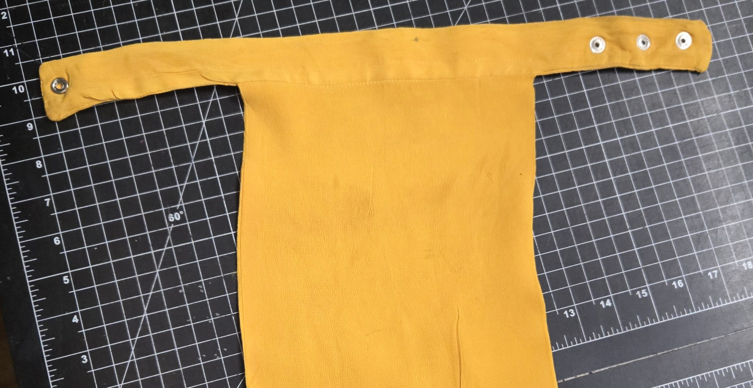 Original vintage yellow bib-style scarf consistent with U.S. Army Armor/Cavalry ceremonial wear, likely dating to the mid 20th century around the 1960s to 1980s range based on materials and construction, made from a lightweight synthetic or rayon-type fabric with a T-shaped bib front and adjustable neck strap using Gripper snaps; shows light age and use with some small stains and minor discoloration but presents well for period impression or display, measures approximately 21 inches in the front panel with a 17 inch neck setting at the largest snap position so best suited for smaller neck sizes, a solid piece for reenactment, uniform display, or collectors looking for authentic branch-colored accessories.