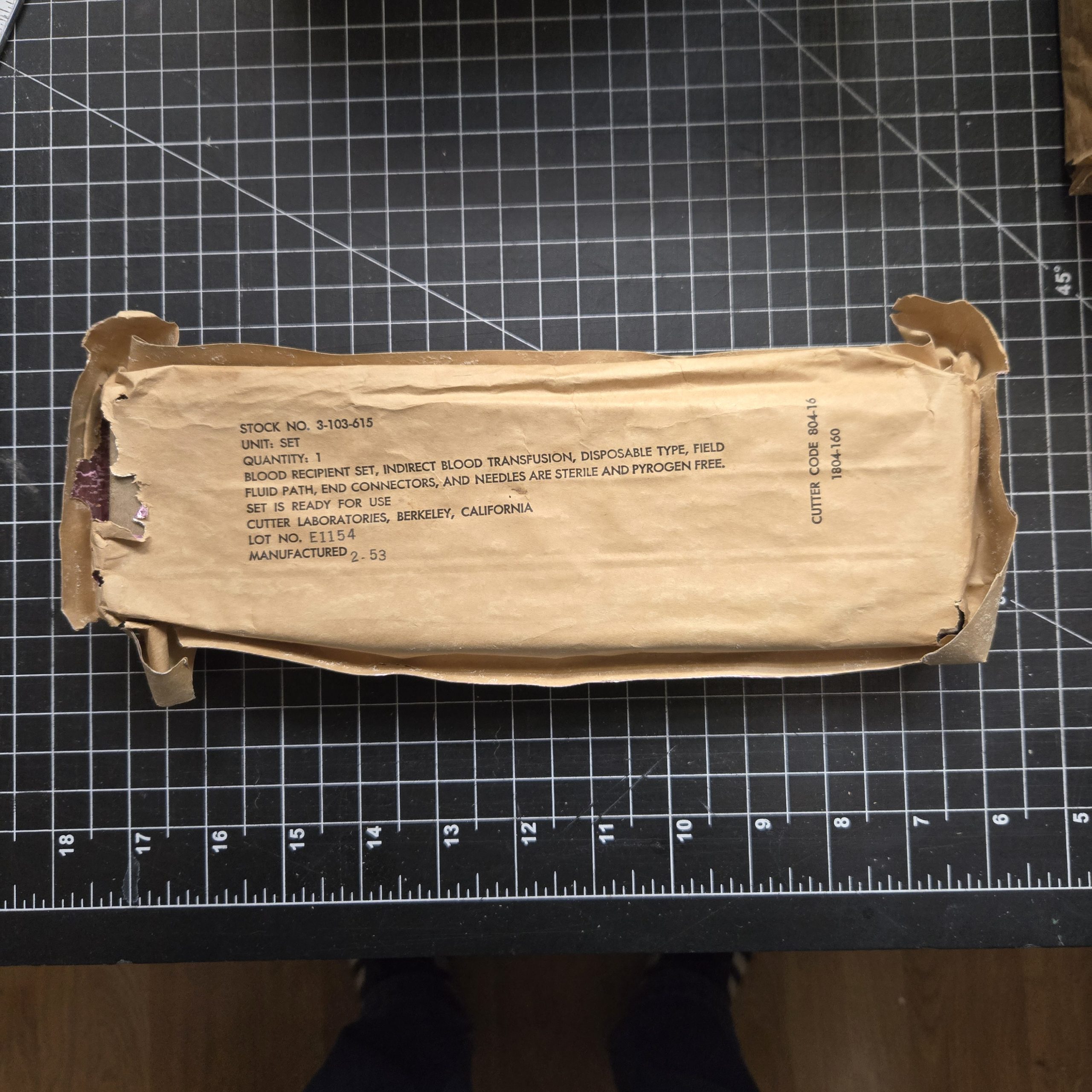 Original U.S. military blood recipient set, indirect blood transfusion type, manufactured February 1953 by Cutter Laboratories, Berkeley, California (Stock No. 3-103-615, Lot E1154). This is a complete field fluid path kit as issued, still housed in its original paper and foil wrapper. The outer packaging shows heavy age and storage wear, with tears and deterioration, but the inner box remains present and intact inside. Contents are sold as a collectible display piece only, with no medical use intended. A solid example for Korean War or early Vietnam-era medic displays, especially for field hospital or aid station setups.
