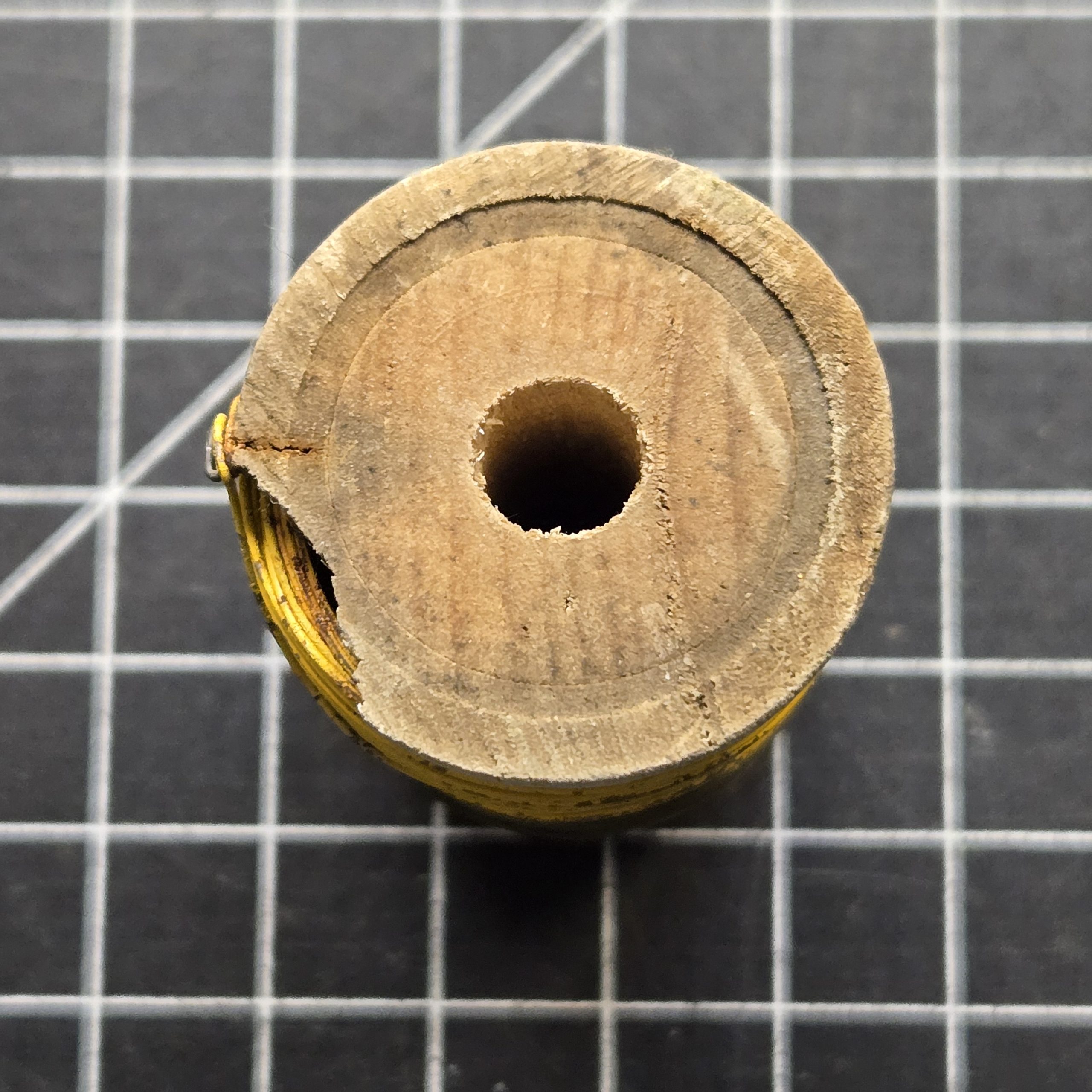 Original wooden spool of U.S. military tripwire or demolition wire with green and yellow painted wire, consistent with WWII to early Cold War engineer use; wire is unused and remains fully intact on the spool, with no sections pulled off; the wooden spool shows age and has a small chip on one edge but is still solid and displayable; a nice, original piece of field gear for any engineer or ordnance collection.