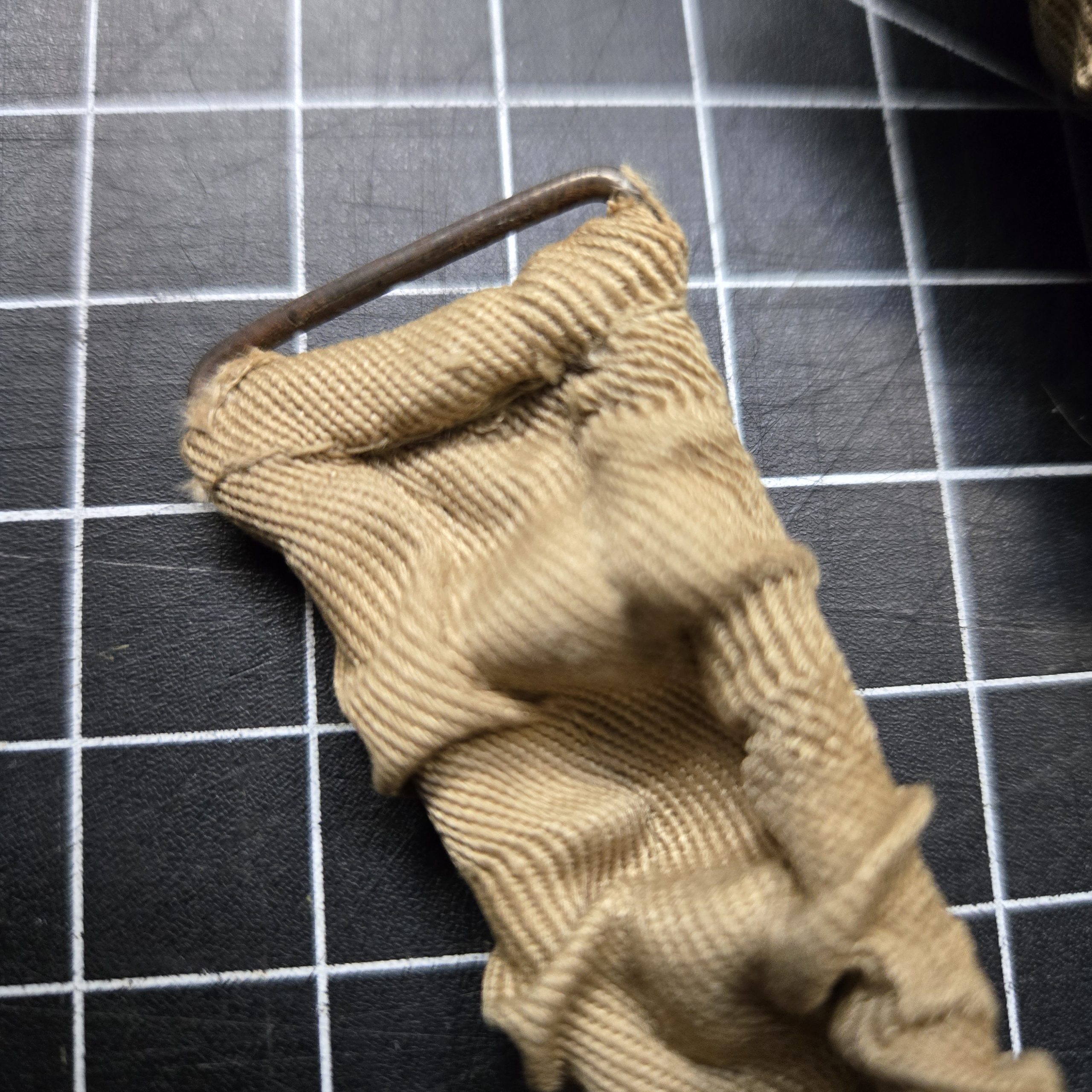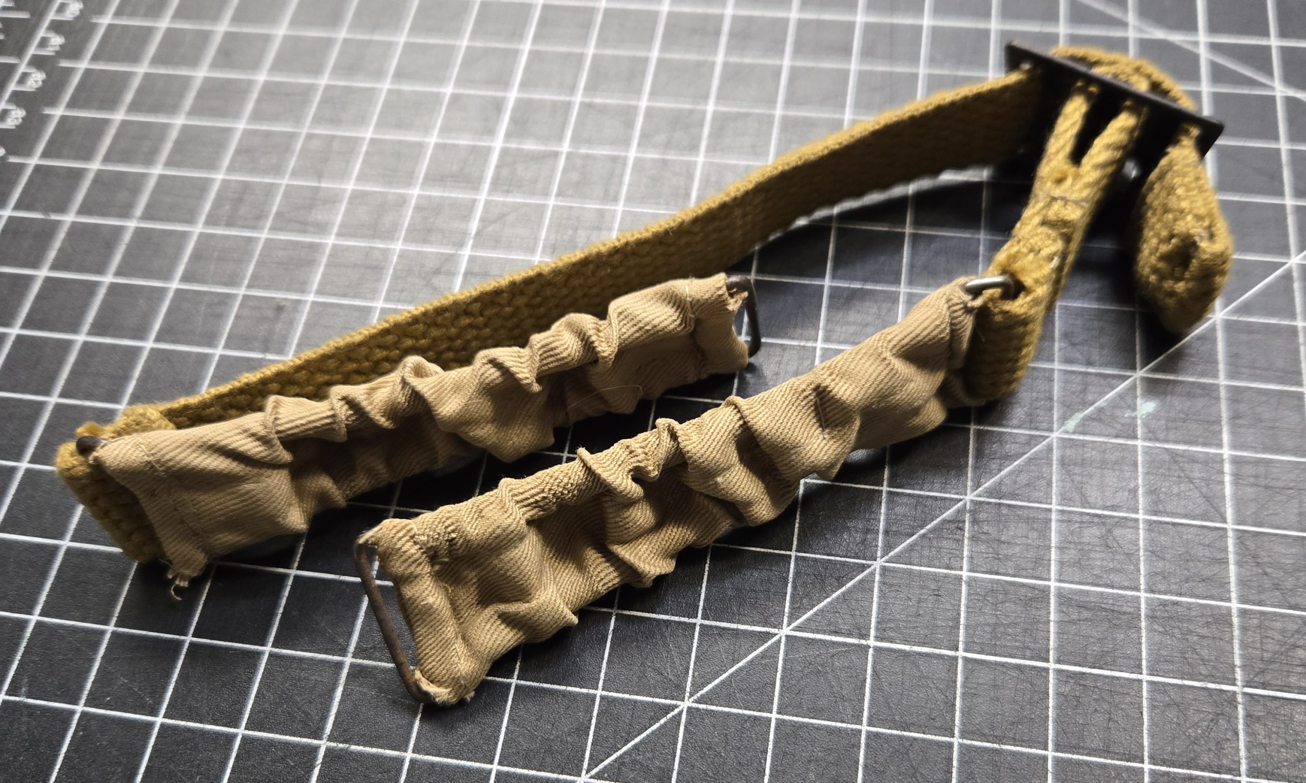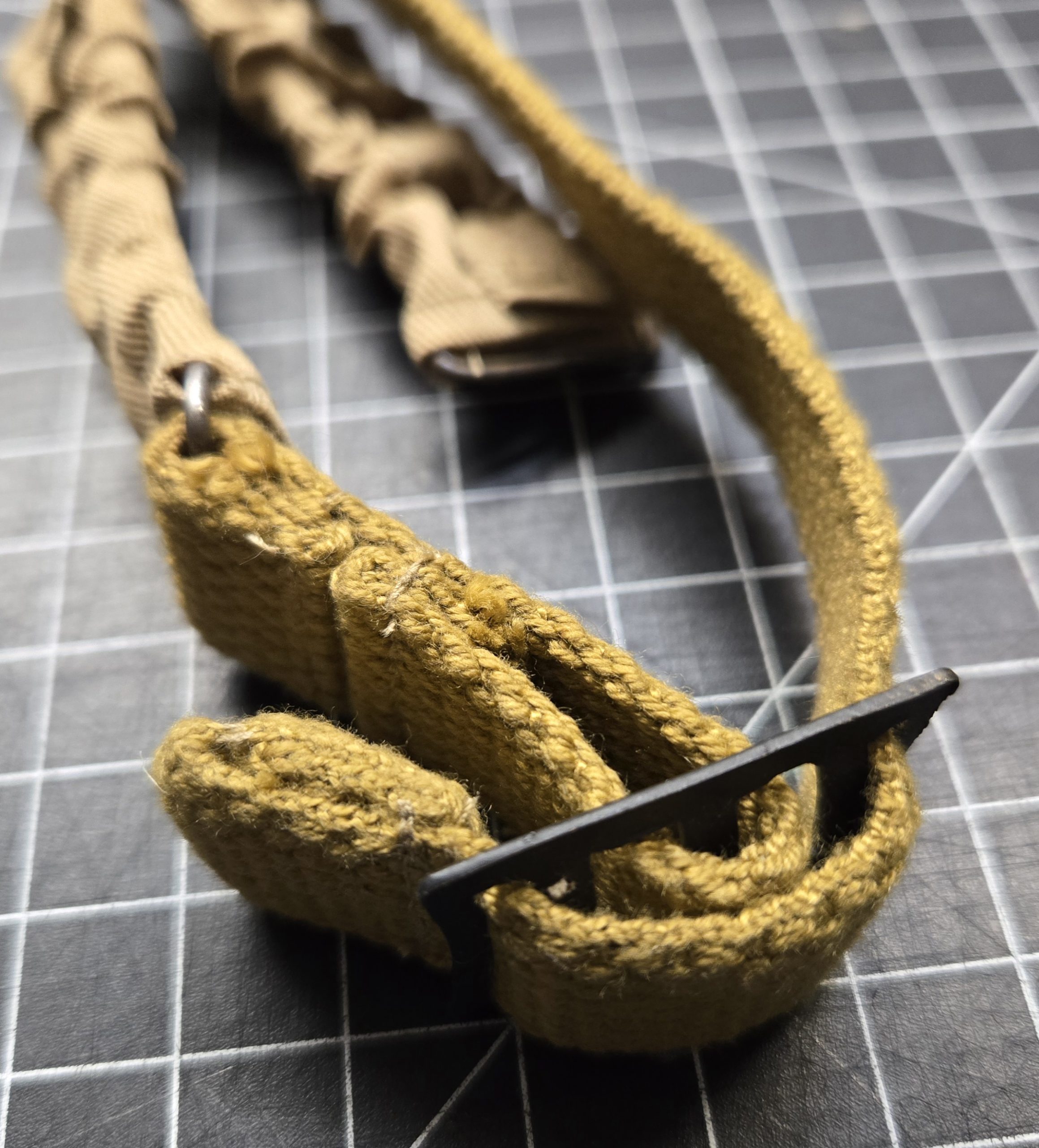 Reproduction British WWII helmet chin strap in correct webbing pattern with elastic section and blackened hardware. Came with a helmet kit and was never installed. Clean, unused condition with no field wear. Suitable for restoration work, reenacting, or replacing a missing strap on a Mk II or similar British steel helmet.