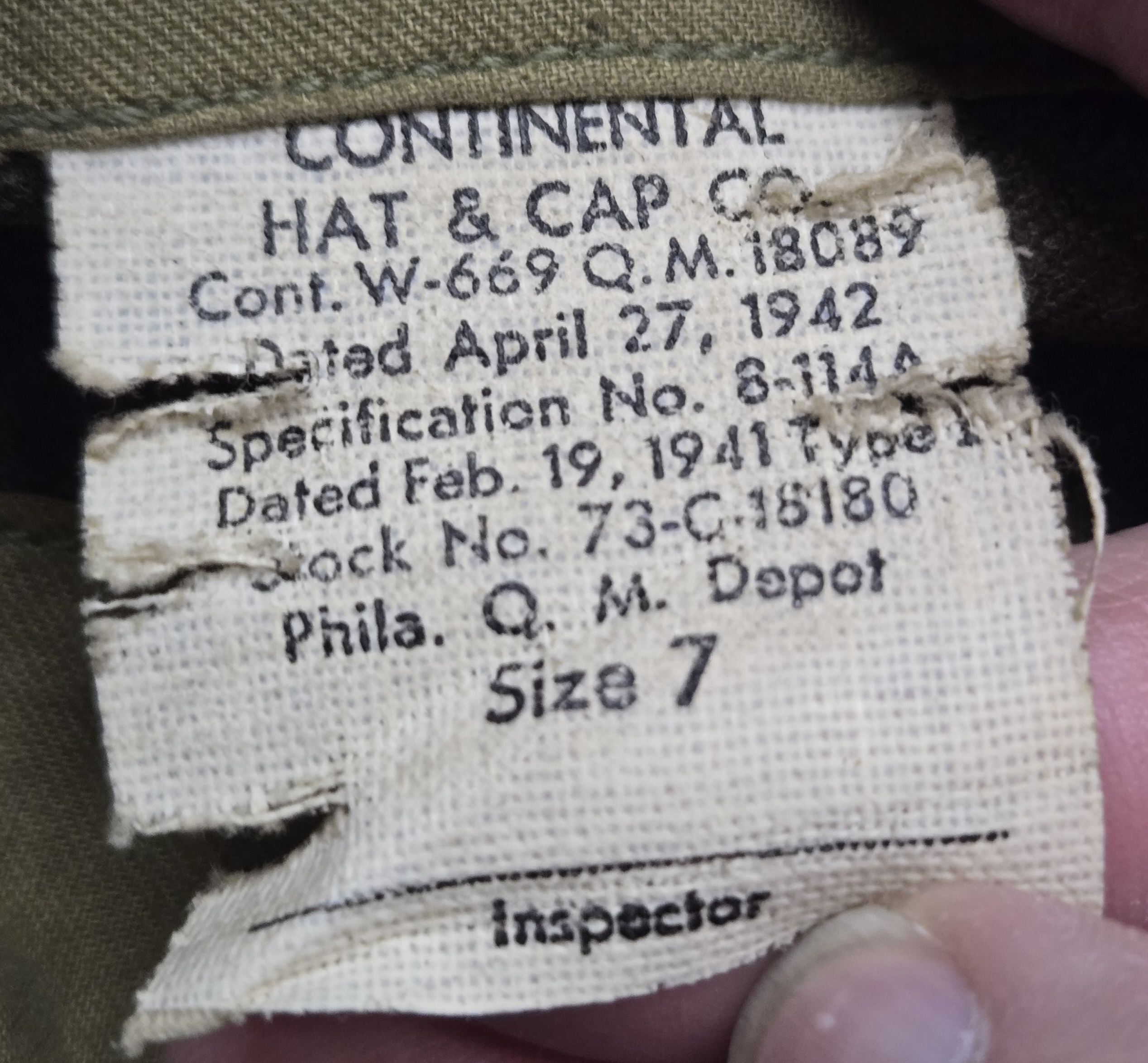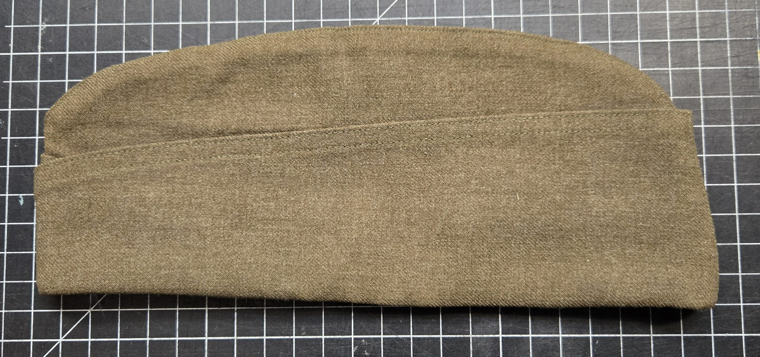 Original World War II U.S. Army garrison cap with no branch piping, typical enlisted issue, dated April 27, 1942 on the interior contract tag from Continental Hat & Cap Co. Size 7. This one has clearly seen service and has that honest, worn look without being abused. The wool body still holds its shape well, with expected light soiling and age toning throughout. Interior shows use but remains intact, with readable tag and solid stitching. There is a small moth bite near the edge, shown in photos, but nothing that detracts from overall display or use in the field. A good, straight example for reenactors or living history where a mint piece would look out of place. This is the kind of cap that actually looks right with a field impression.