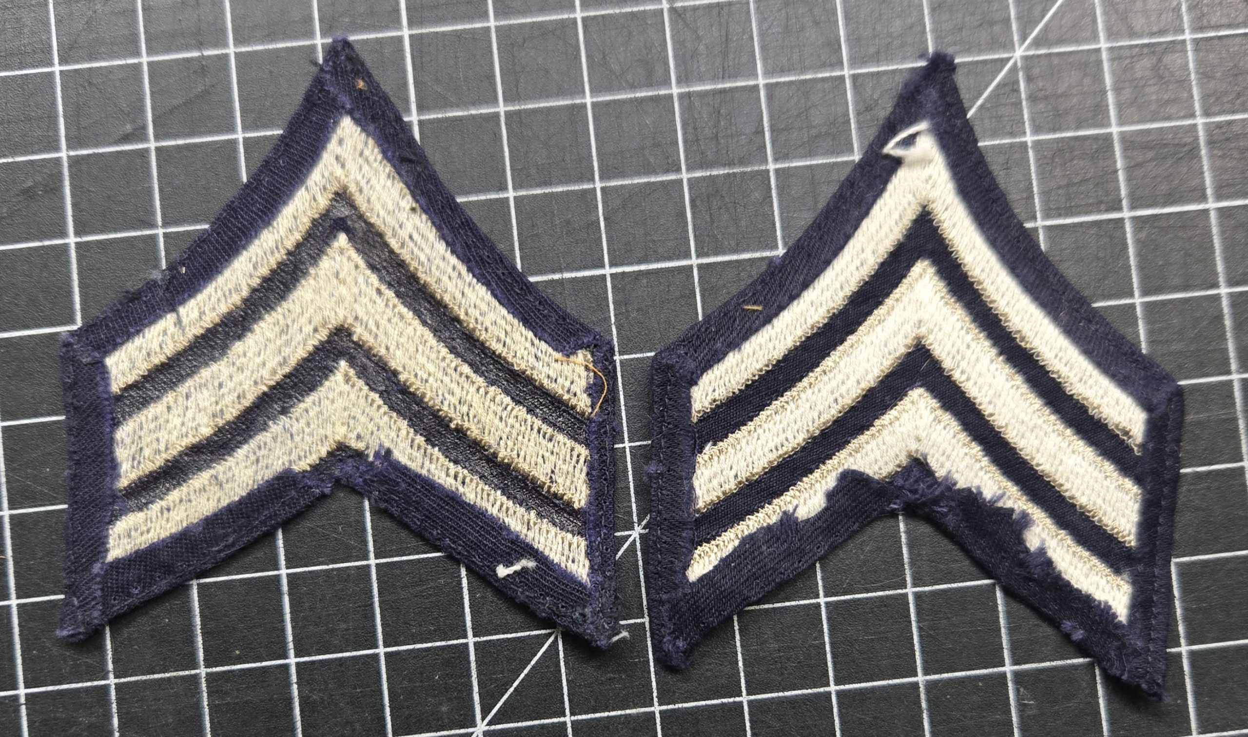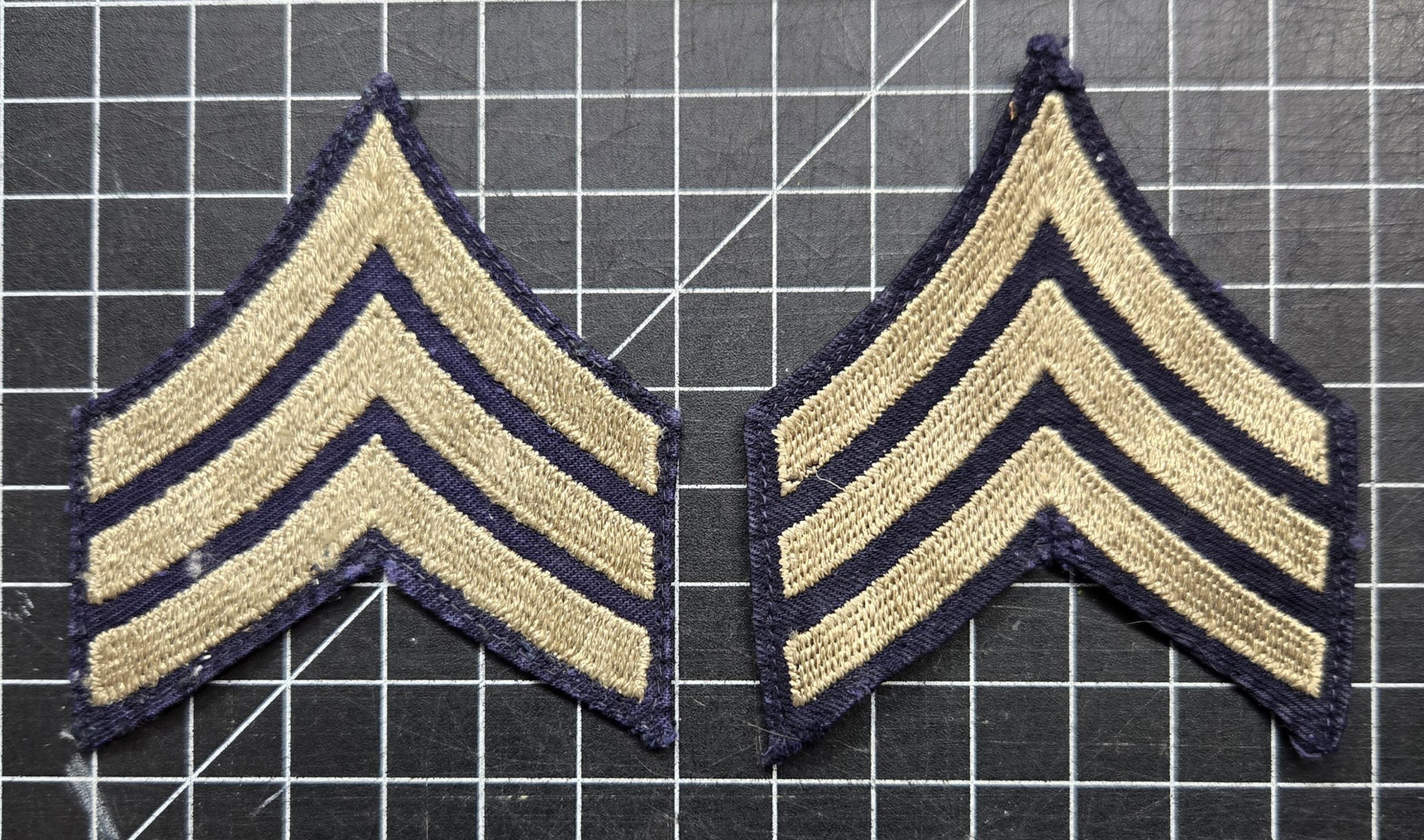 Original World War II U.S. Army sergeant chevrons in classic blue backing with khaki embroidered stripes, a matched pair showing honest wear from service but still in solid, displayable condition; stitching remains intact with good color contrast and no major damage, making these a strong example of wartime enlisted rank insignia suitable for restoration projects, uniforms, or collection, with the expected signs of age that give them the right look for a period-correct setup.