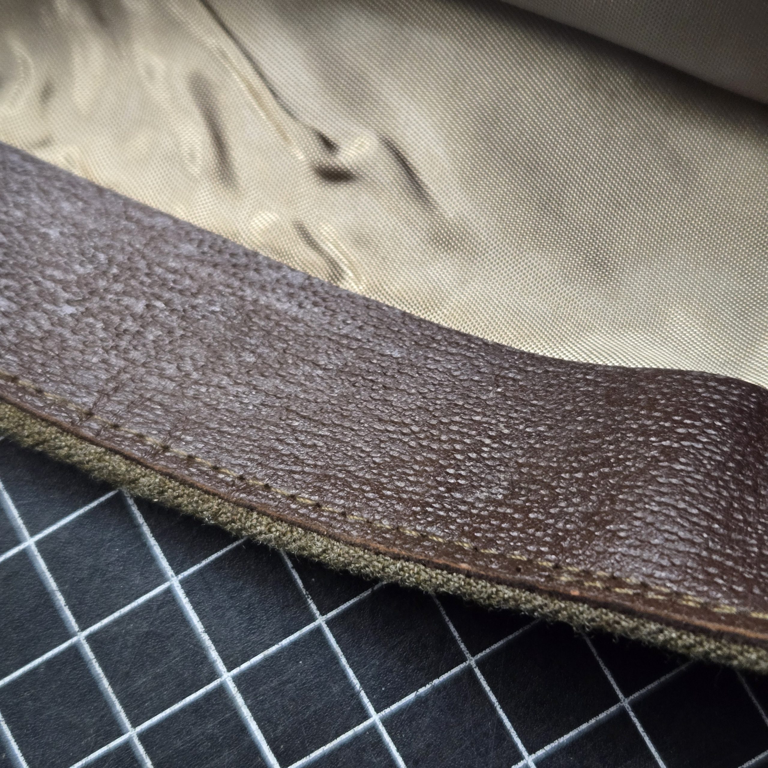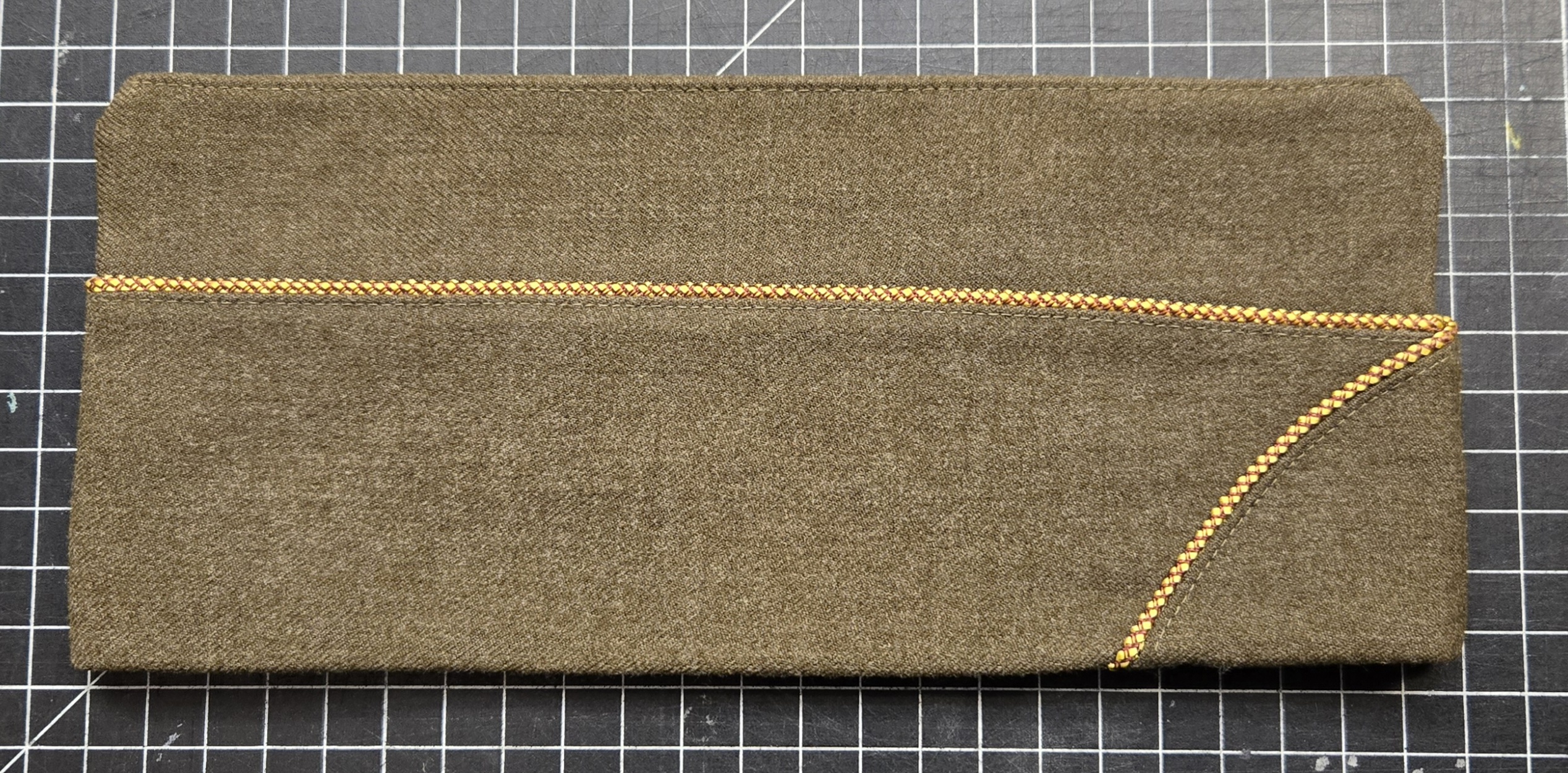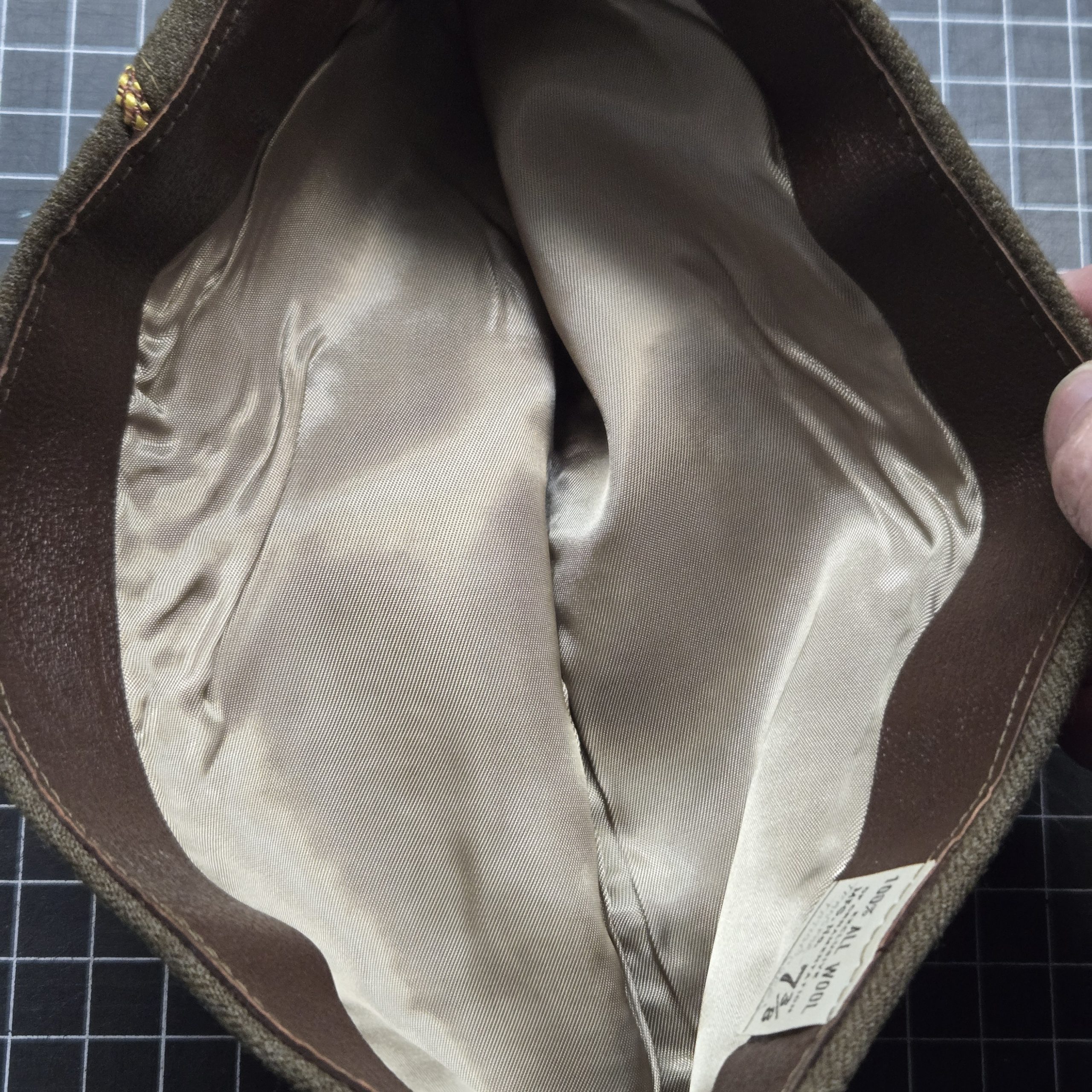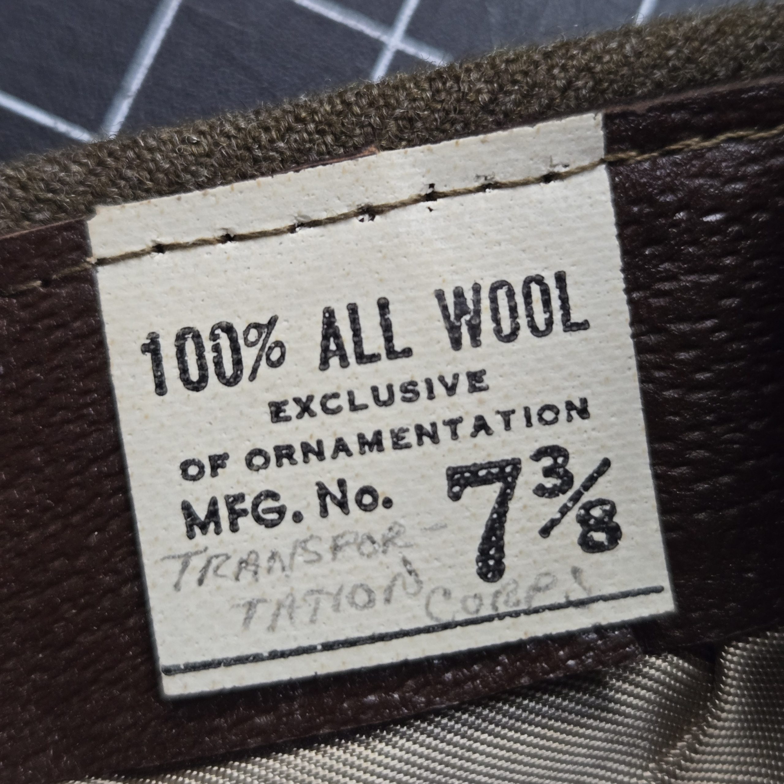 Original World War II U.S. Army garrison cap with Transportation Corps branch piping in brick red and golden yellow. The interior size tag is marked 7 3/8, and there is period pencil notation identifying it as Transportation Corps. This cap is in outstanding mint, likely unissued condition, with crisp 100% wool body, bright piping, clean leather sweatband, and a sharp satin liner that still has excellent original sheen. It presents beautifully, with strong shape and none of the wear usually seen on caps that actually made it into regular service. A superb example for a collector, mannequin display, or anyone putting together a top-shelf WWII grouping.