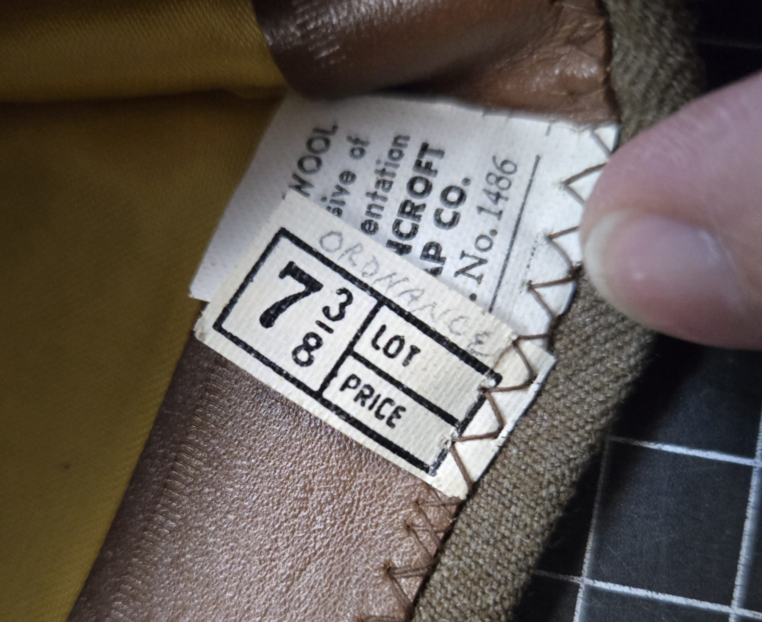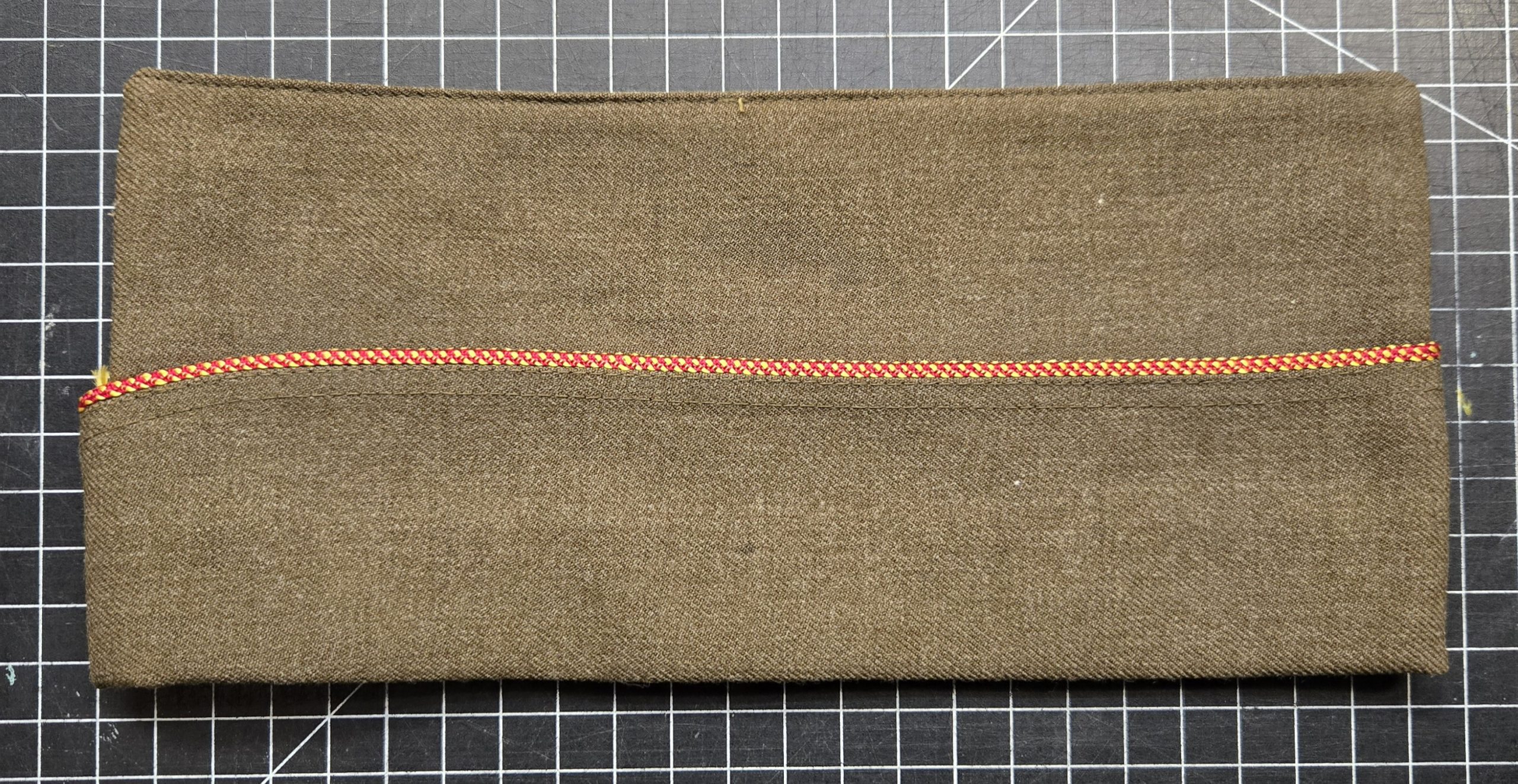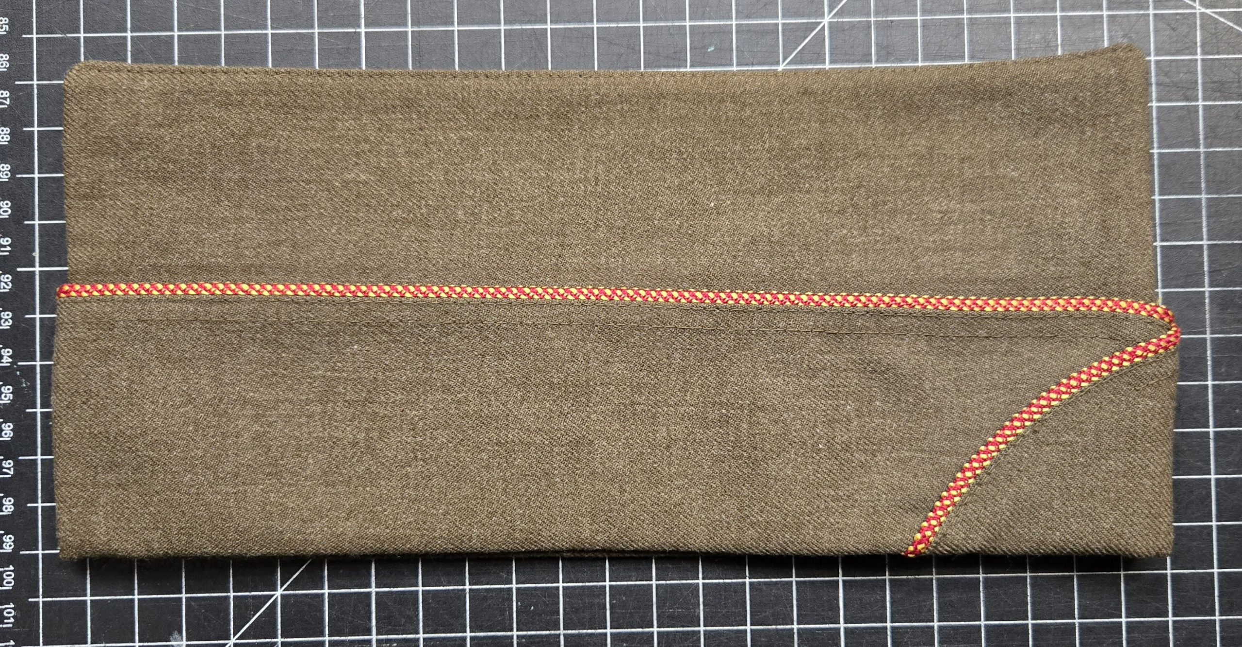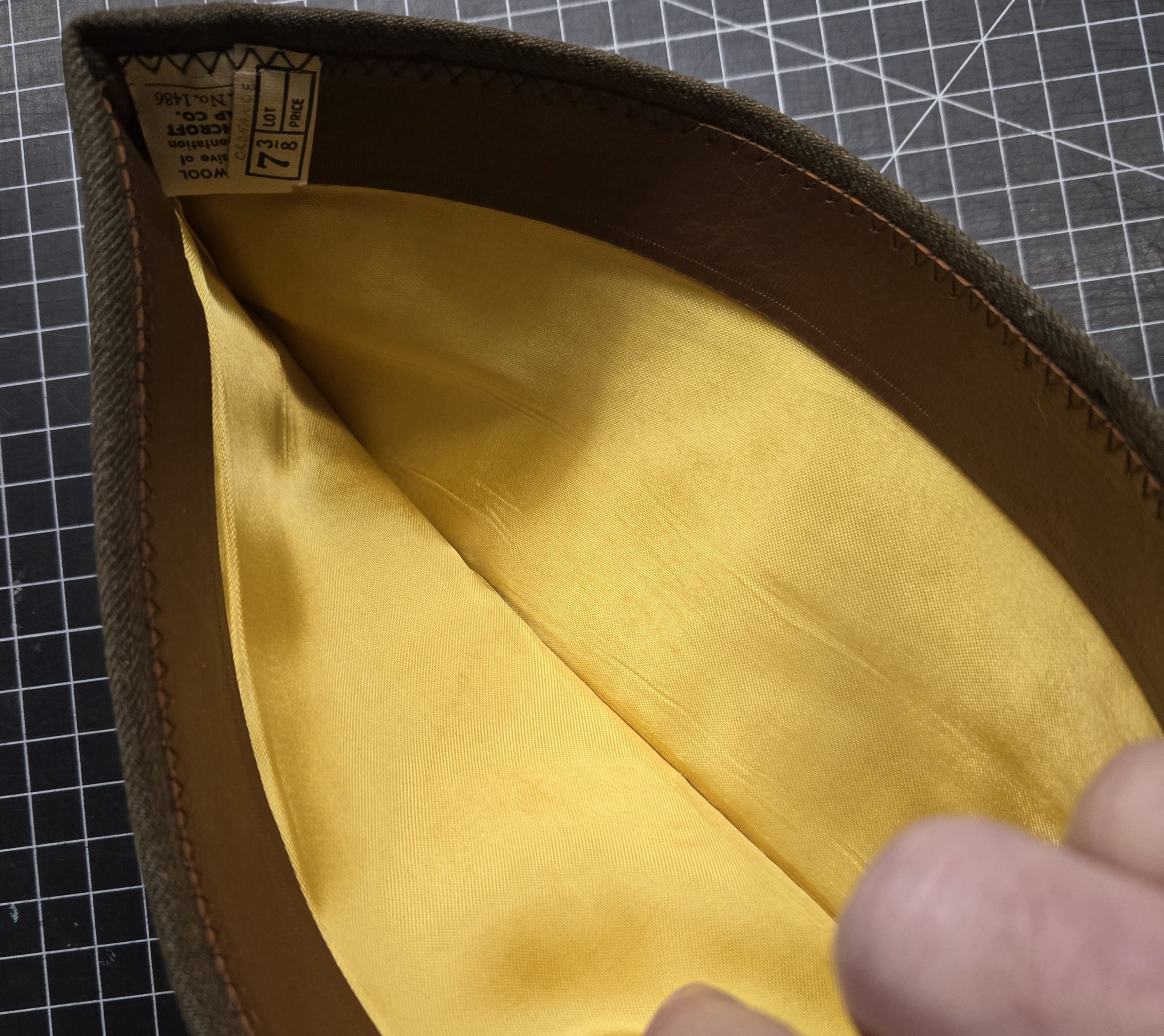 Original World War II U.S. Army garrison cap with red and yellow piping, consistent with Ordnance Corps, and marked as such in pencil on the interior tag. This is a Bancroft Cap Company example, a well-known quality maker, and it shows. Size is 7 3/8. Condition is about as good as it gets for an 80+ year old piece, essentially mint and likely unissued, with sharp lines, strong structure, and a clean, crisp crown seam that gives it a great profile when worn or displayed. The interior liner still has its original sheen and the leather sweatband remains intact and supple. No moth damage, no staining, no wear to speak of. This is a top-tier example, ideal for a serious collector, mannequin display, or a high-end impression where condition matters.