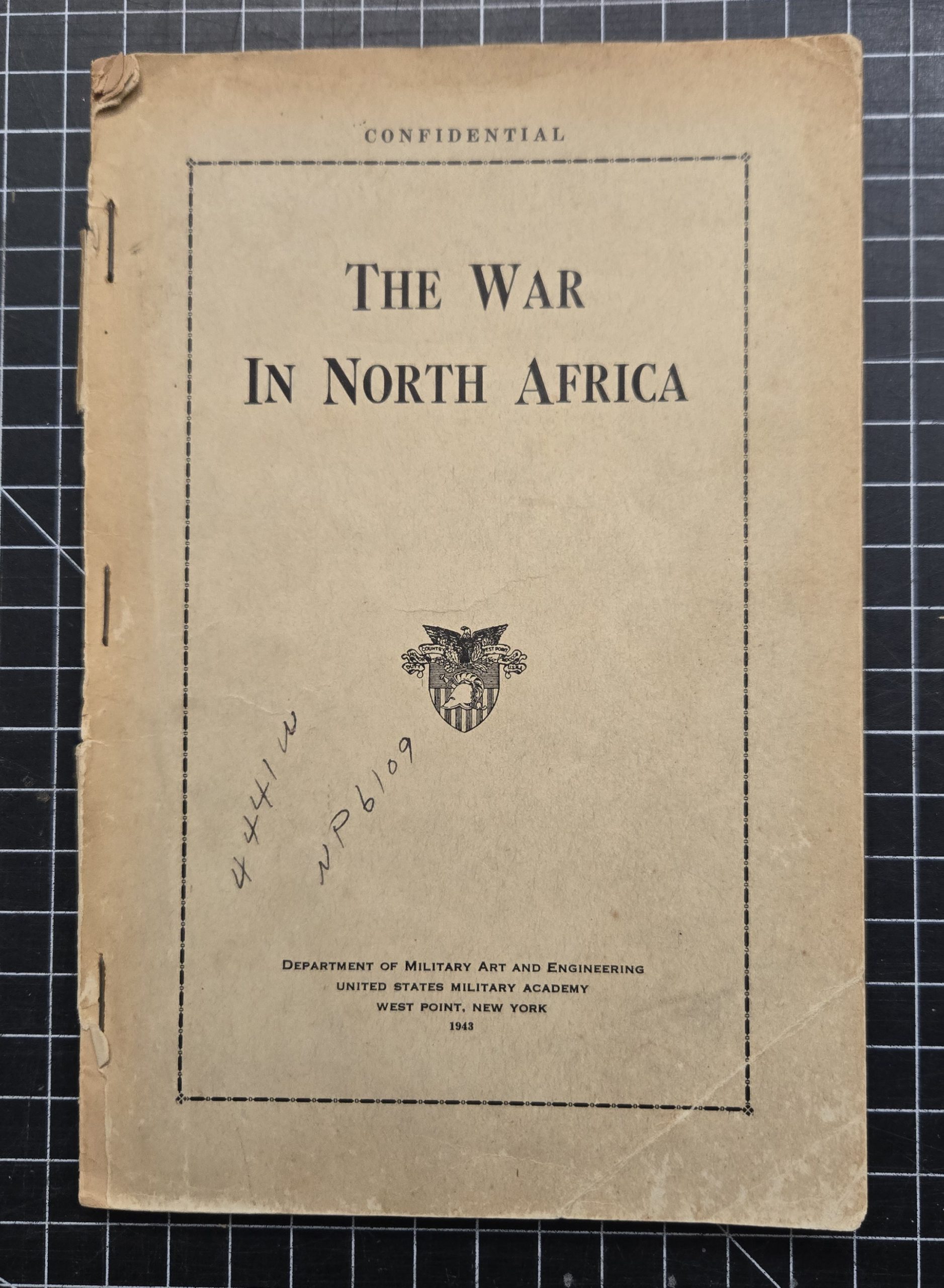 Original 1943 West Point instructional publication titled The War in North Africa, issued by the Department of Military Art and Engineering. Marked Confidential. Staple-bound format with approximately 92 pages and accompanying maps. Period instructional material covering the North African campaign as taught at the U.S. Military Academy during WWII.